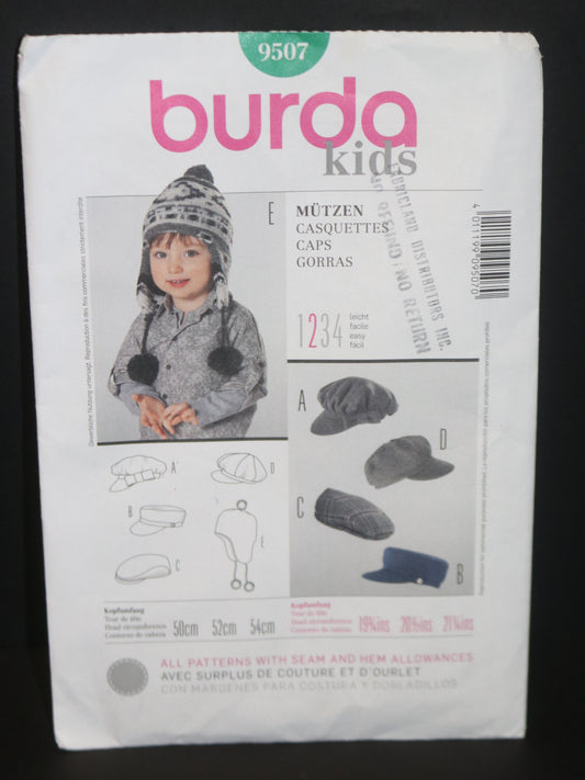 Burda 9507 Kids Caps Sewing Pattern - UNCUT