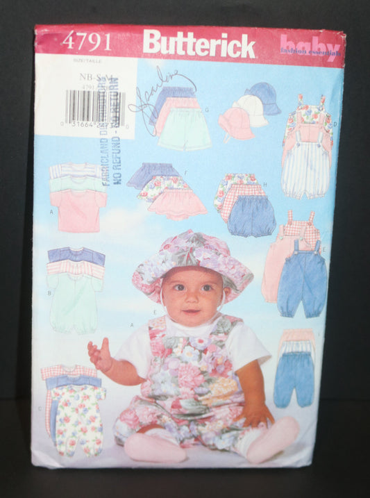 Butterick 4791 Infants T shirt Romper Jumpsuit Skirt Shorts Pants and Hat Sewing Pattern - UNCUT - Size NB S M