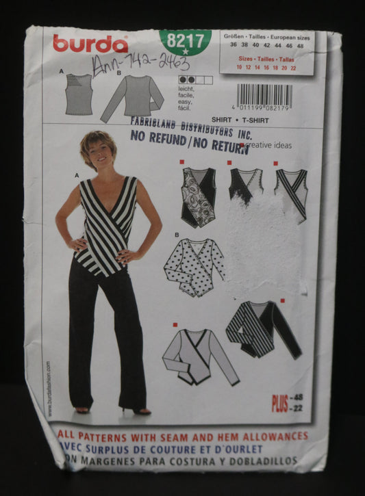 Burda 8217 Misses T Shirt Sewing Pattern - UNCUT - Size 10 12 14 16 18 20 22