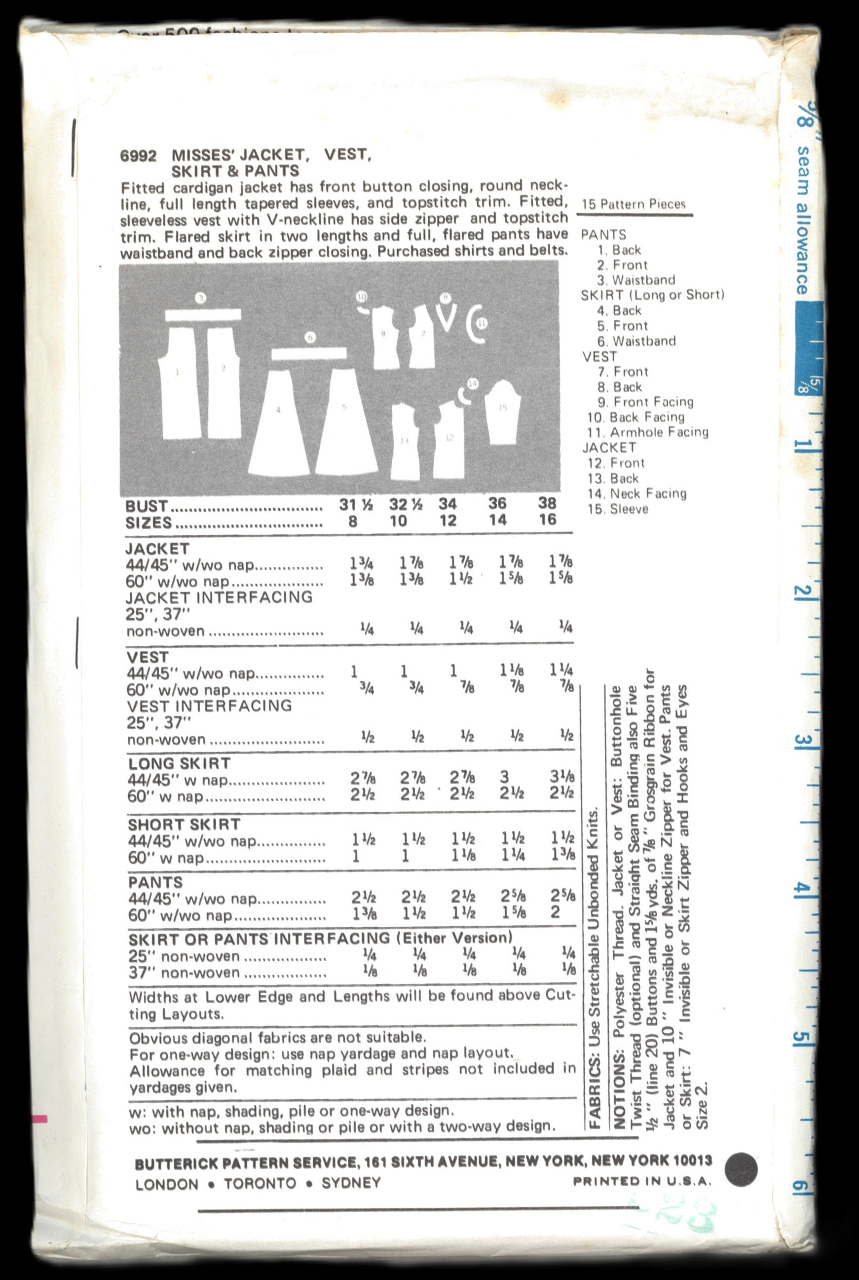 70s Butterick 6992 Misses Jacket Vest Skirt and Pants Sewing Pattern