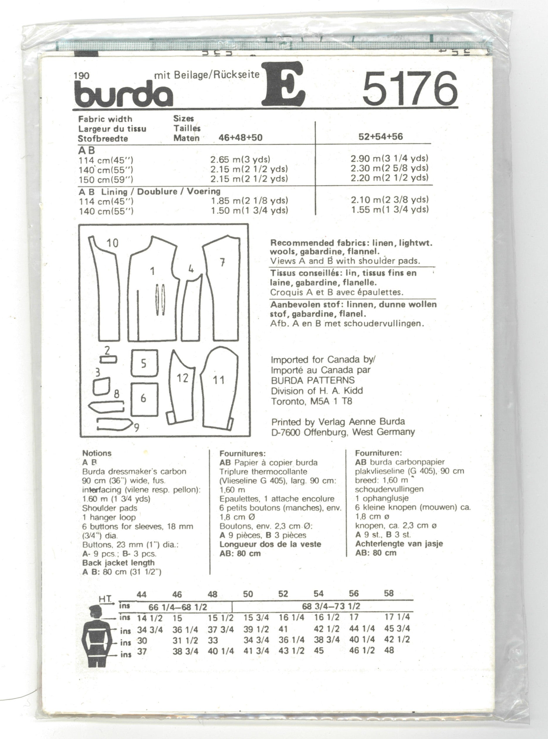 Burda 5176 Mens Blazer Sewing Pattern - UNCUT Size 36 - 46