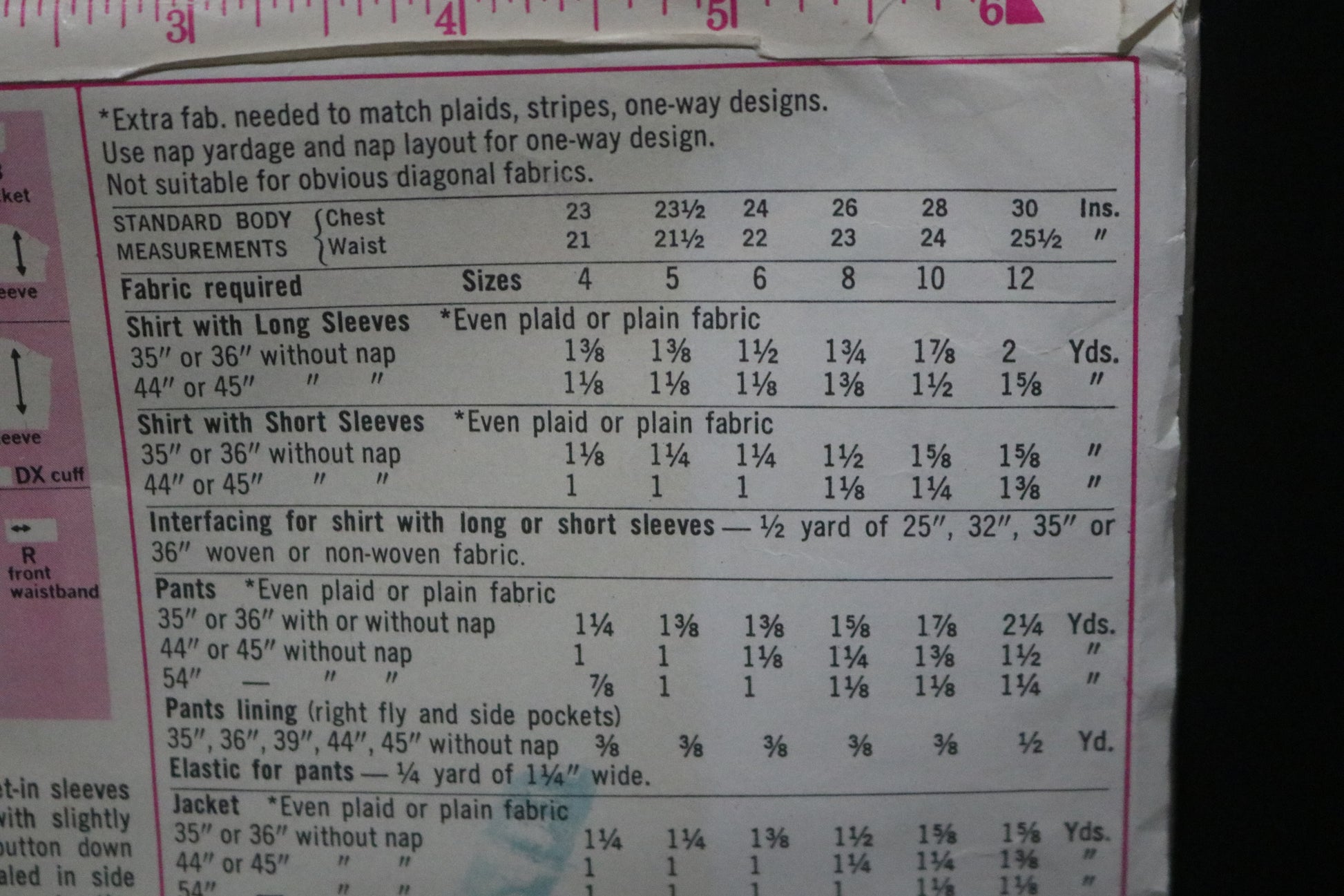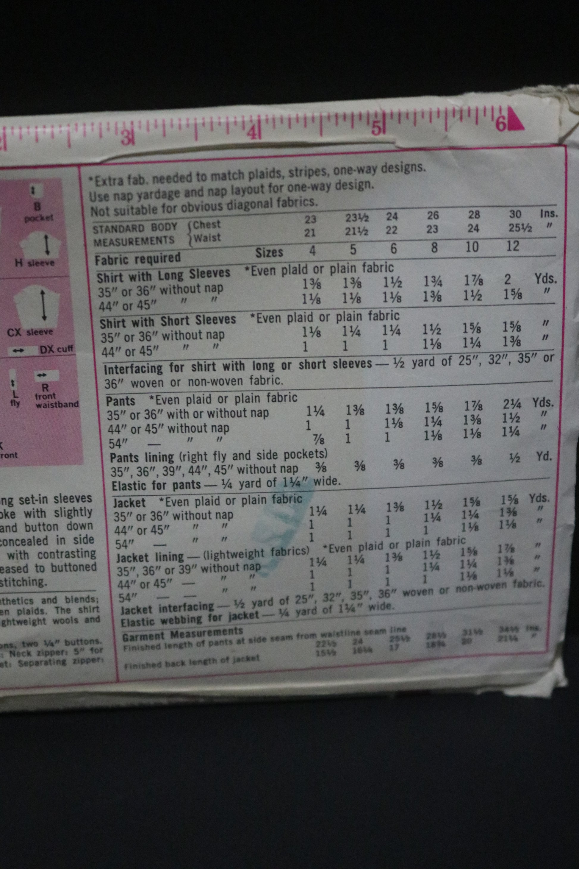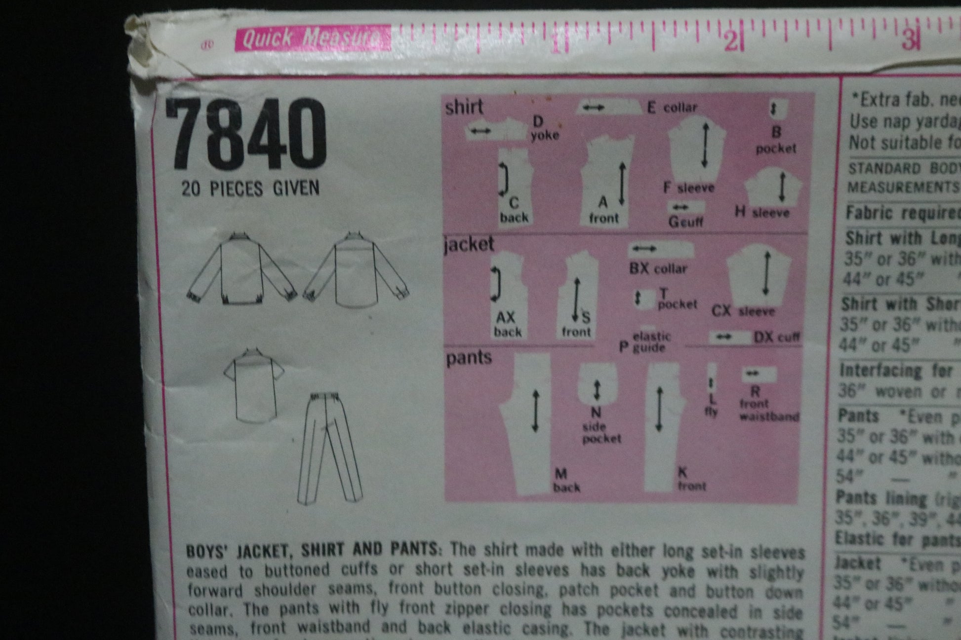 The shirt made with either long set-in sleeves eased to buttoned cuffs or short set-in sleeves has back yoke with slightly forward shoulder seams, front button closing, patch pocket and button down collar. The pants with fly front zipper closing has pockets concealed in side seams, front waistband and back elastic casing. The jacket with contrasting lining has front separating zipper, collar, long set-in sleeves eased to buttoned cuffs, patch pockets, elastic encased at lower edge and top-stitching.