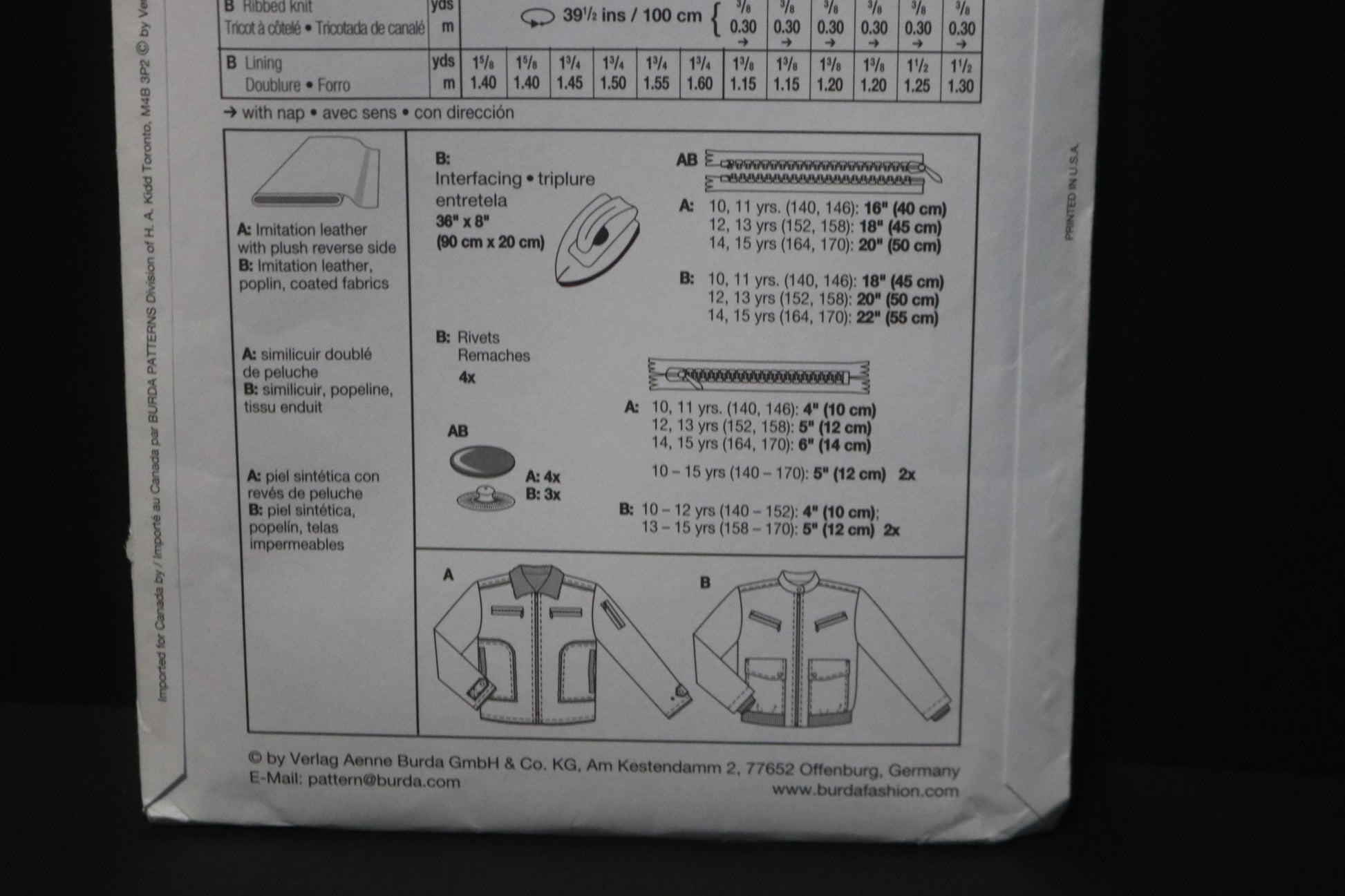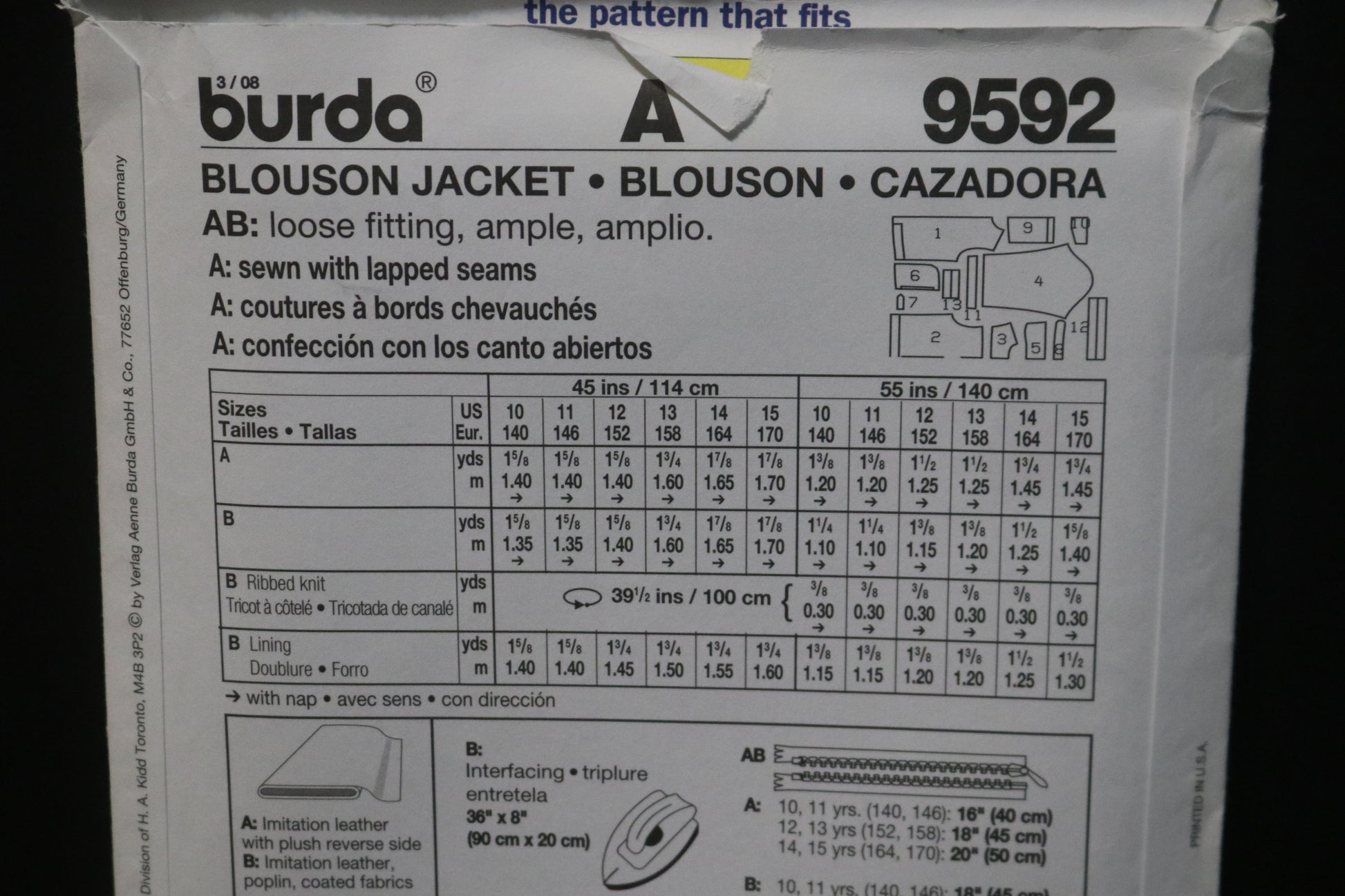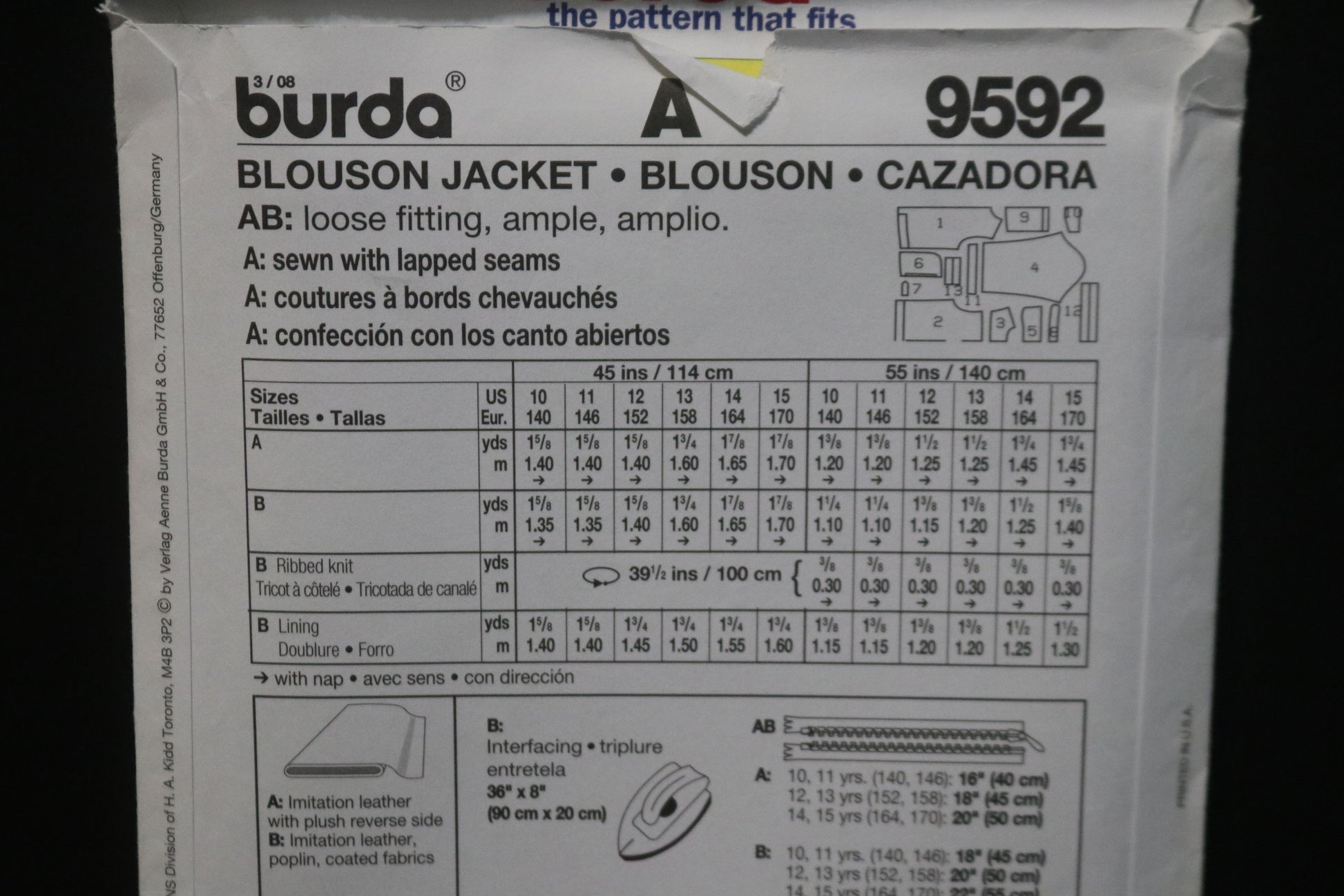 Burda 9592 Boys Teens Blouson Jacket Sewing Pattern UNCUT Size 10 11 12 14 15