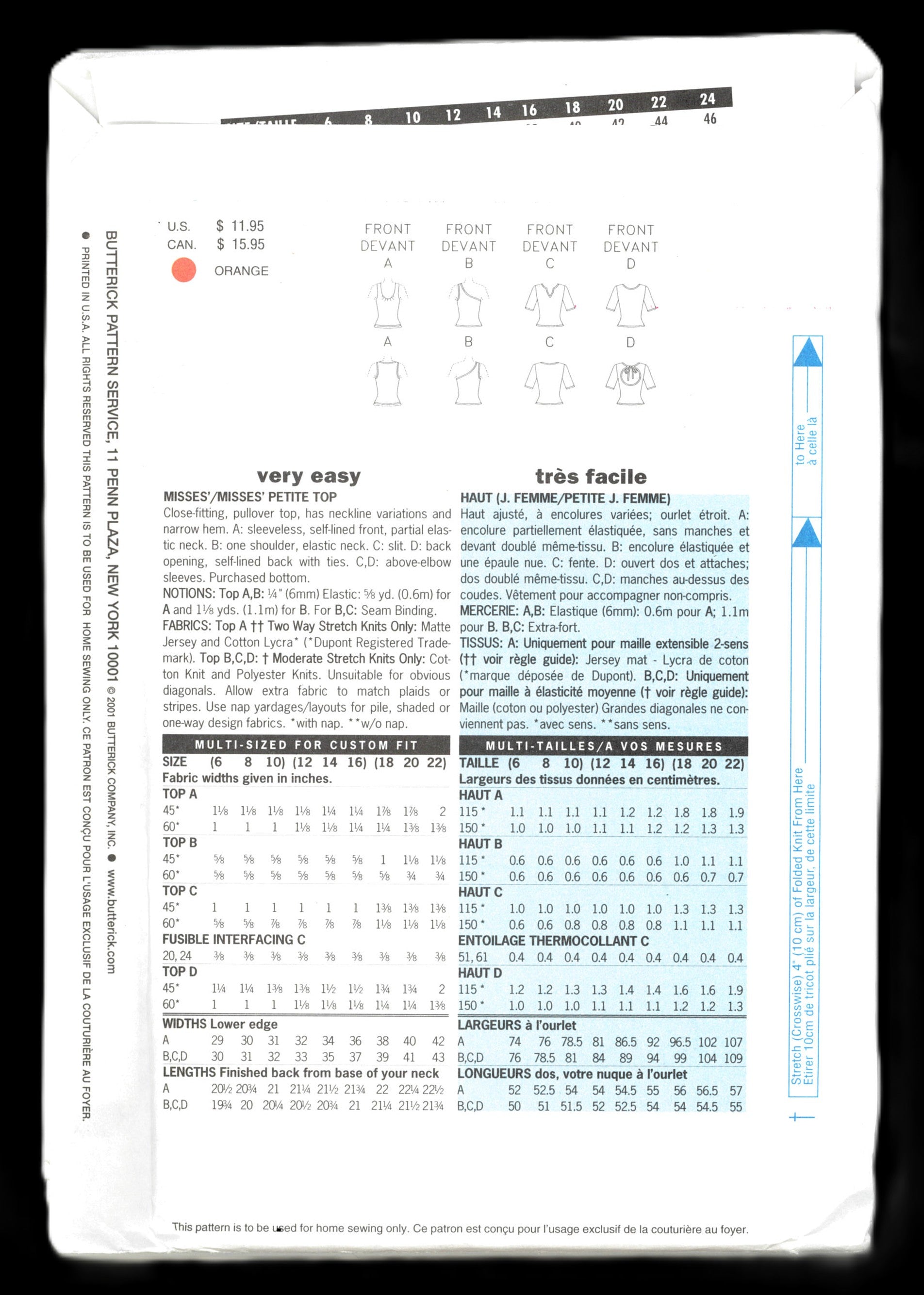 Close fitting, pullover top has neckline variations and narrow hem. A: sleeveless, selflined front, partial elastic neck. B: one shoulder, elastic neck> C: slit> D: back opening, self lined back with ties. C,D: above elbow sleeves. Purchased bottom.