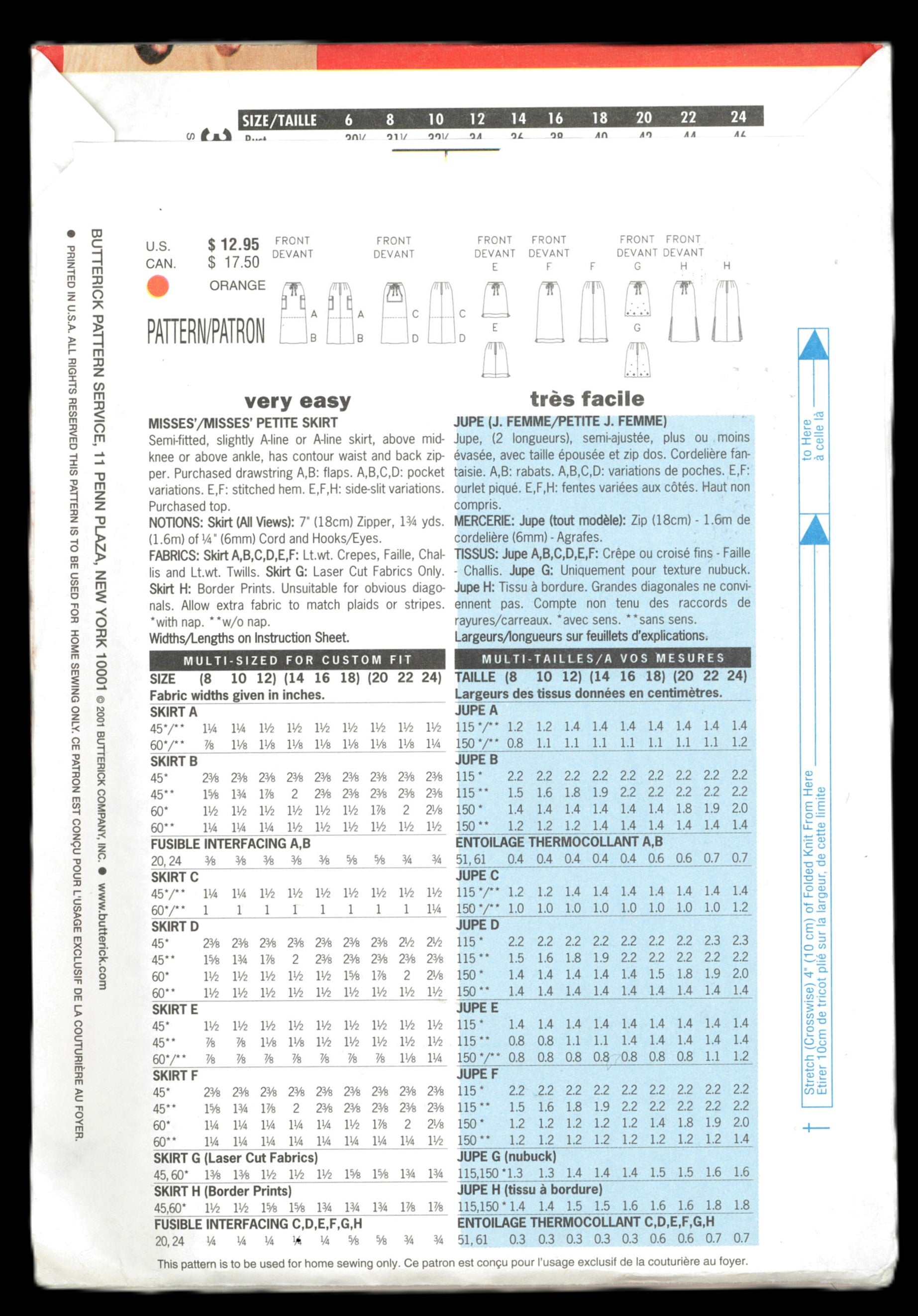 Suggested Fabrics: Skirt A, B, C, D, E, F: Lightweight Crepes, Faille, Challis, and Lightweight Twills. Skirt G: Laser Cut Fabrics Only. Skirt H: Border Prints. Unsuitable for obvious diagonals. Allow extra fabric to match plaids or strips.