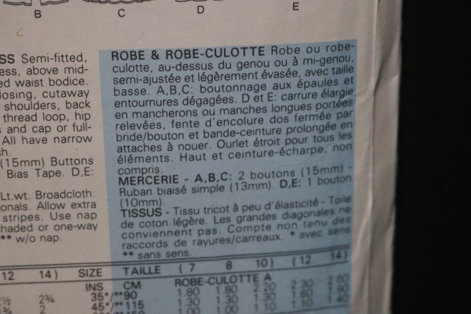 Semi fitted, slightly flared dress or pantdress, above midknee or mid-knee, has dropped waist bodice A,B,C; buttoned shoulder closing, cutaway armholes. D and E: dropped shoulders, back neckline slit with button and thread loop, hip band extending into tie ends and cap or full-length sleeves pushed up. All have narrow hem. Purchased top and sash.
