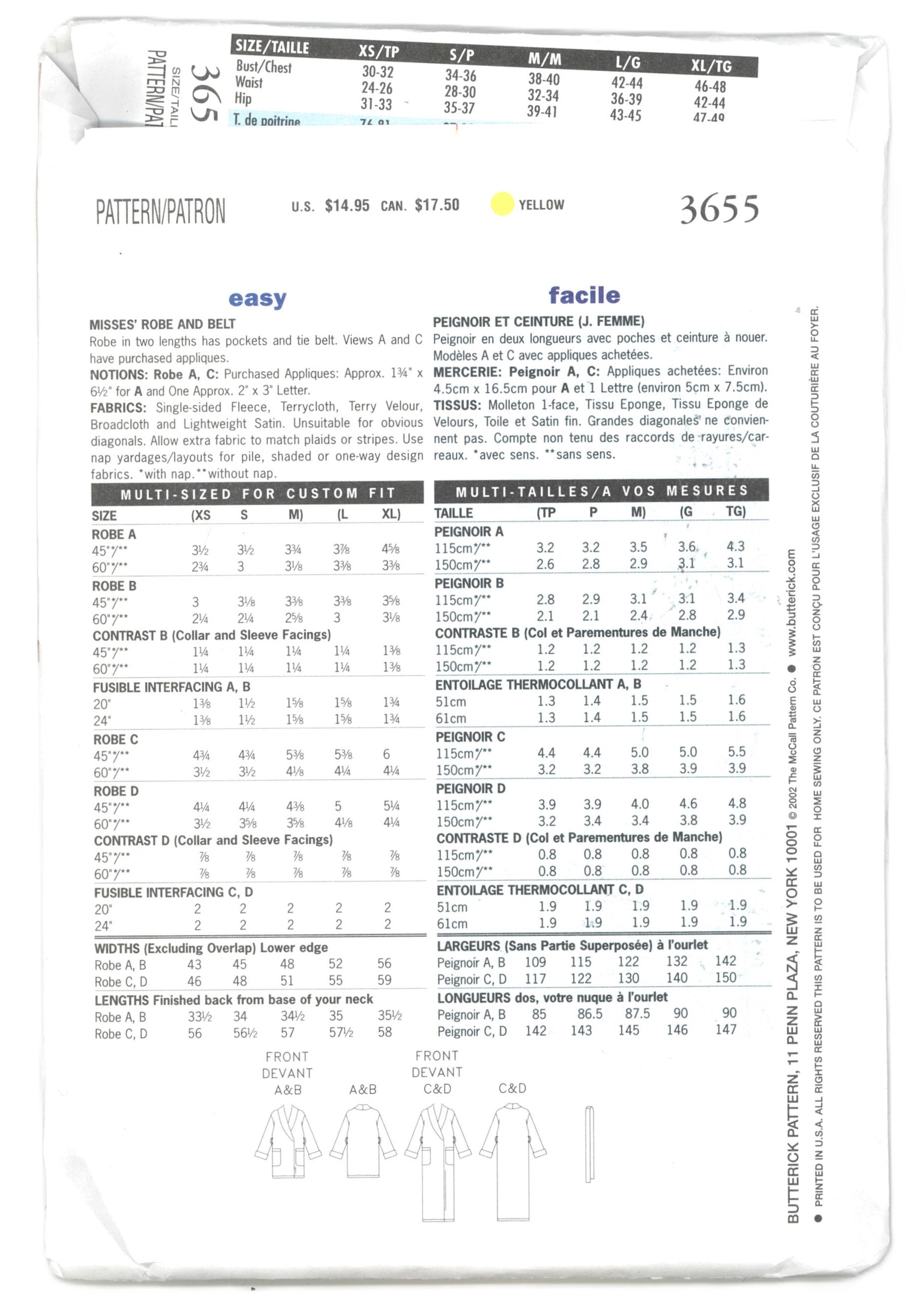 Butterick 3655 Misses Robe & Pants Sewing Pattern