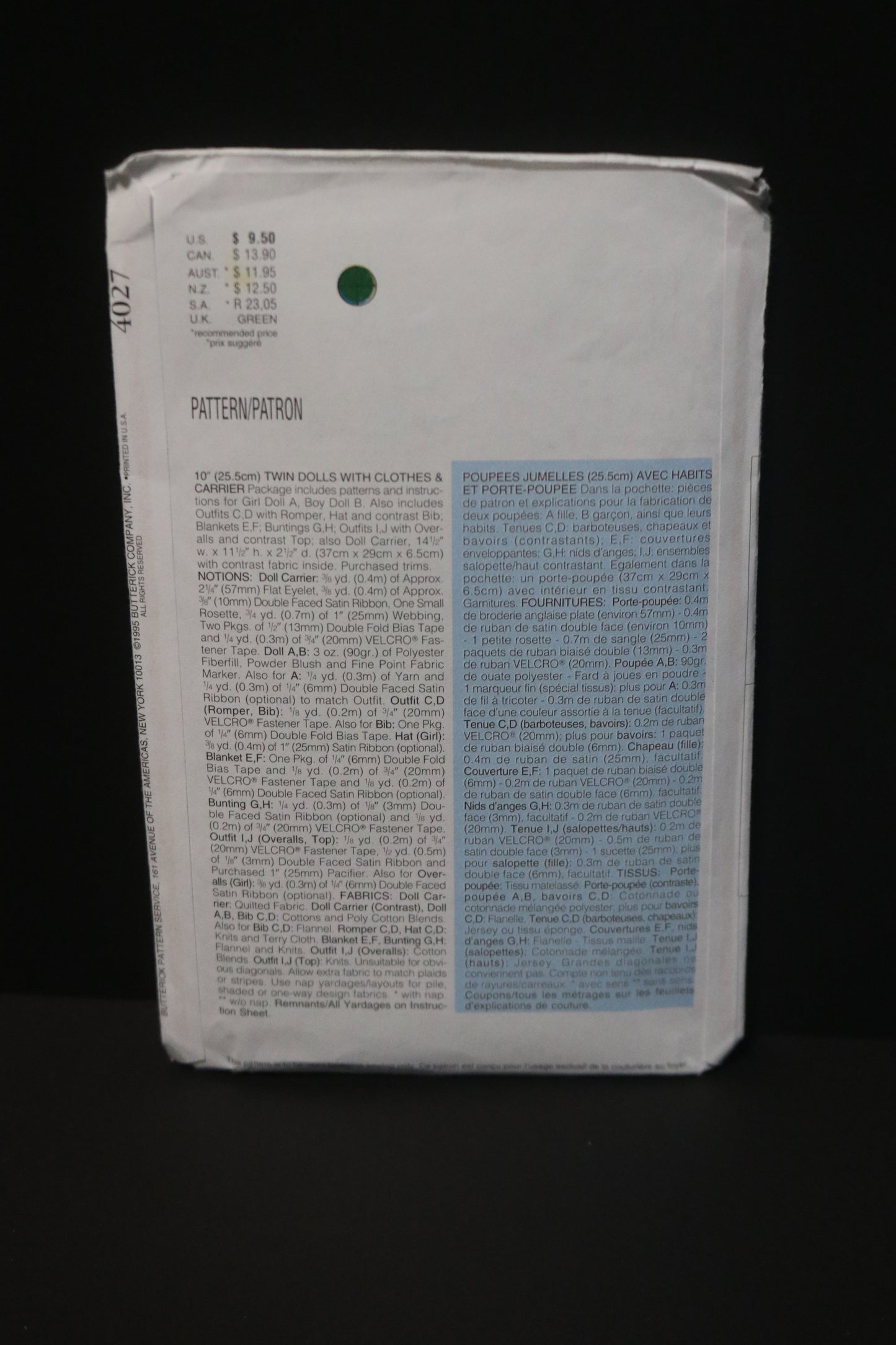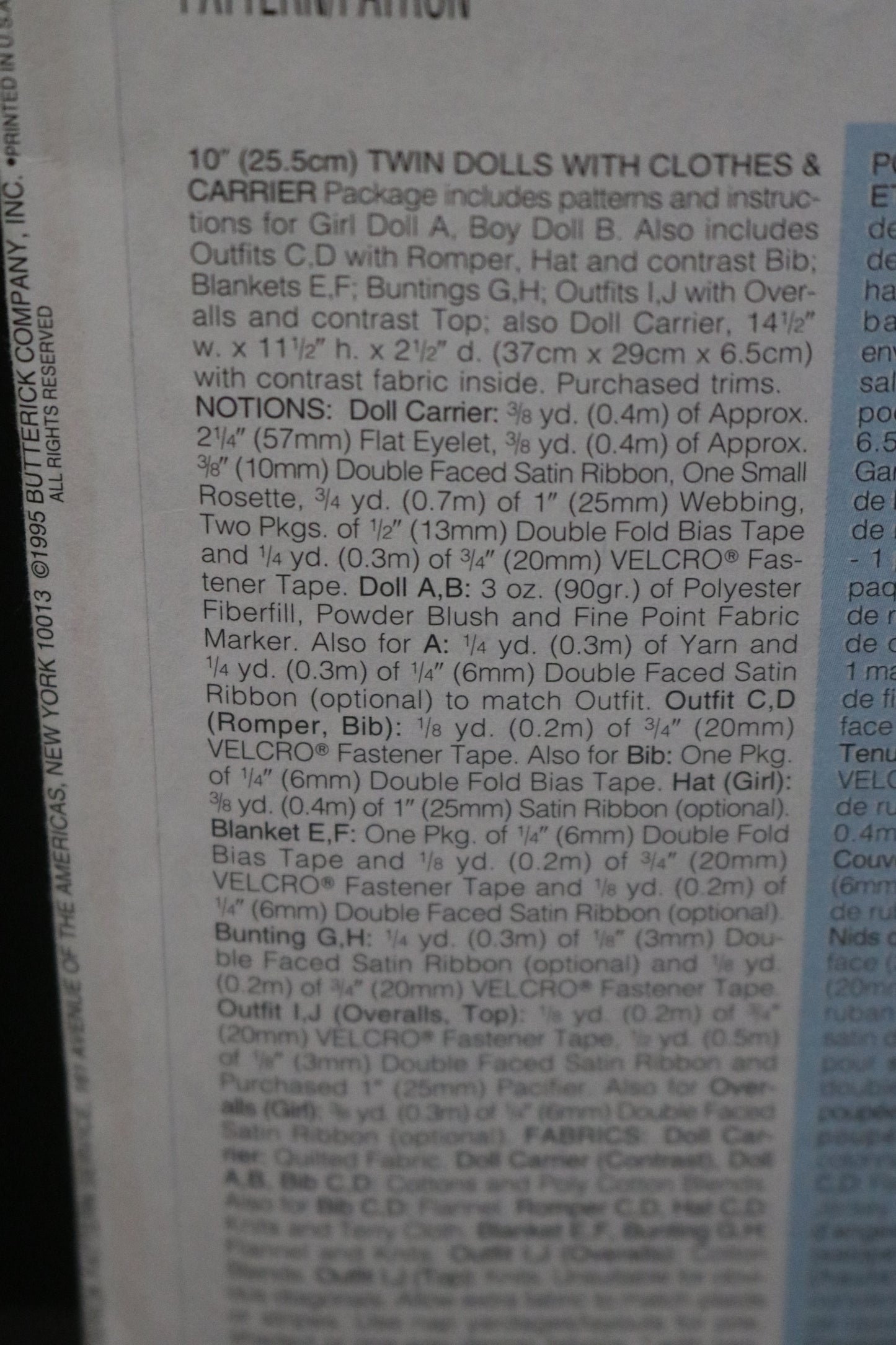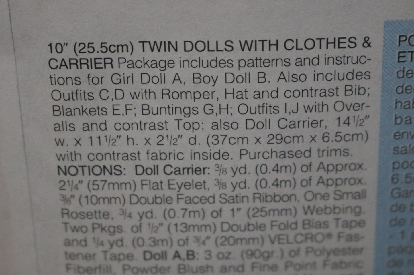 Butterick 4027 10" Twim Dolls with Clothes and Carrier Sewing Pattern UNCUT