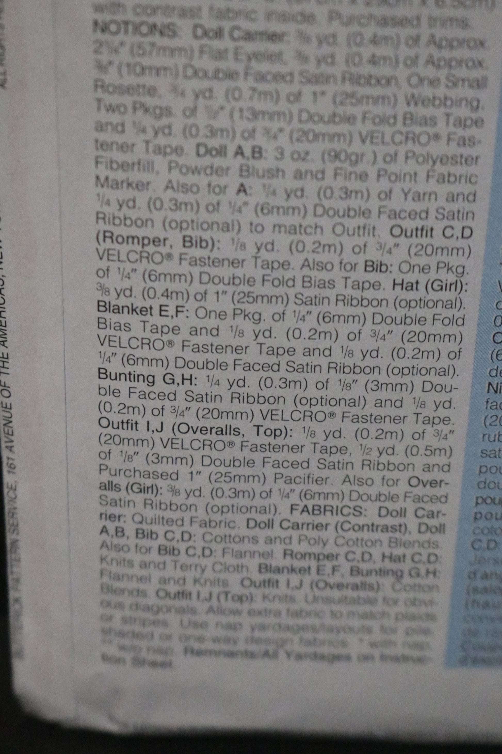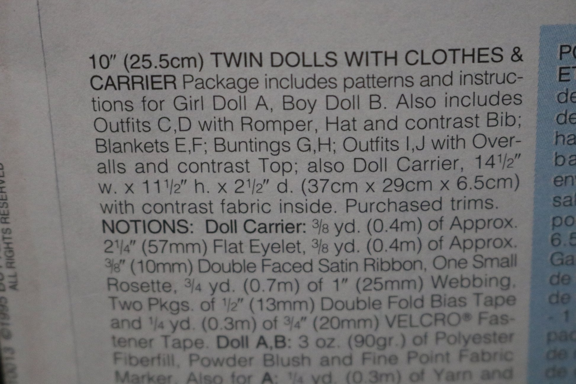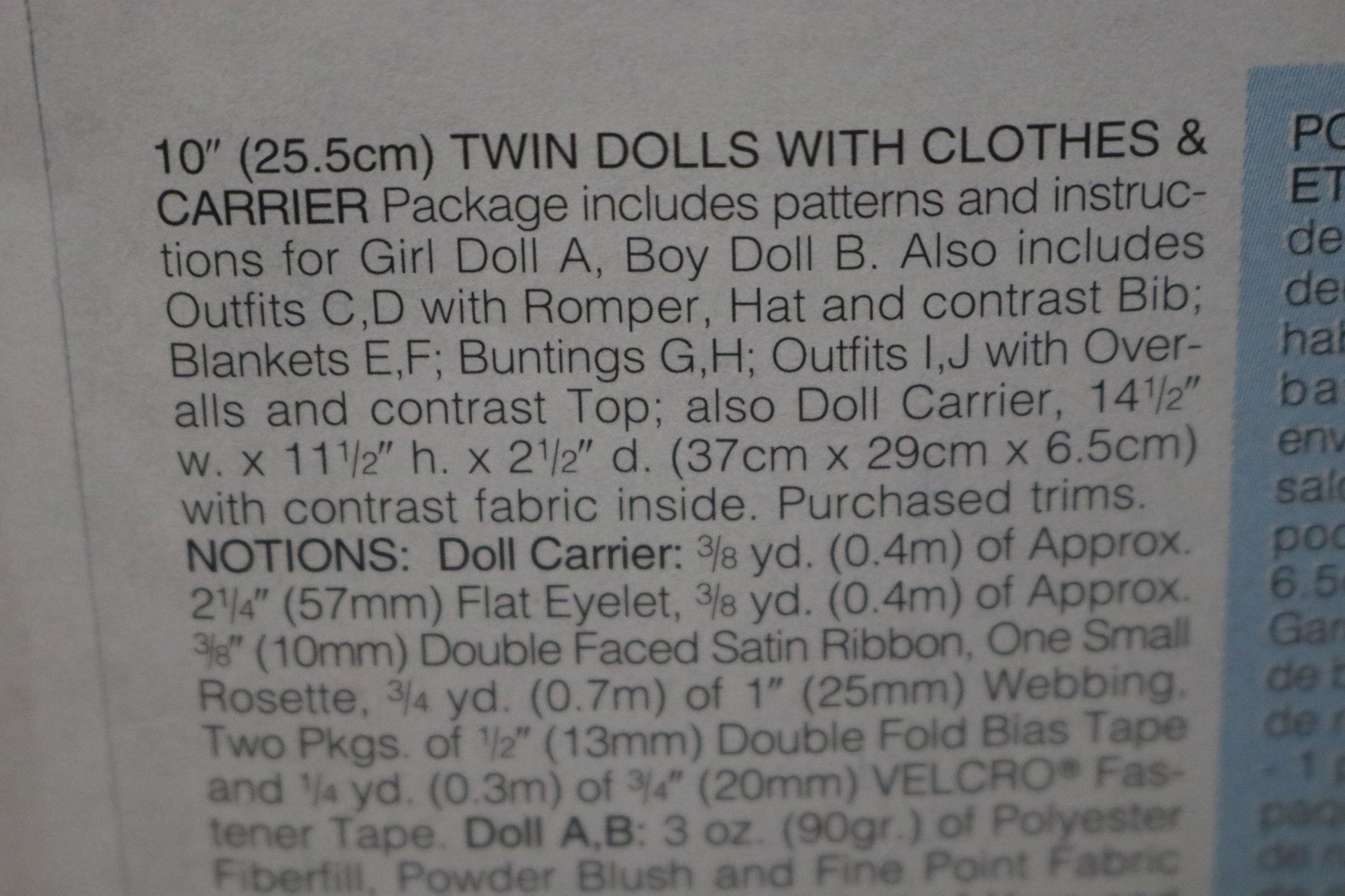 Package includes patterns and instructions for Girl Doll A; Boy Doll B: Also includes Outfits C,D with Romper, Hat and contrast Bib Blankets E,F; Buntings G;H; Outfits I,J with Overalls and contrast Top; also Doll Carrier. 14 1/2"w x 11 1/2" H x 2 1/2" D with contrast fabric inside. Purchased trims.