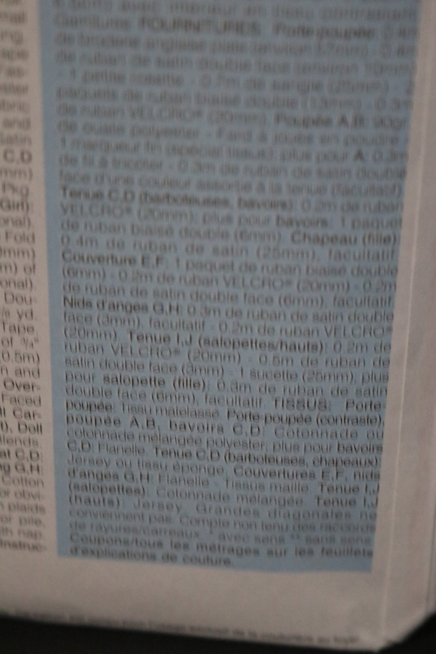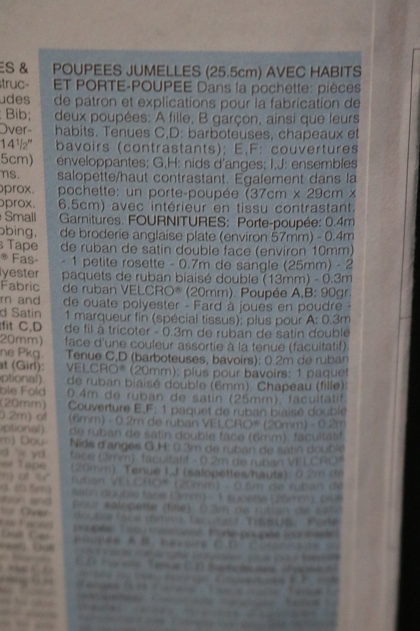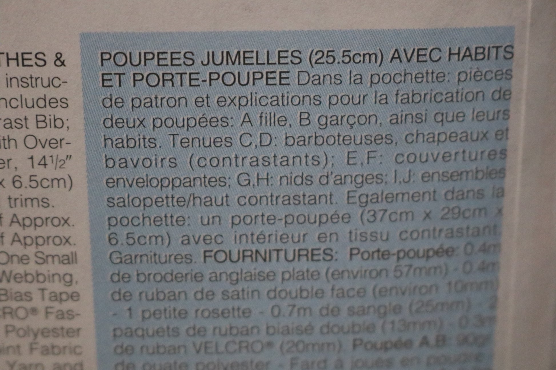 Package includes patterns and instructions for Girl Doll A; Boy Doll B: Also includes Outfits C,D with Romper, Hat and contrast Bib Blankets E,F; Buntings G;H; Outfits I,J with Overalls and contrast Top; also Doll Carrier. 14 1/2"w x 11 1/2" H x 2 1/2" D with contrast fabric inside. Purchased trims.