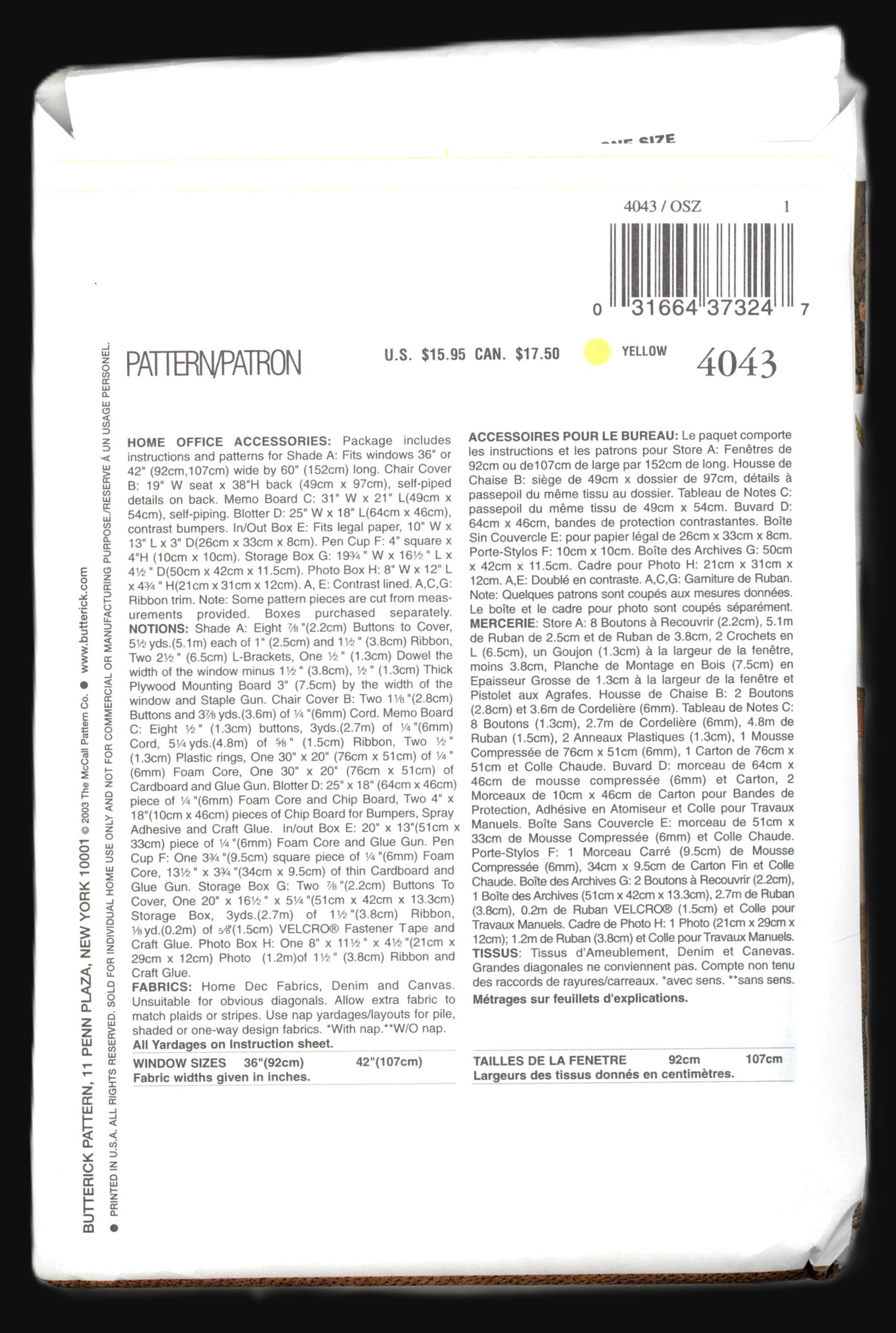 Package includes instructions and patterns for Shade A: Fits windows 36" or 42" (92cm, 107cm) wide by 60" (152cm) long. Chair Cover details on back. Memo Boards C: 31" WW x 21" L (49cm x 54cm), self piping, Blotter D: 25" W x 18" L(64cm x 46cm) contrast bumpers. In/Out Box E: Fits legal paper, 10" W x 13" L x 3" D (26cm x 33cm x 8cm ). Pen Cup F: 4" squaer x 4" H (10cm x 10cm ). Storage Box G; 19 3/4" W x 16 1/2" L x 4 1/2" D (50cm x42cm x 11.5cm) Photo Box H: 8"W x 12" L x 4 3/4" H (21cm x 31cm x 12cm ) A, E Contrast lined A,C, G: Ribbon trim. Note: Some pattern pieces are cut from measurements provided. Boxes purchased Seperately.