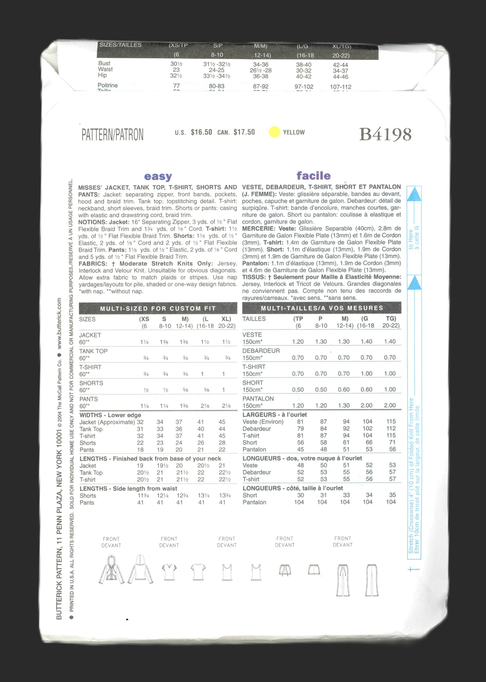 Butterick 4198 Misses Jacket Tank Top T Shirt Shorts and Pants Sewing Pattern UNCUT Size XS S M