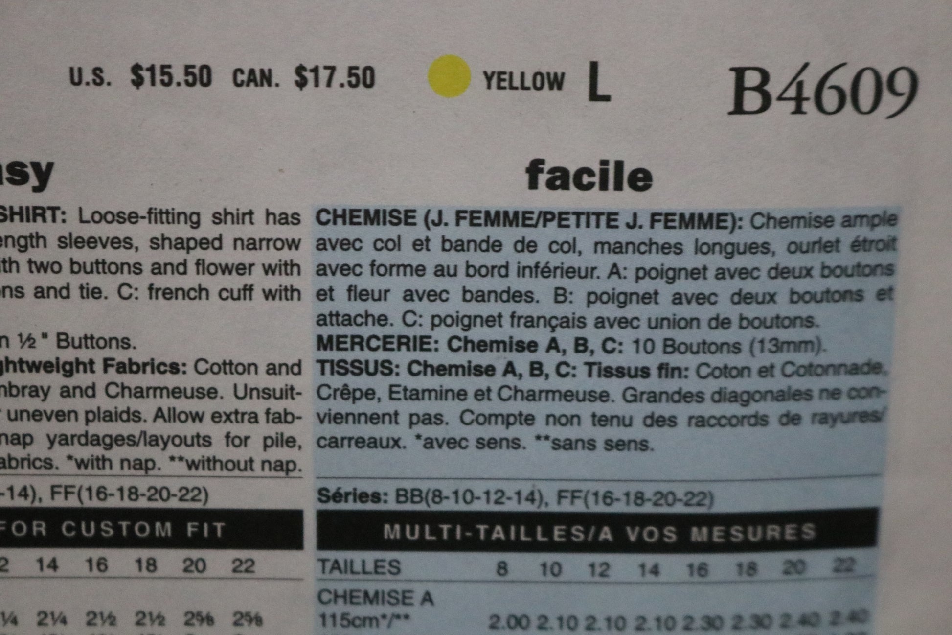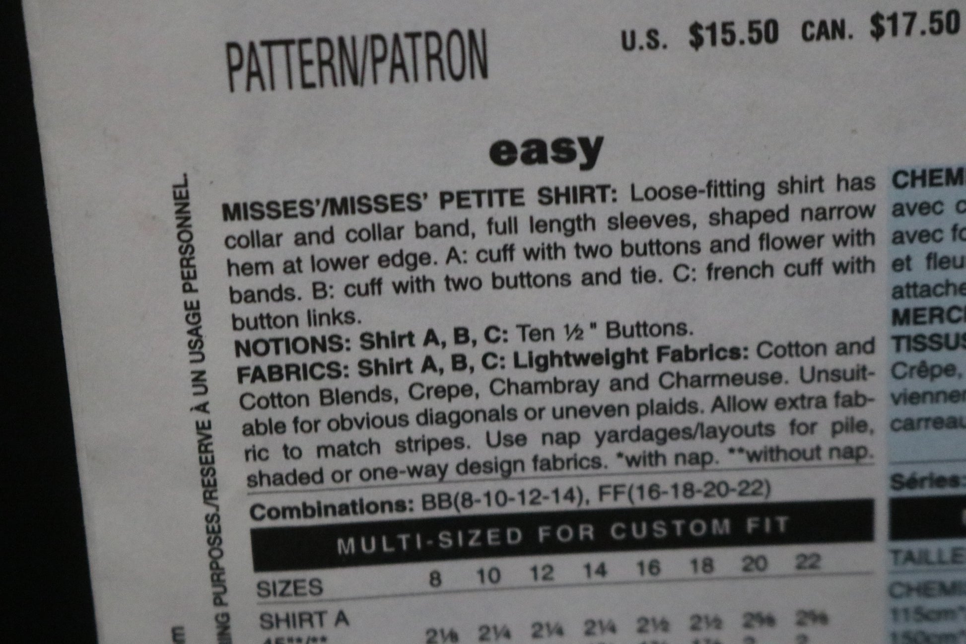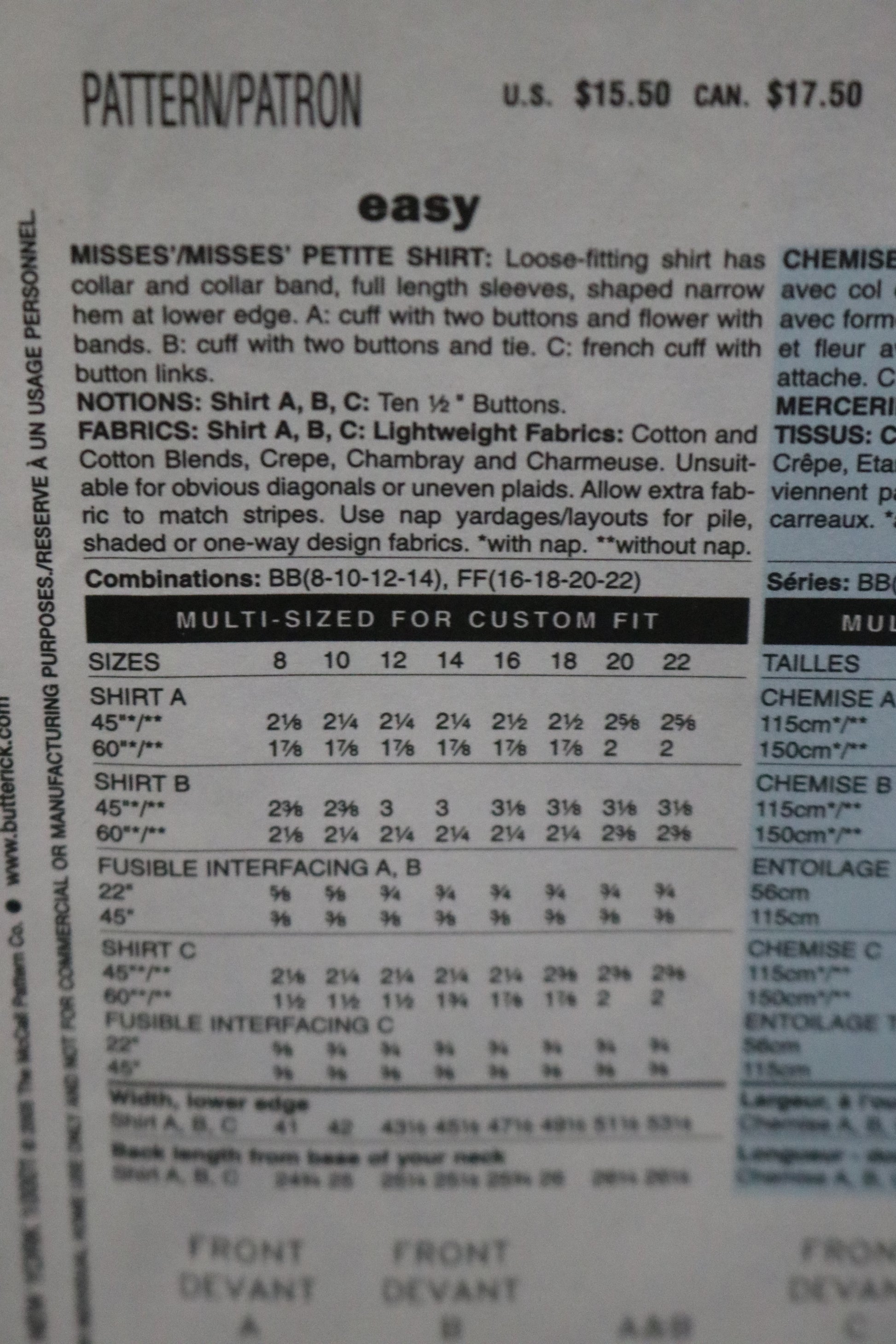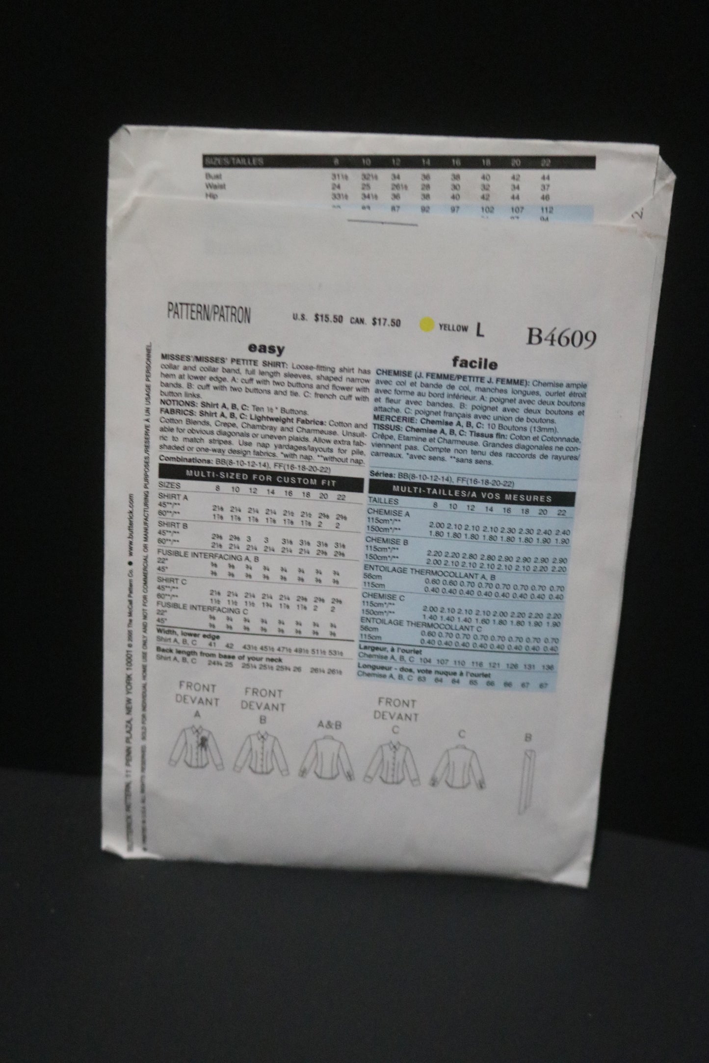 Butterick 4609 Misses / Misses Petite Shirt Sewing Pattern
