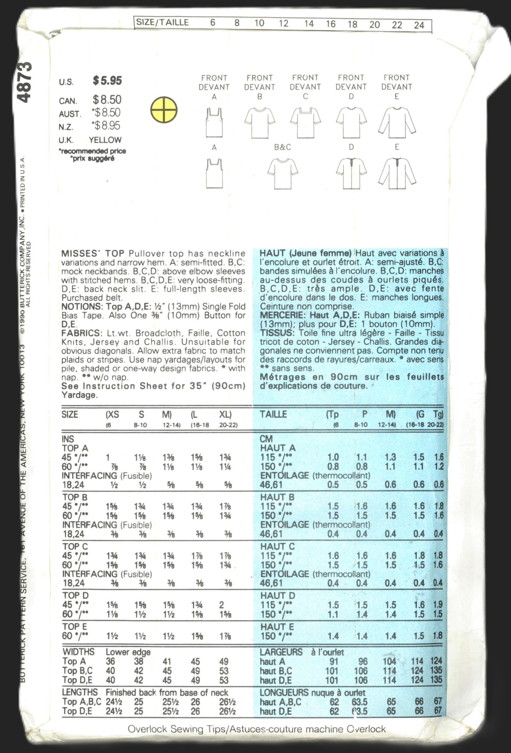 Butterick 4873 Misses Top Sewing Pattern UNCUT Size XS S M or Size L - XL