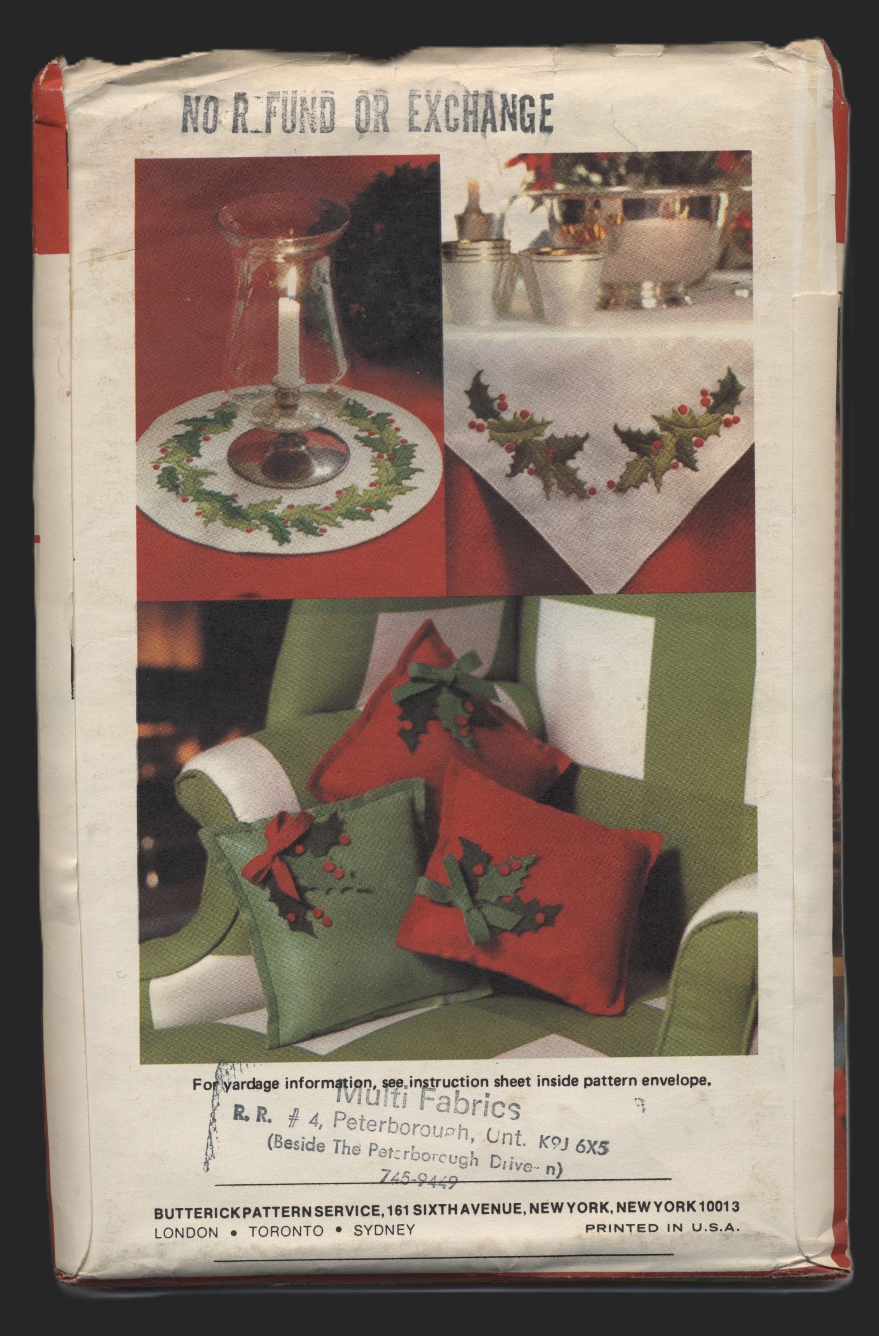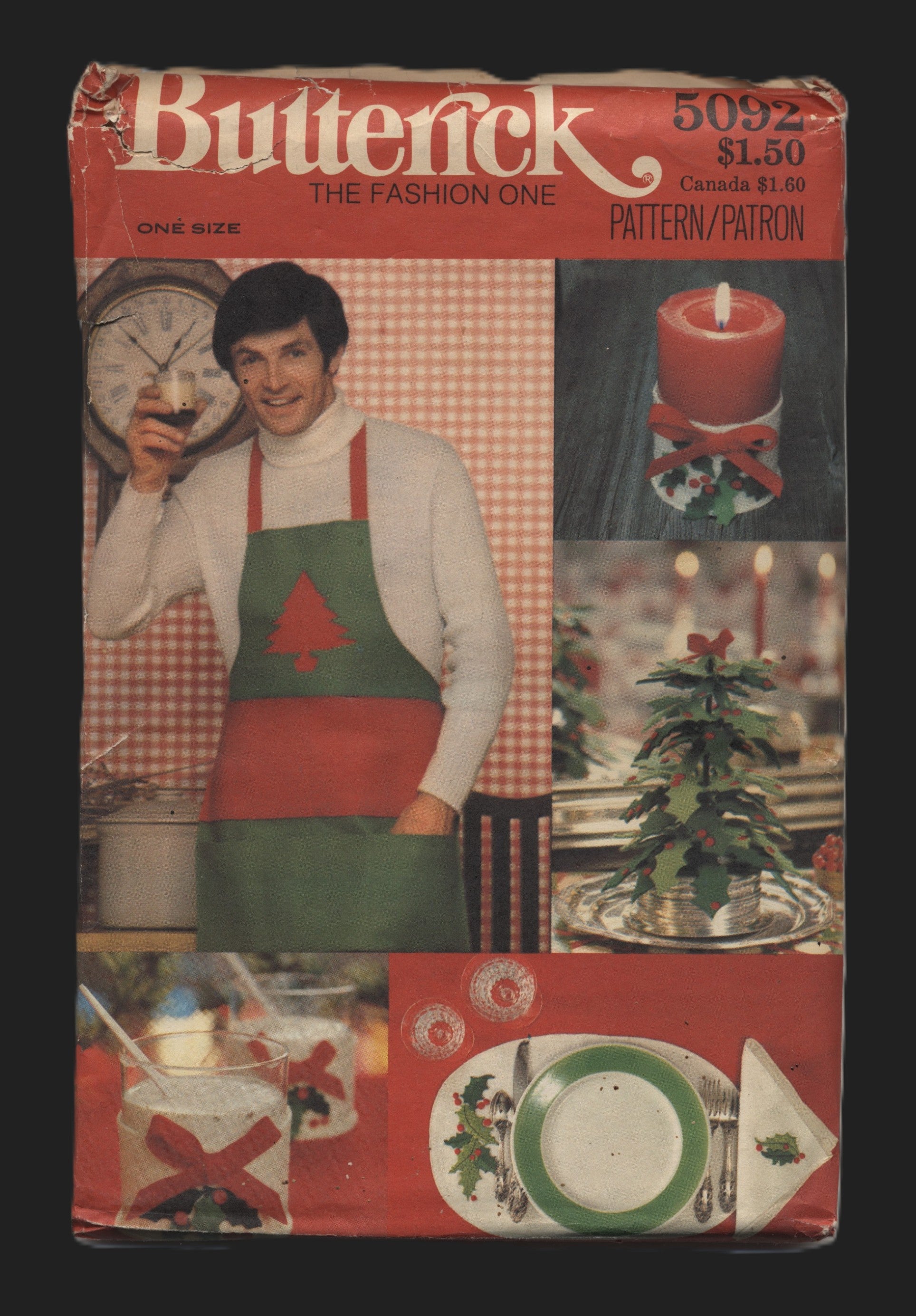 The pattern makes a one size Christmas apron, pillows, place mats, Holly tree decoration, centerpiece, napkins and candle holders