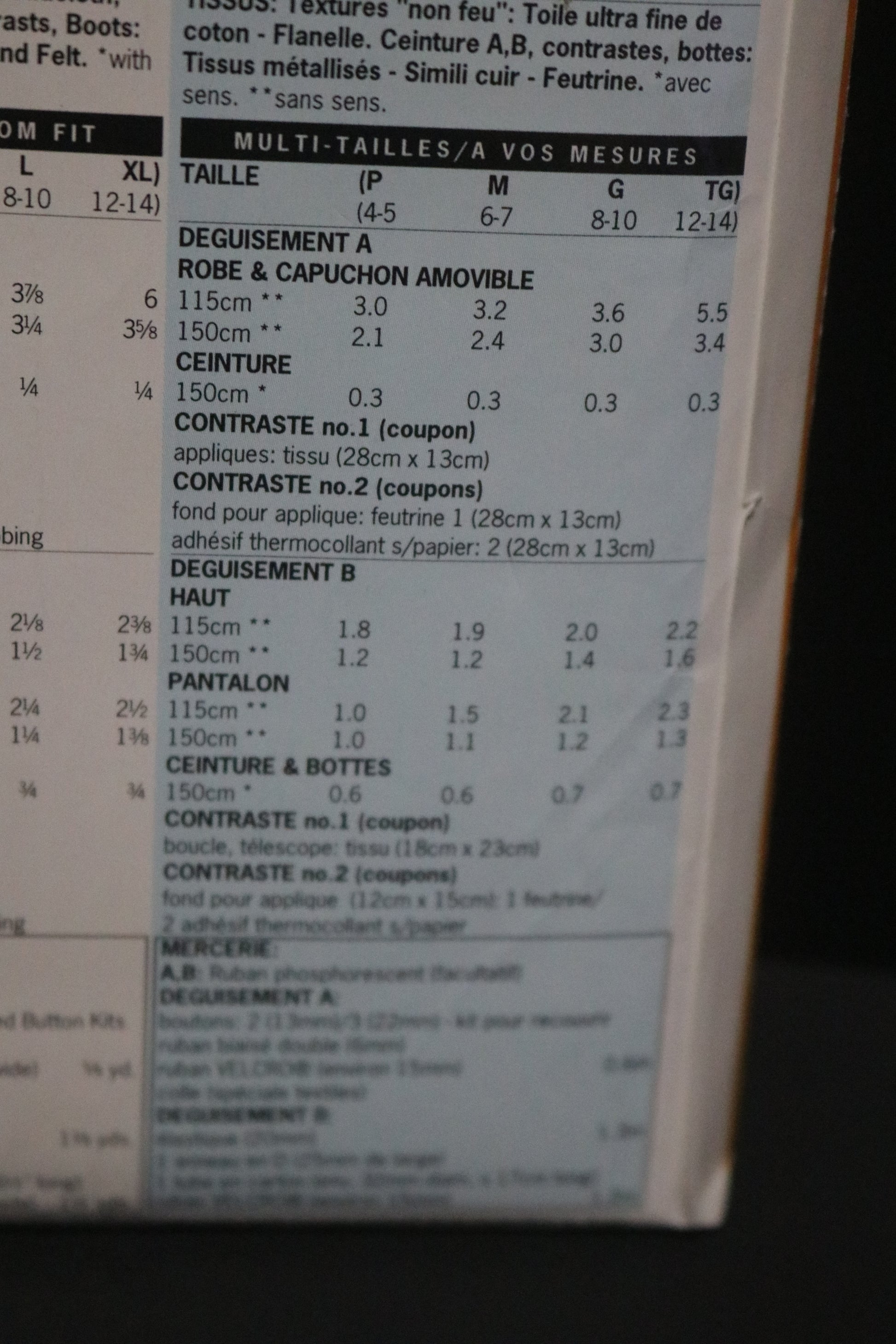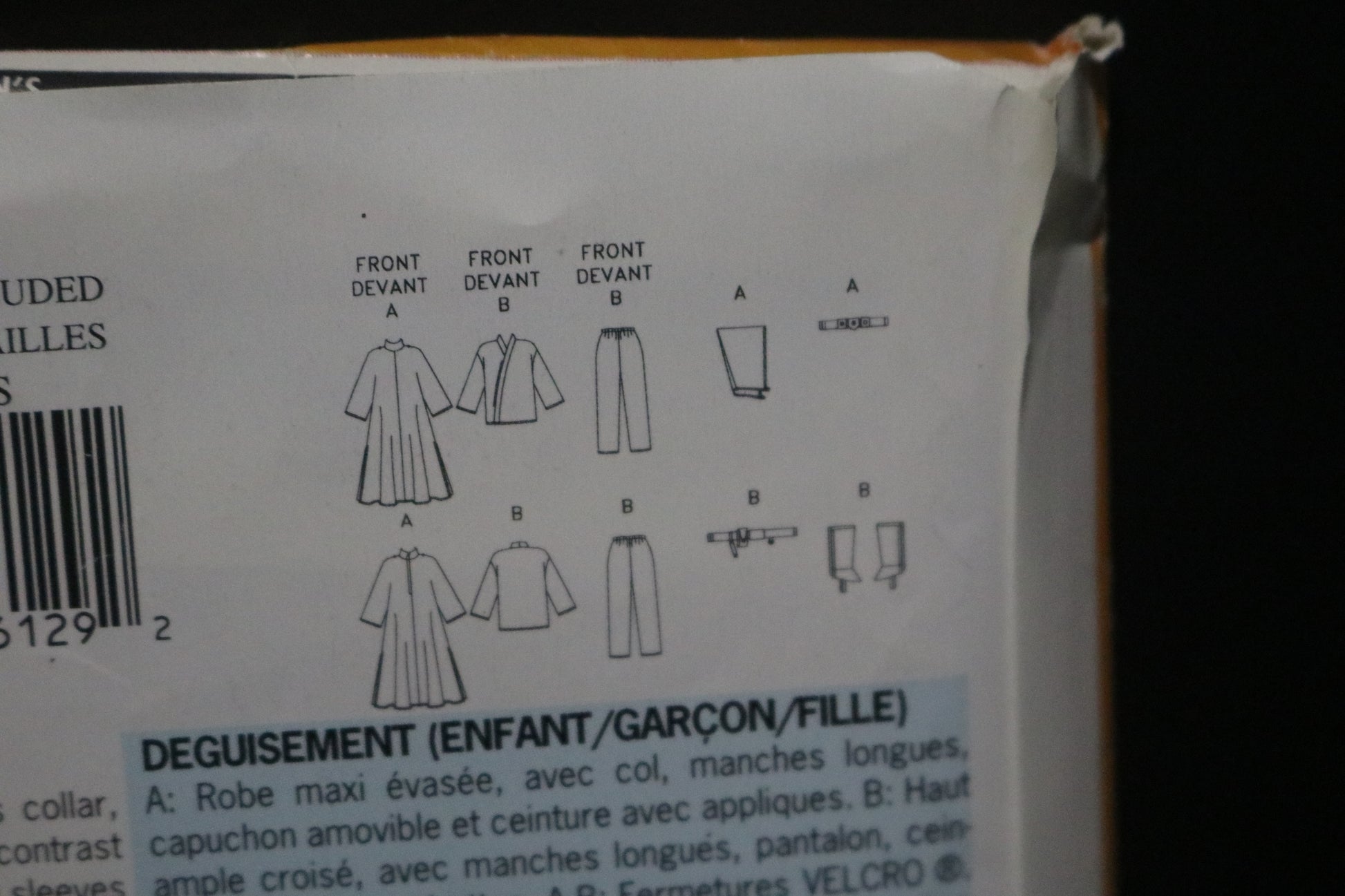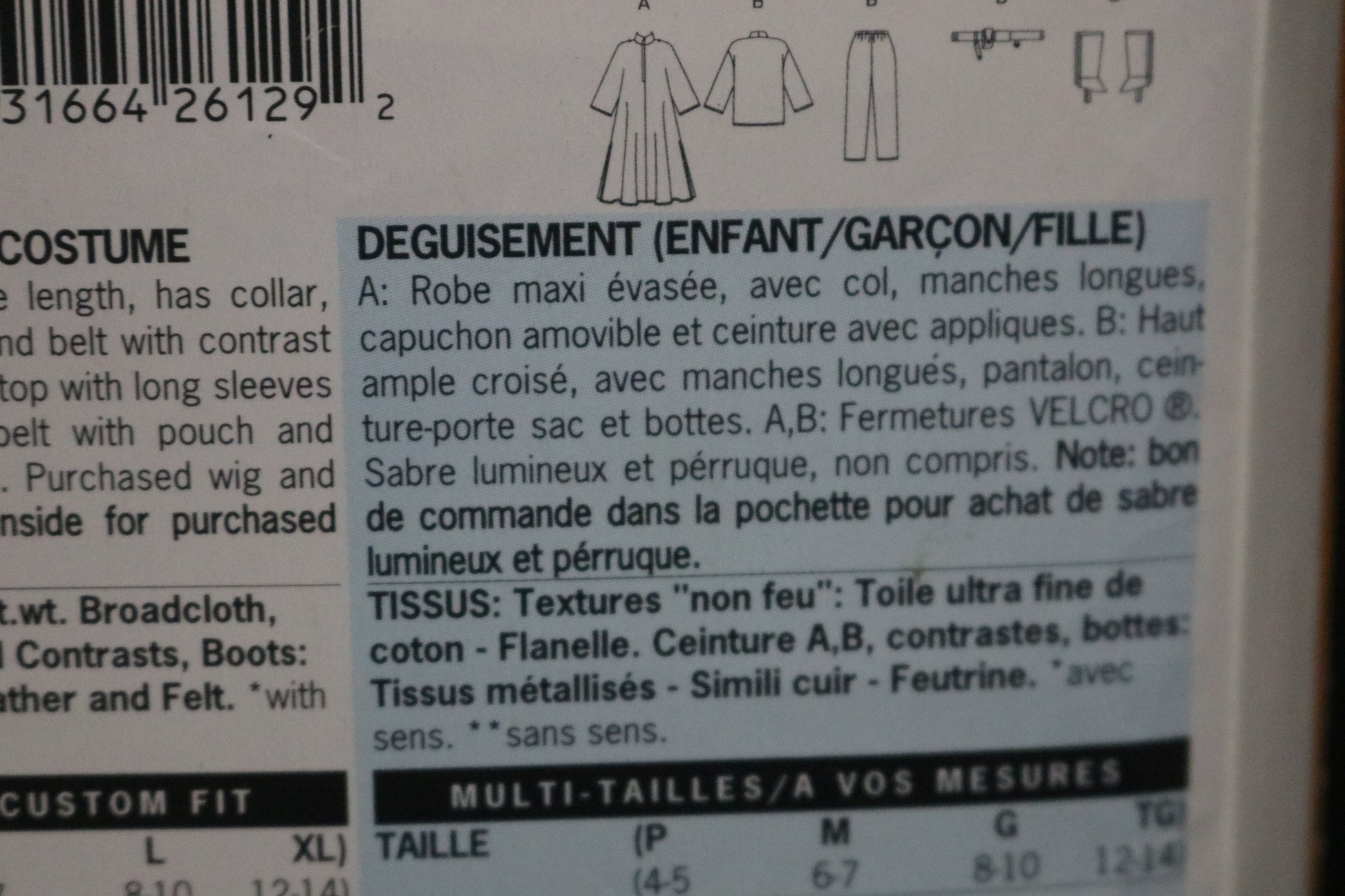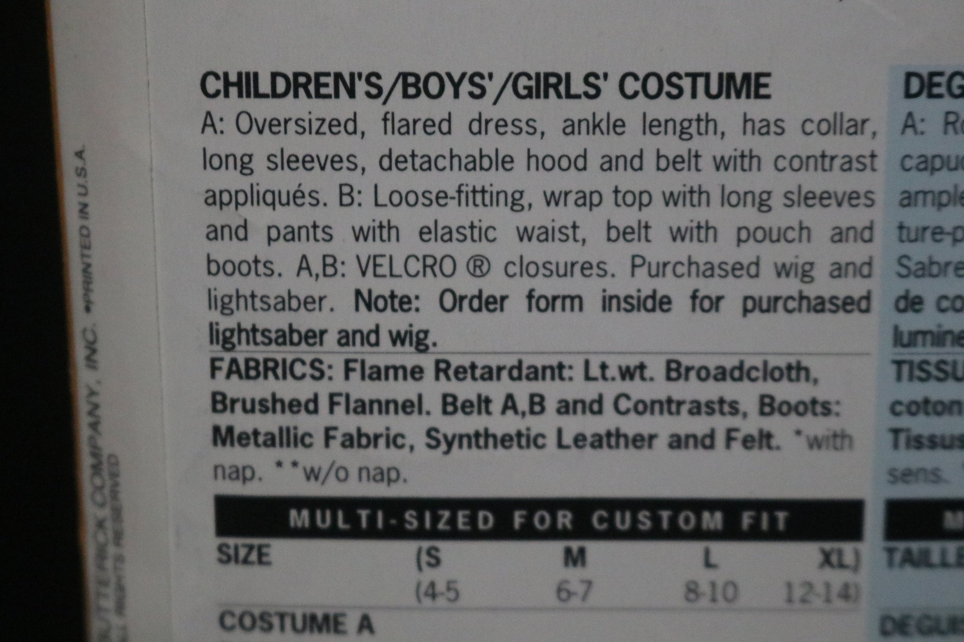 A: Oversized, flared dress, ankle length, has collar, long sleeves, detachable hood and belt with contrast appliques. B: Loose-fitting, wrap top with long sleeves and pants with elastic waist, belt with pouch and boots. A,B: Velcro closures. Purchased wig and lightsaber.