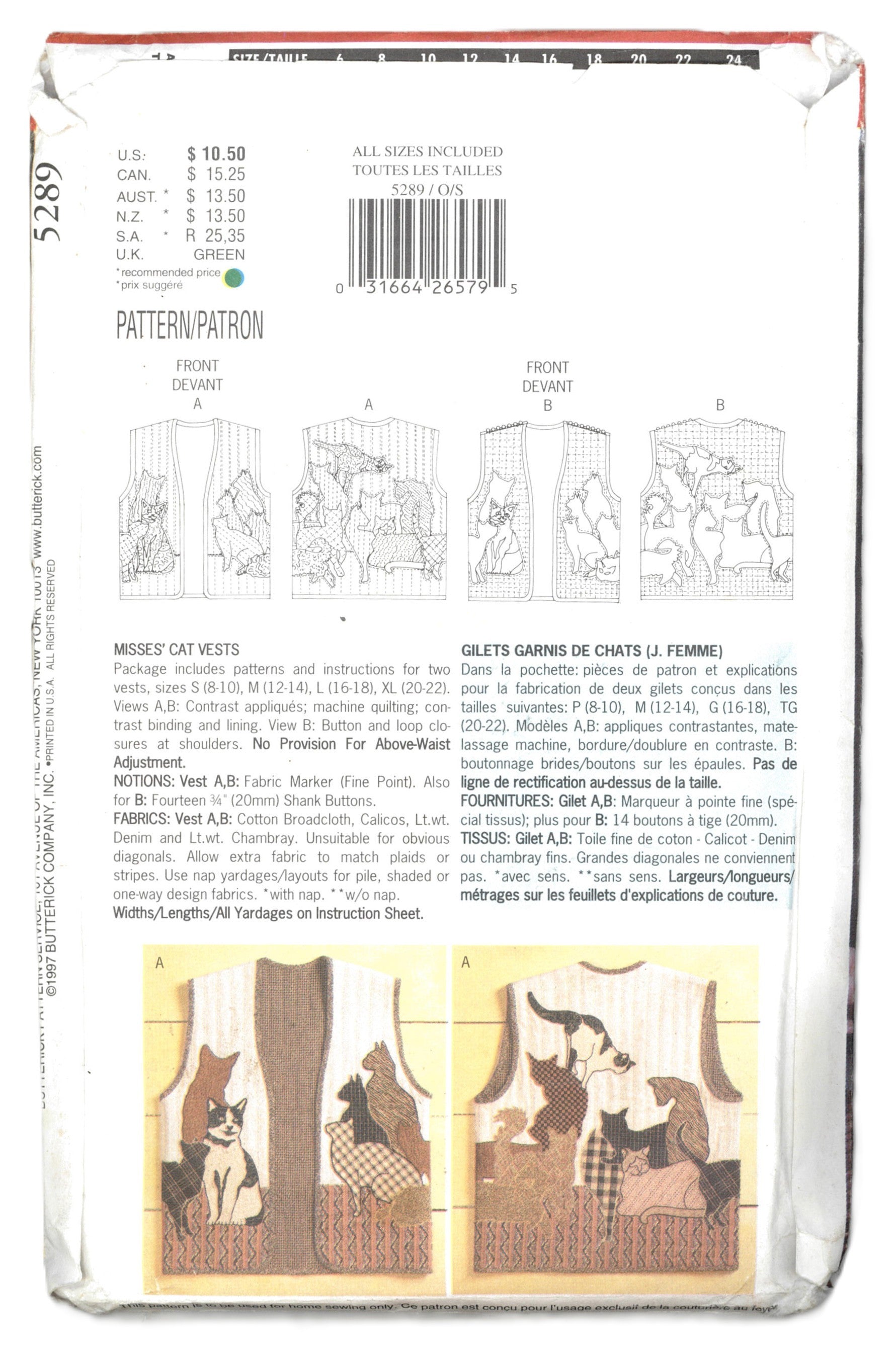 Butterick 5289 Misses Cat Vest Sewing Pattern