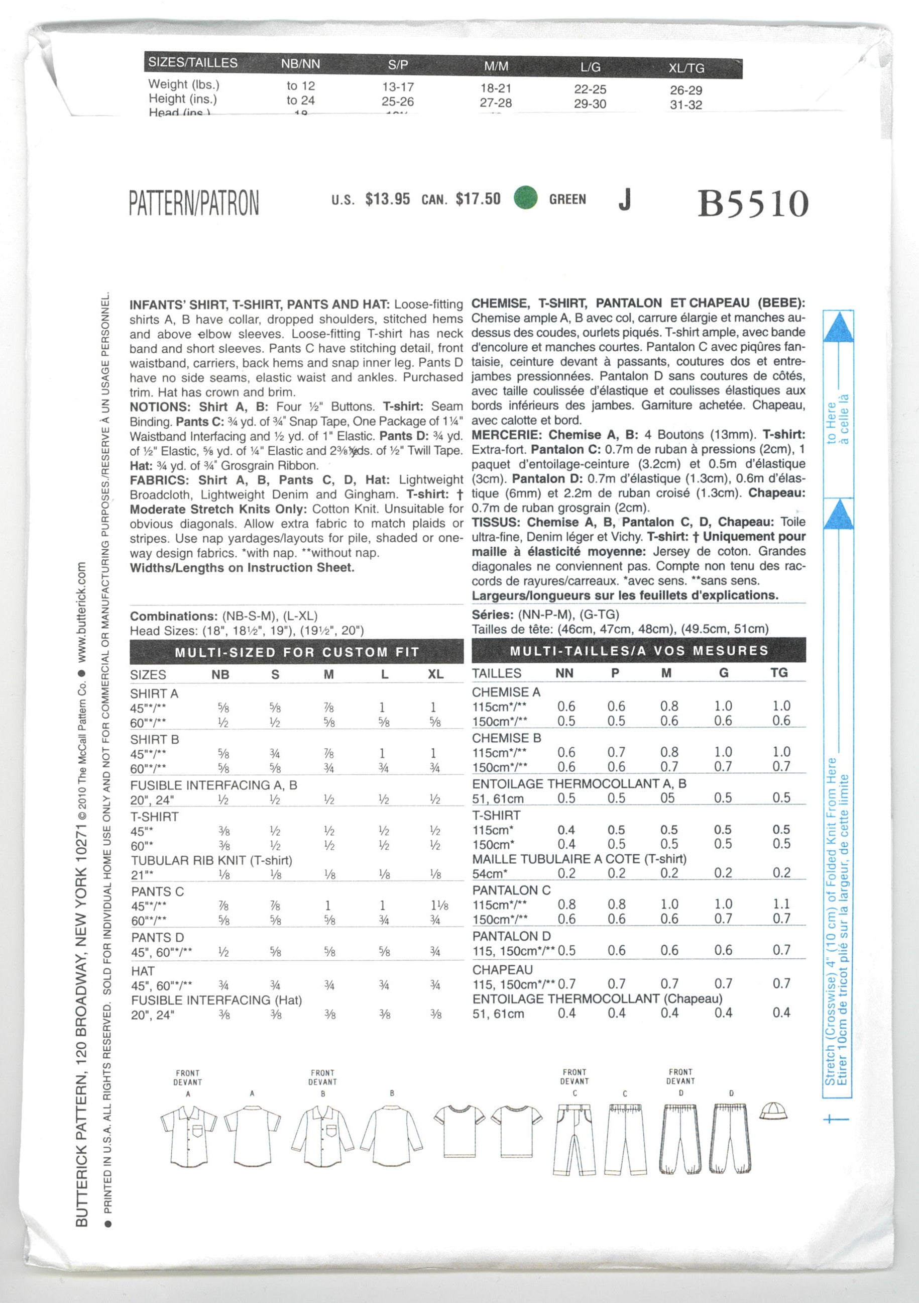 Butterick 5510 Infants Shirt T-Shirt Pants and Hat Sewing Pattern