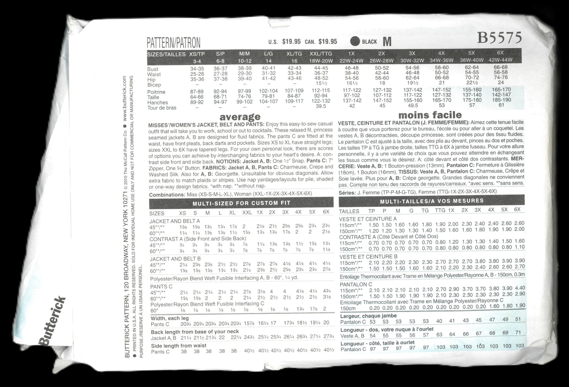 Enjoy this easy to sew casual outfit that will take you to work, school or out to cocktails. These relaxed fir, princess seamed jackets A, B are designed for fluid fabrics. The pants C are fitted at the waist, hae front pleats, back darts and pockets. Sizes XS to XL have straight legs; Sizes XXL to 6X have tapered legs. For your own personal look, there are scores of options you can acheive by interchanging fabrics to your hearts desisre. A: contrast side front and side back.