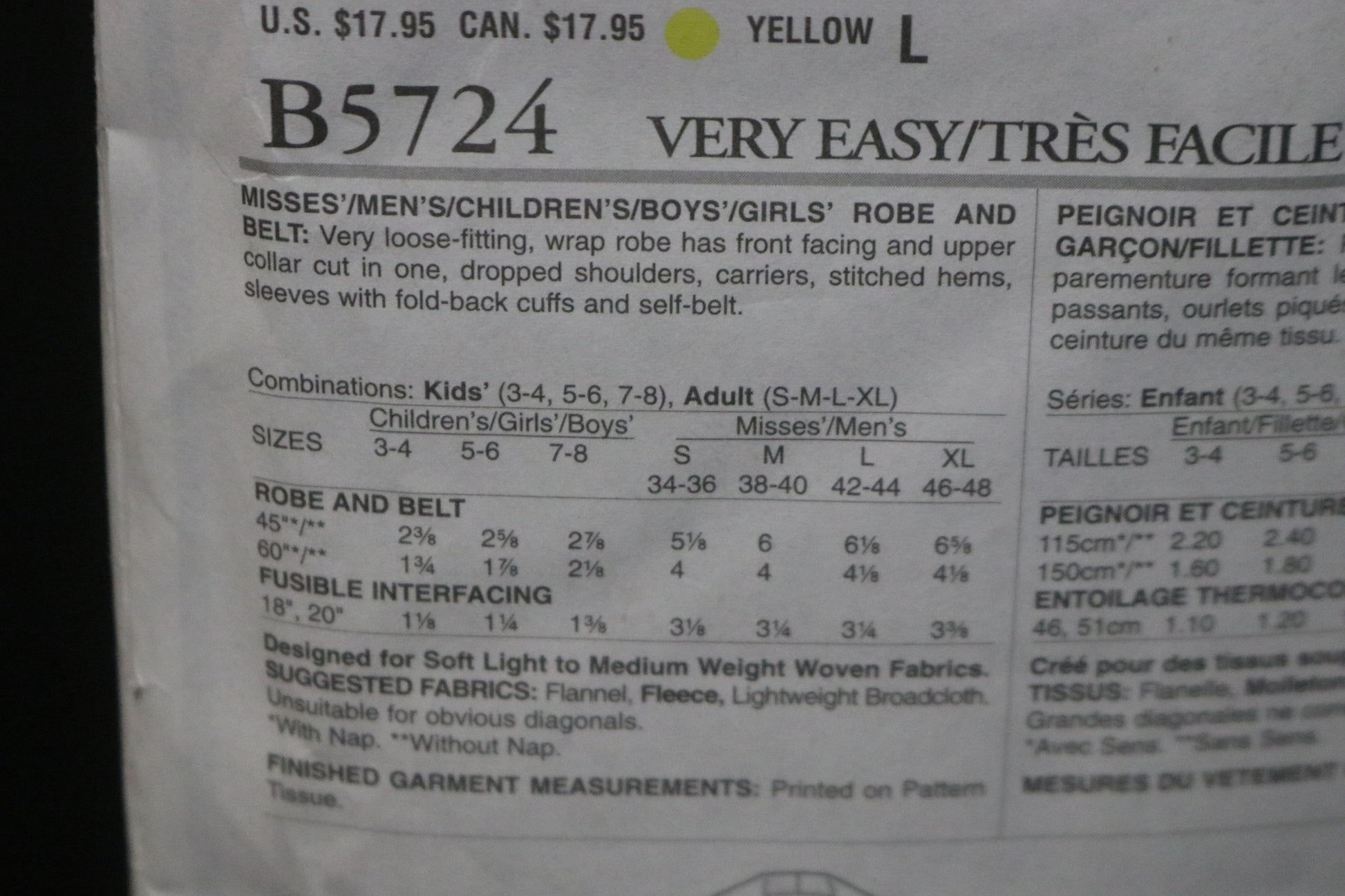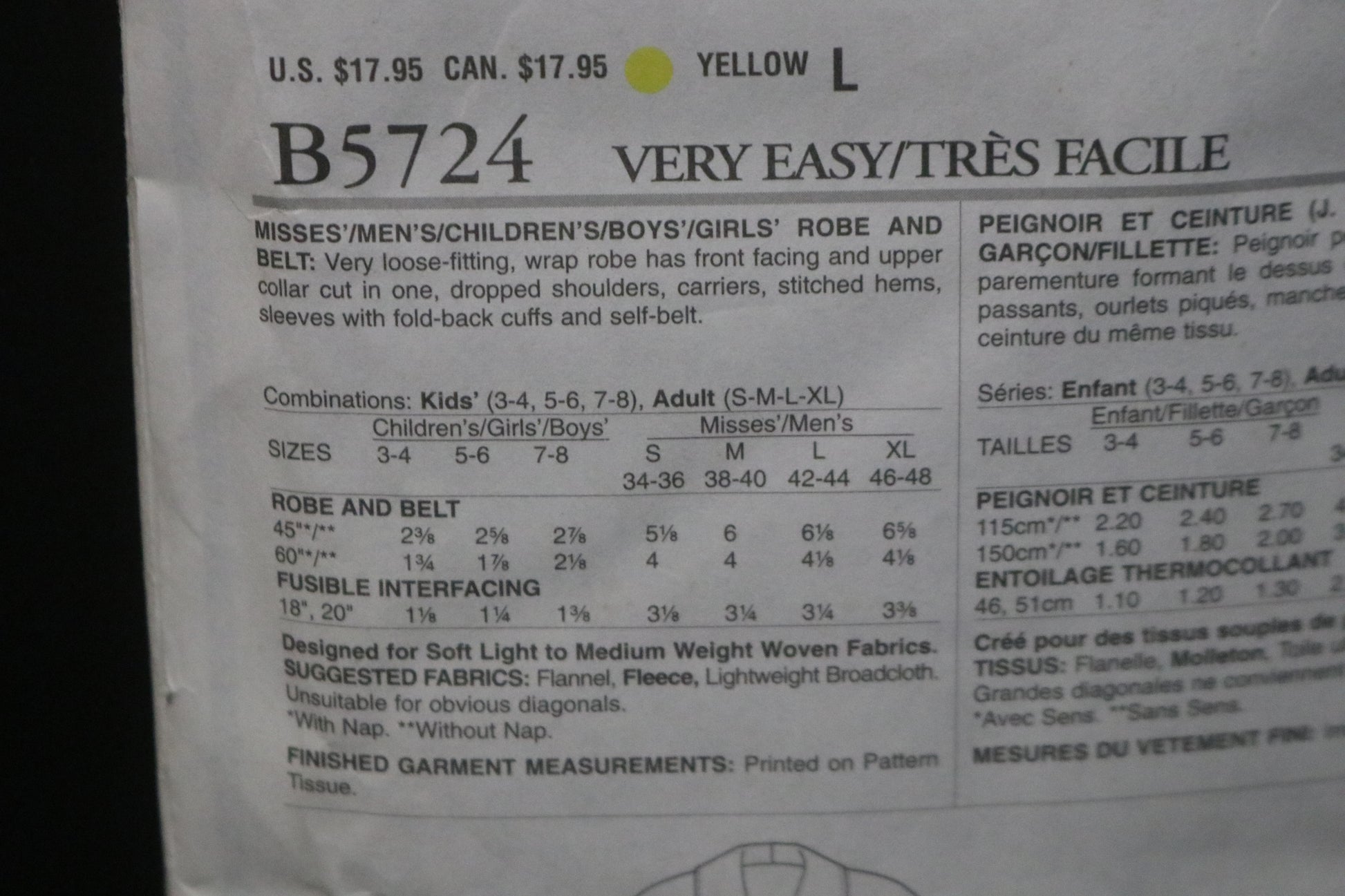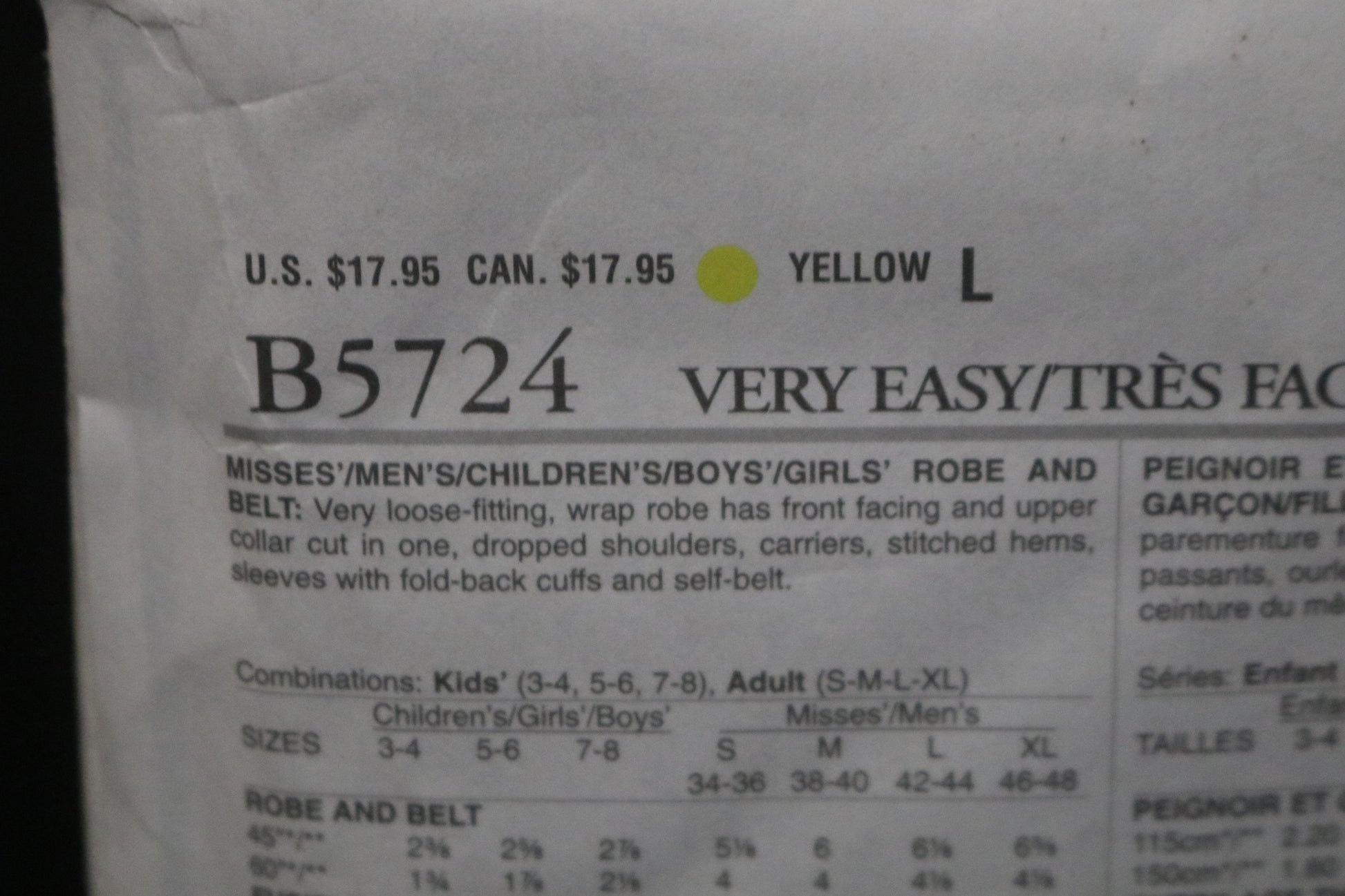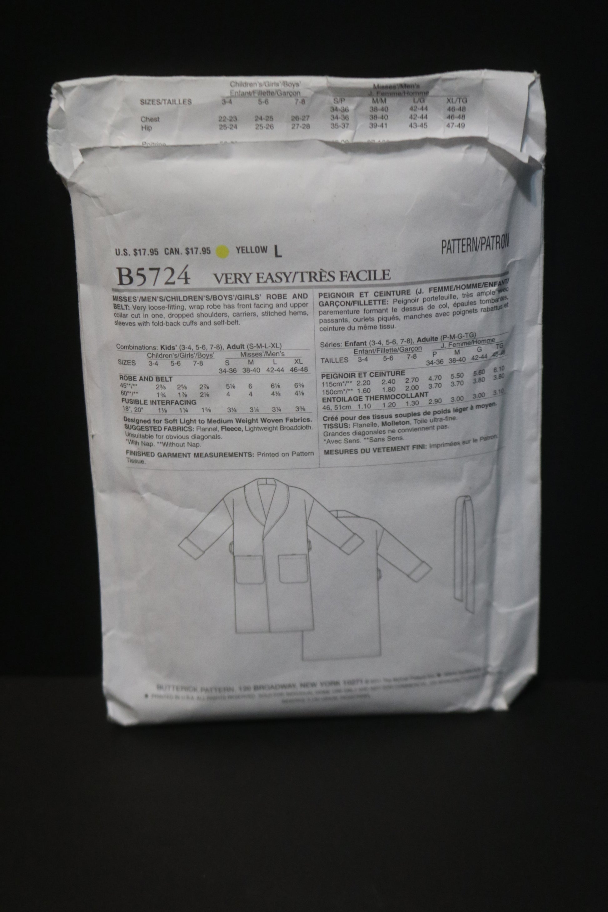 Butterick 5724 Misses . Mens Robe and Belt Sewing Pattern - UNCUT - Adult Size S M L XL