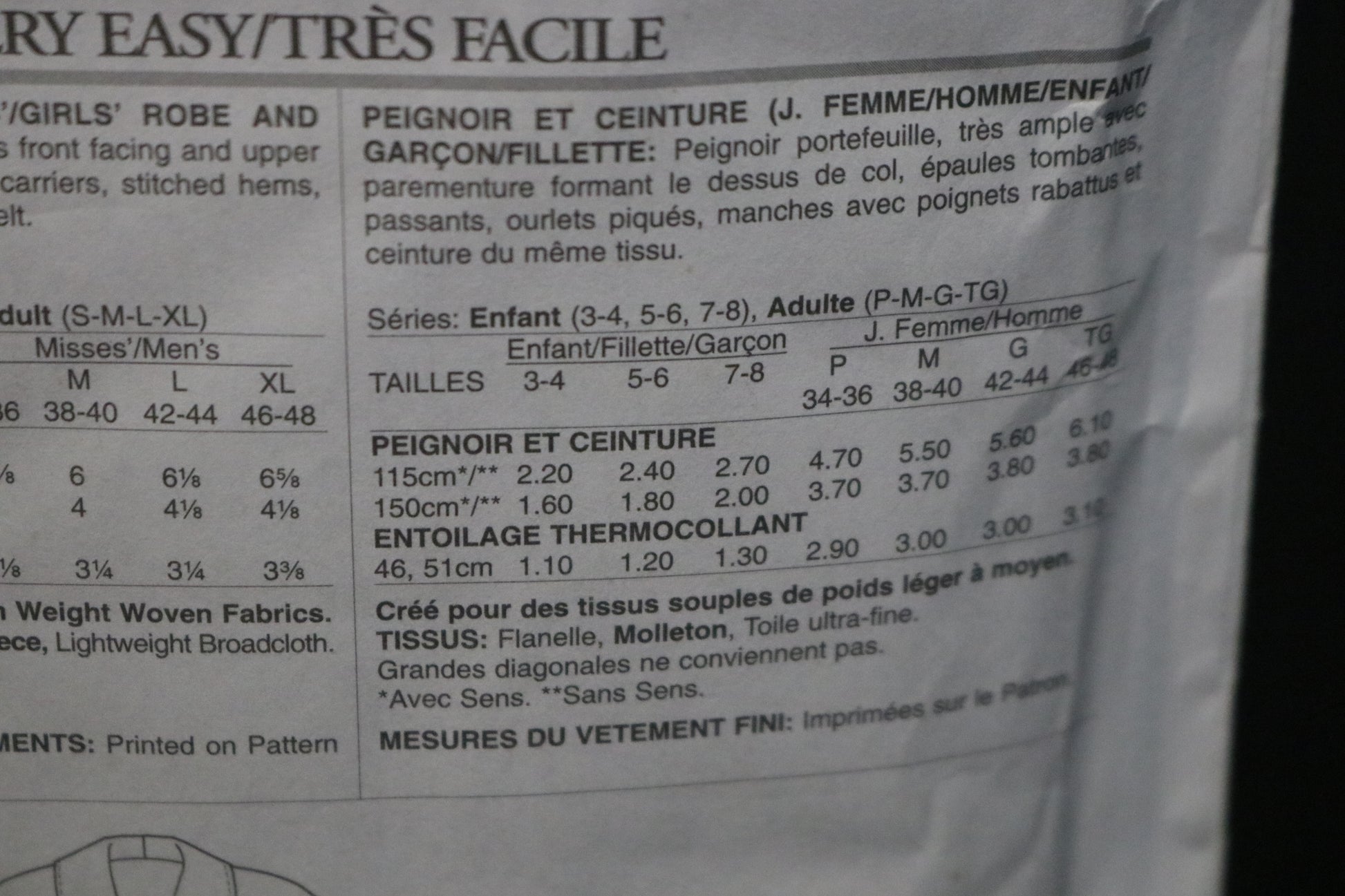 Very loose-fitting, wrap robe has front facing and upper collar cut in one, dropped shoulders, carriers, stitched hems, sleeves with fold-back cuffs and self belt.