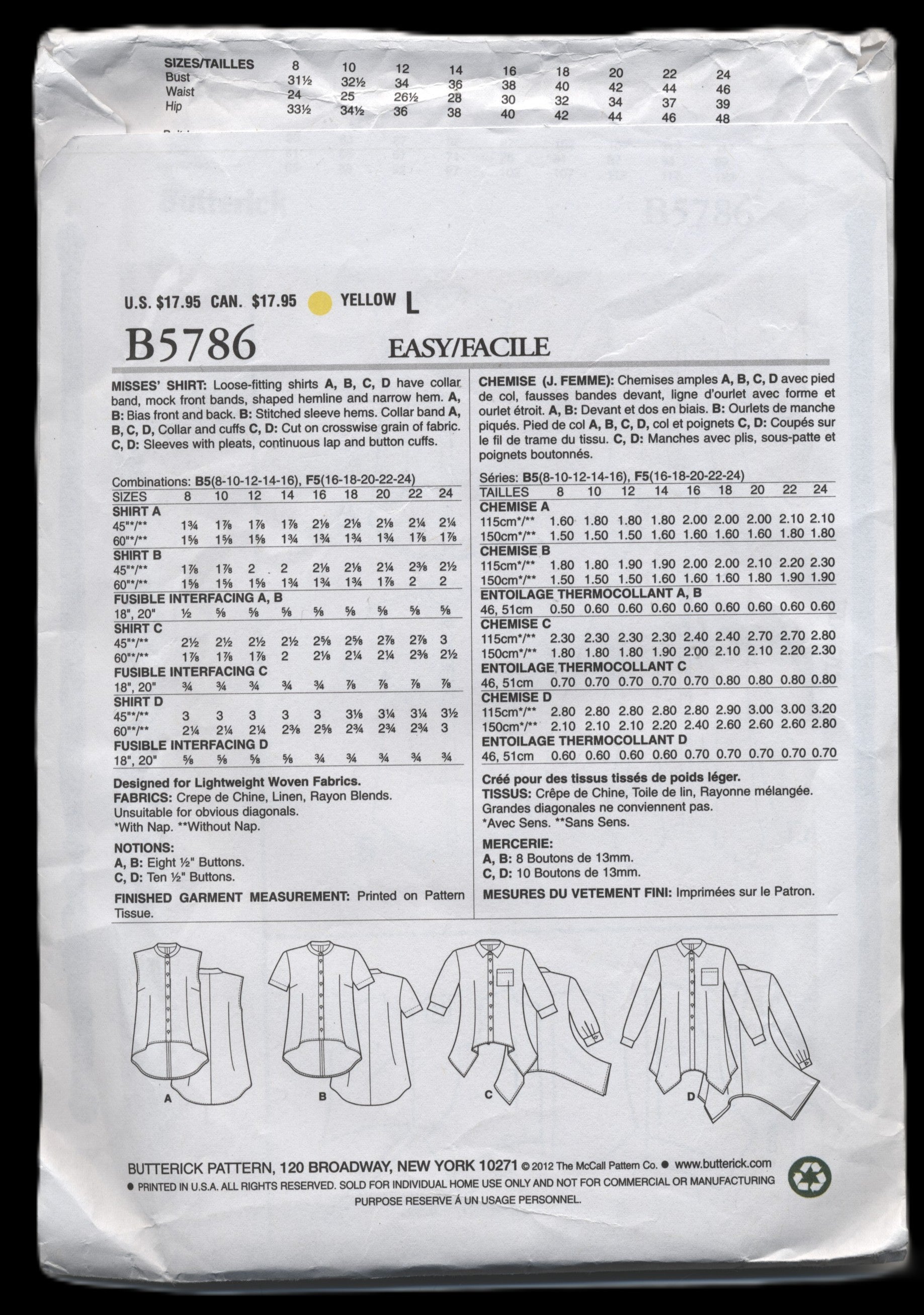 Butterick 5786 Misses Shirt Sewing Pattern UNCUT - Size 8 10 12 14 16