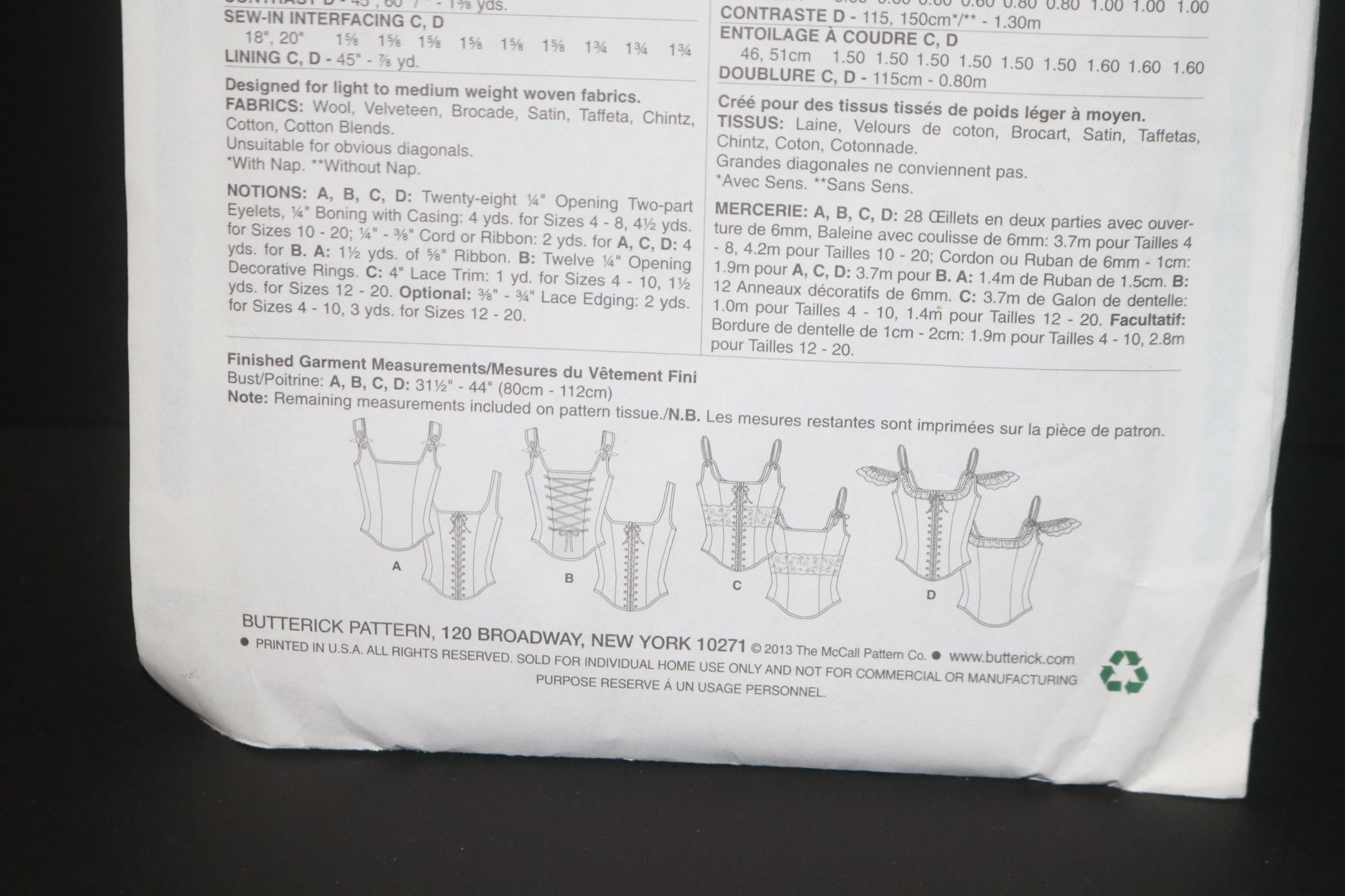 Close-fitting, lined, boned corset has bias binding finish, seam detail, extension, shaped hemline, and front or back lacing. D: Ruffles and off-the-shoulder sleeves. Purchased lacing for all views, ribbon for bows A, B, and trim for C.