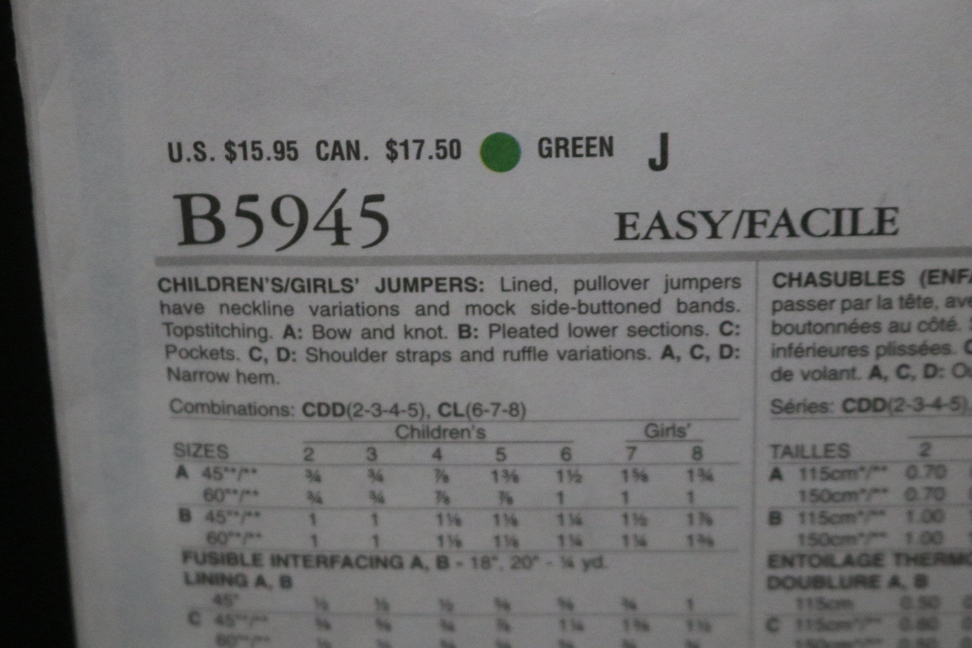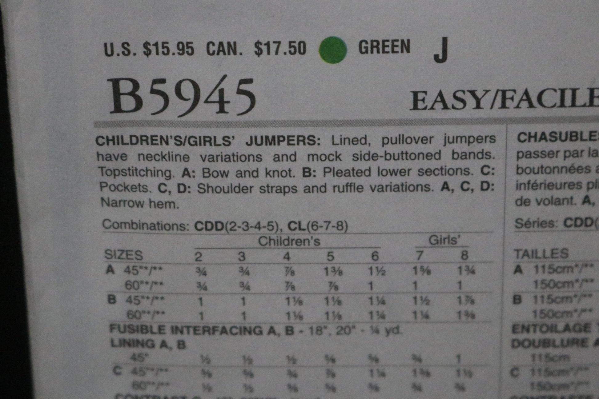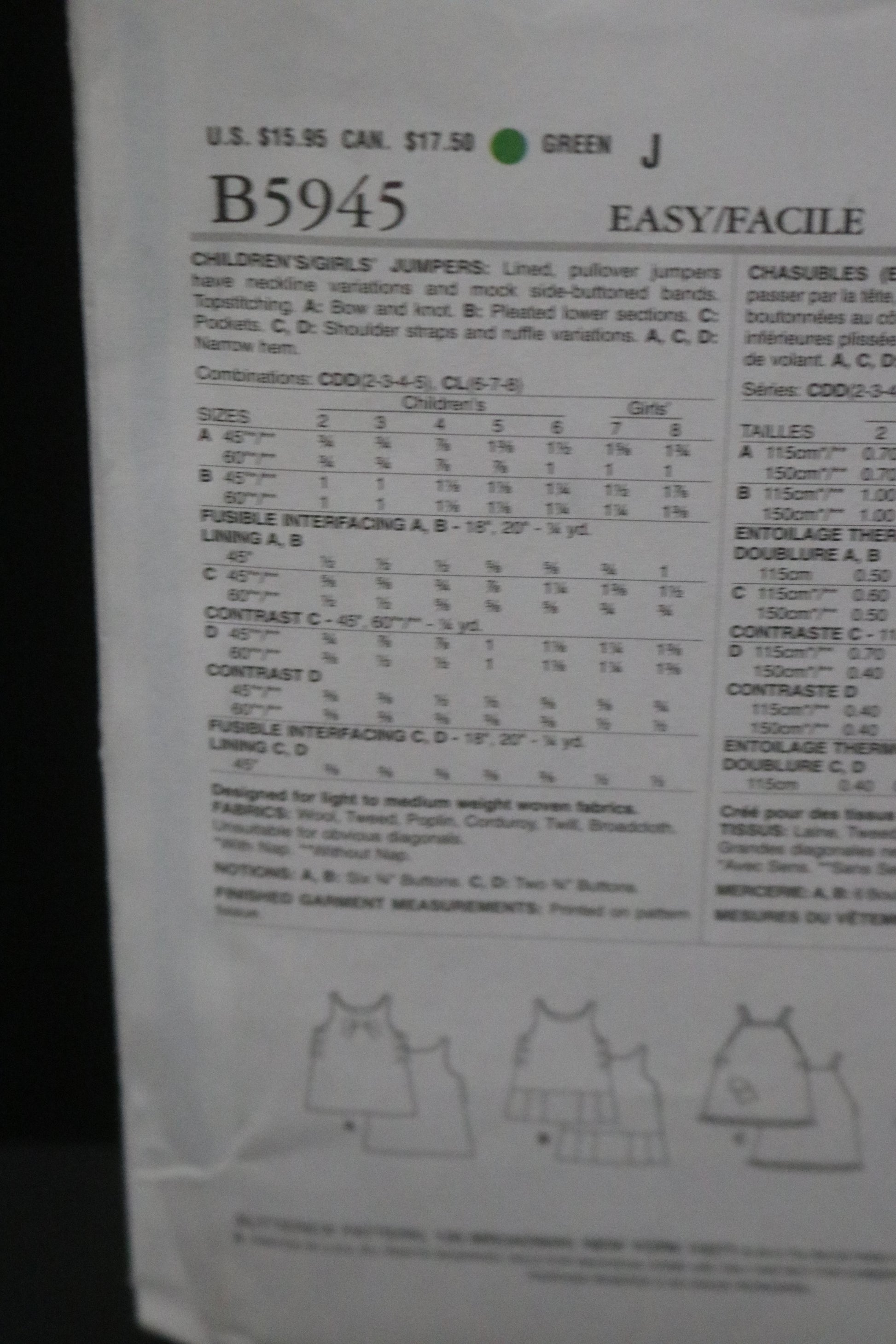 Butterick 5945 Chilrens/Girls Jumper Sewing Pattern - UNCUT Size 6 7 8