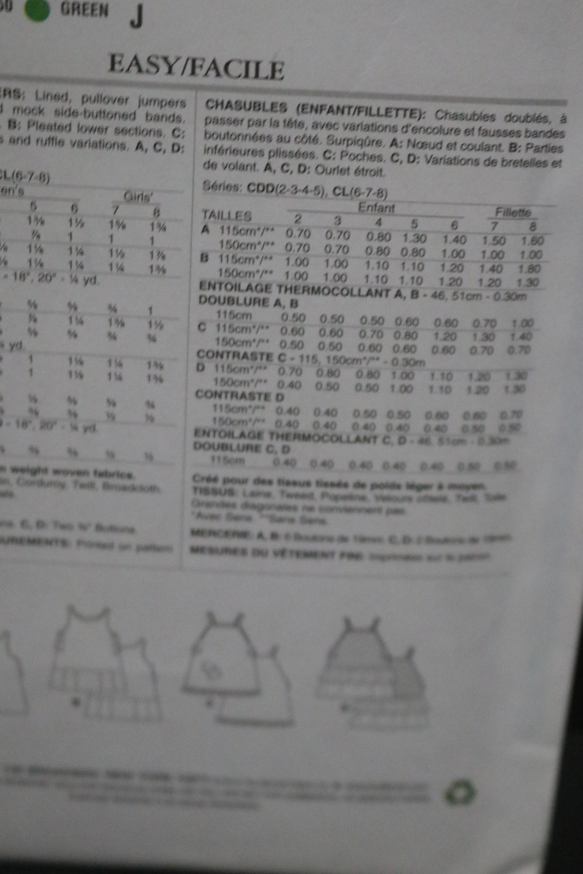 Lined, pullover jumpers have neckline variations and mock side-buttoned bands. Topstitching. A: bow and knot. B: pleated lower sections. C: pockets. C and D: shoulder straps and ruffle variations. A, C and D: narrow hem. Designed for light to medium weight woven fabrics. FABRICS: Wool, Tweed, Poplin, Cotton Velvet, Corduroy, Twill, Broadcloth.