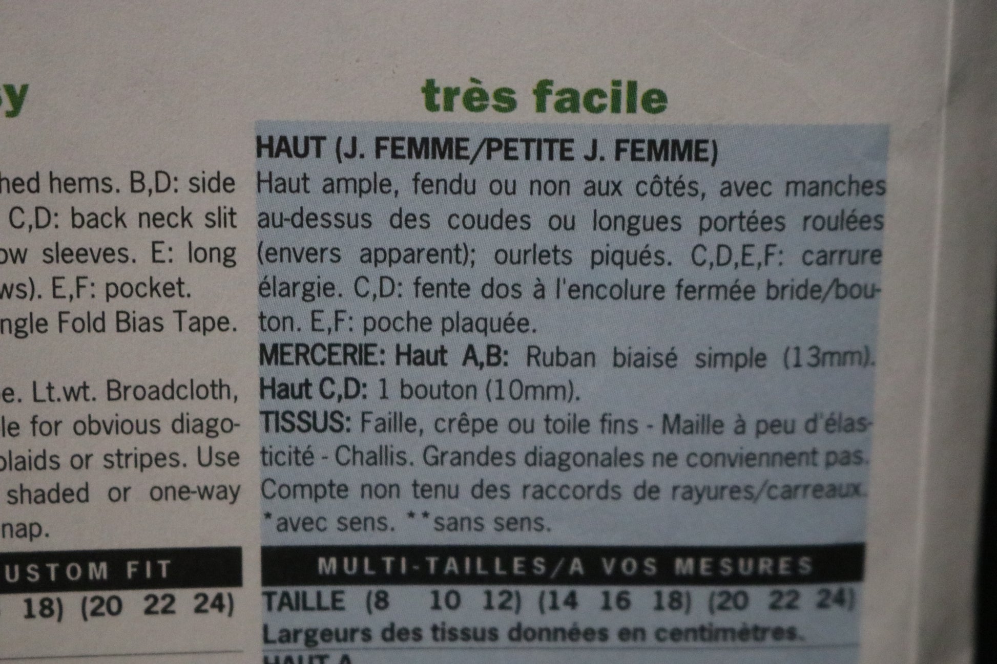 Loose Fitting, Pullover top has stitched hems, B,D; side slit with button loop. C,F: back neck slit with button/loop. C,F: above elbow sleeves. E; long sleeves, rolled up ( wrong side shows), E,F: pocket.