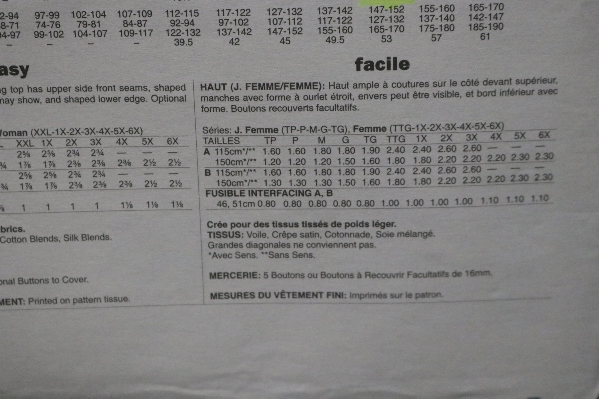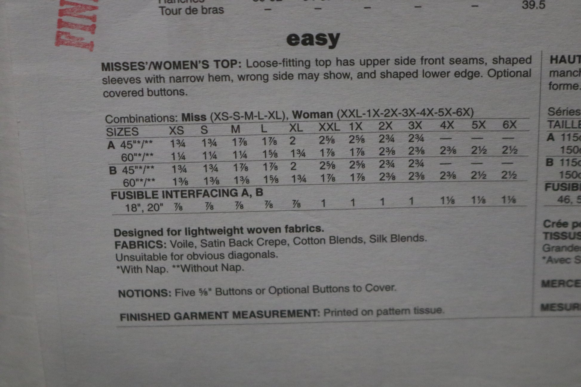 Loose-fitting top has upper side front seams, shaped sleeves with narrow hem, wrong side may show, and shaped lower edge.Optional covered buttons. Designed for Lightweight Woven Fabrics. FABRICS: Voile, Satin-Back Crepe, Cotton Blends and Silk Blends.