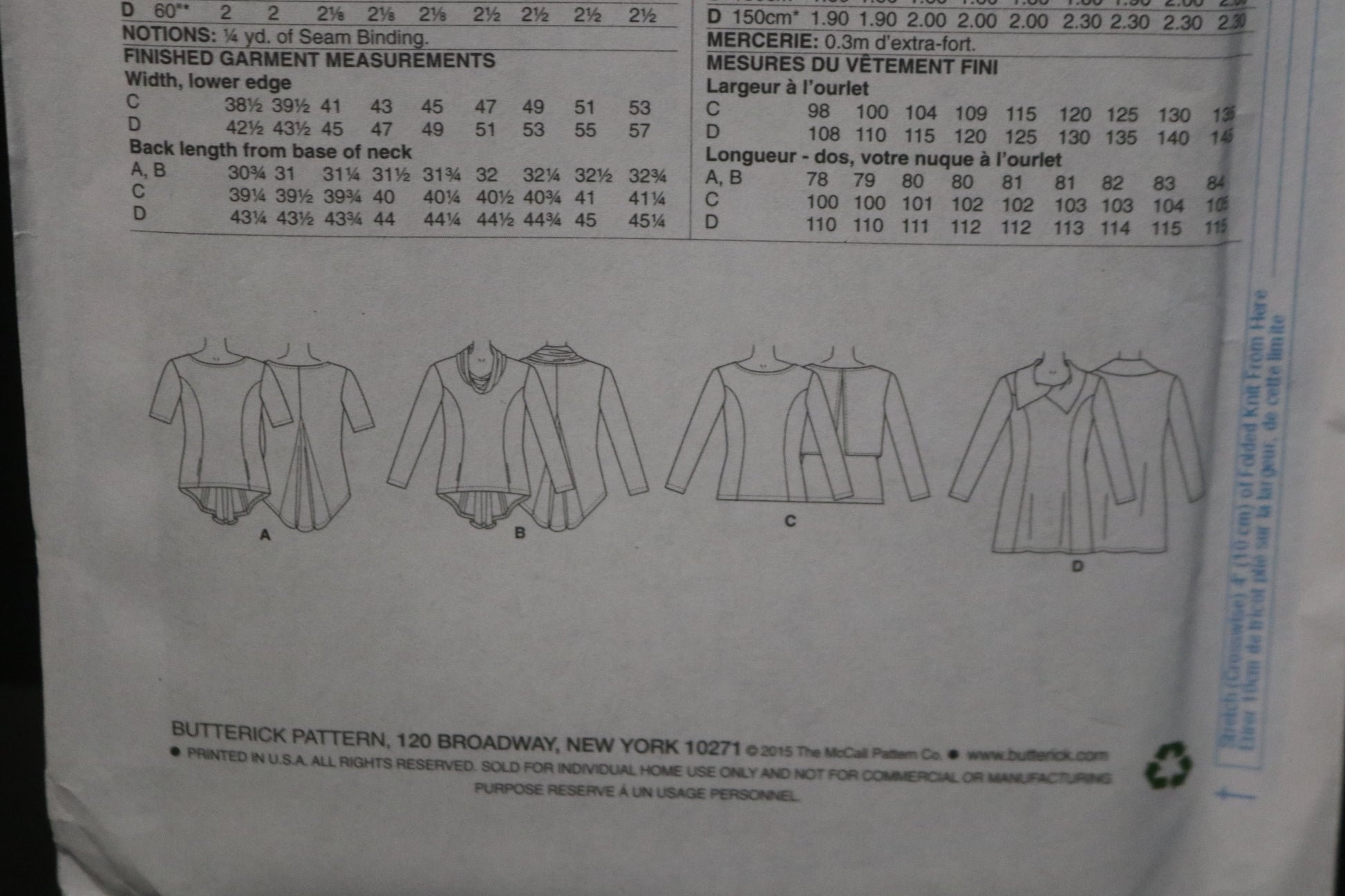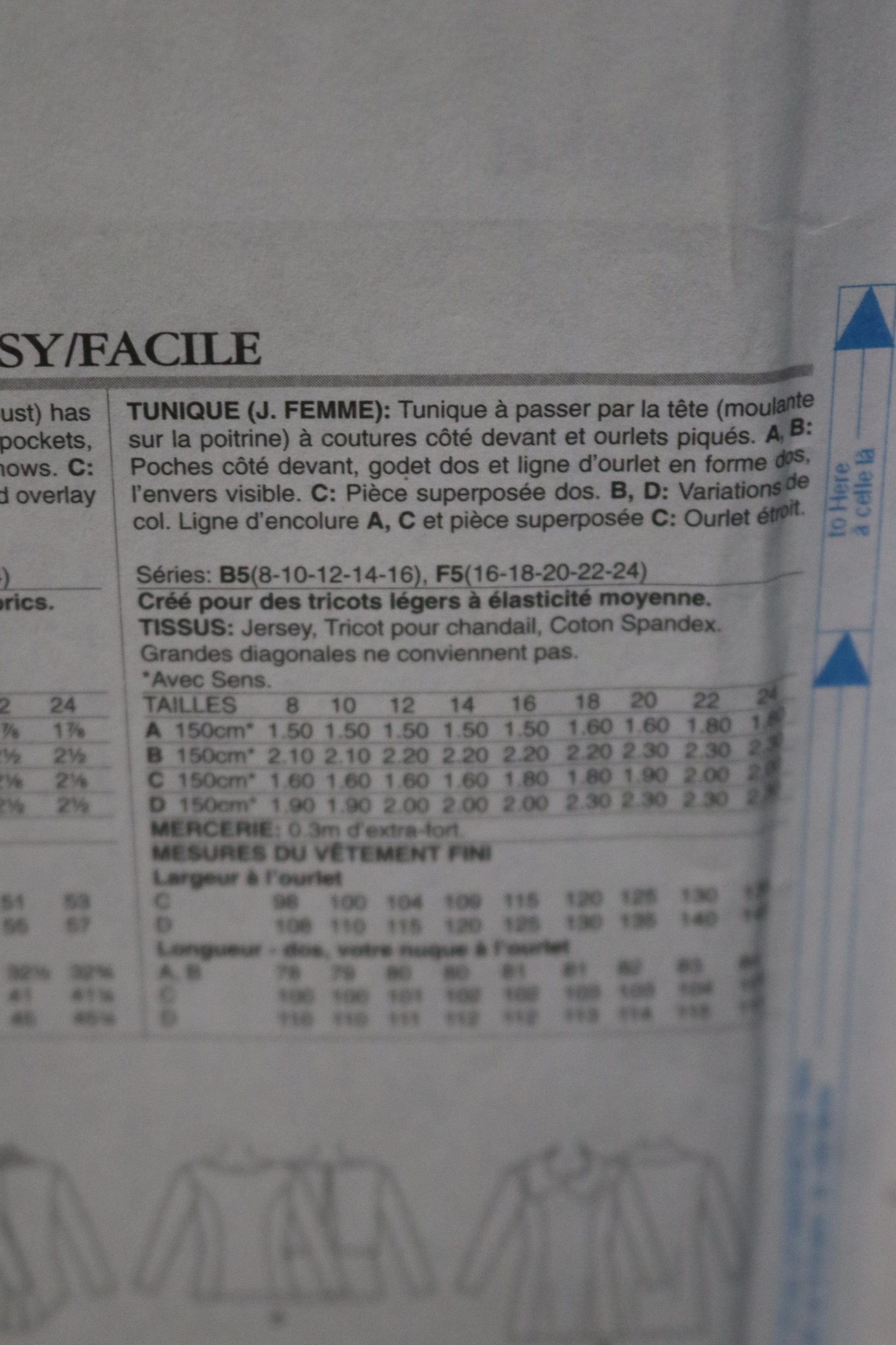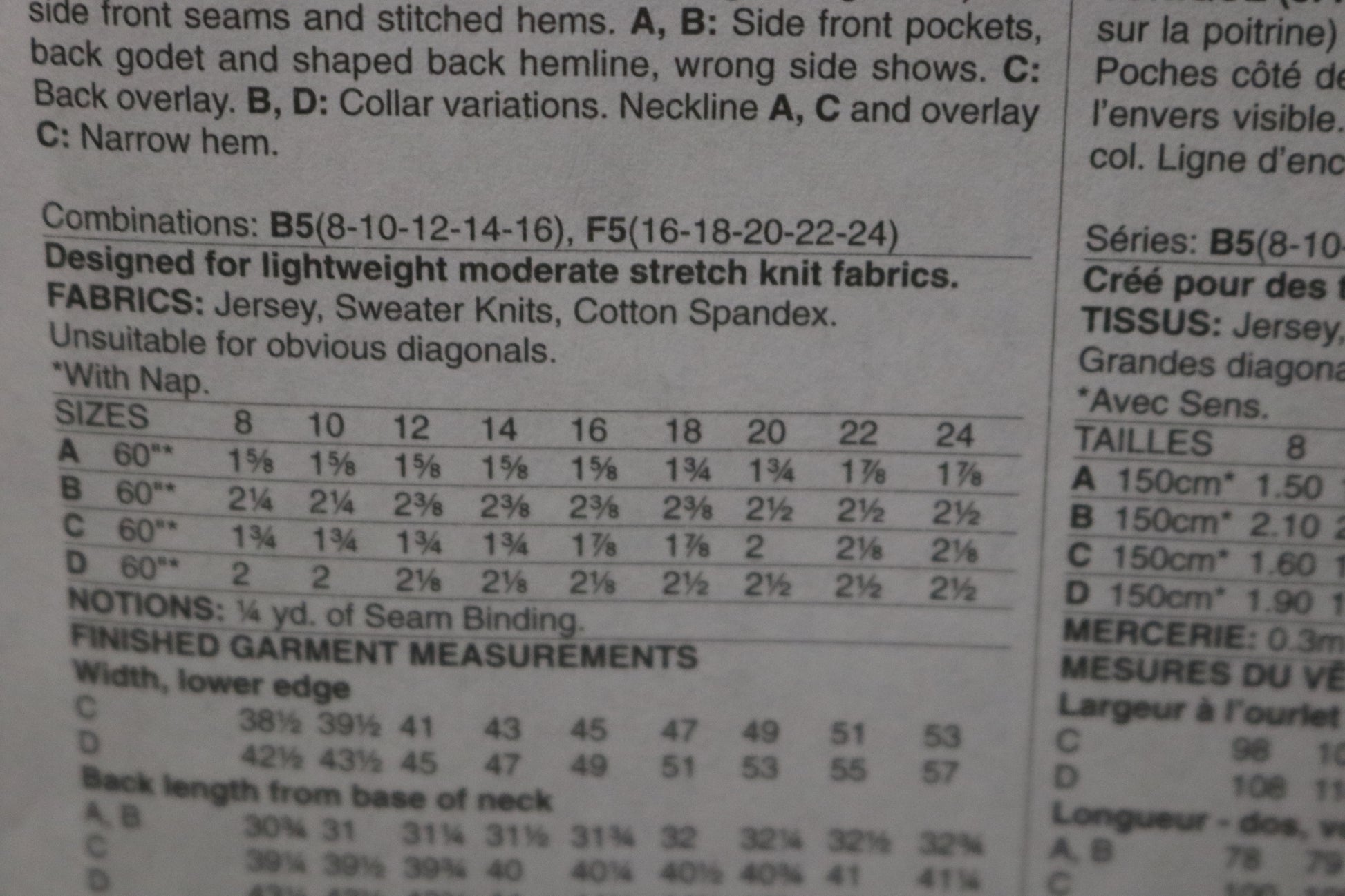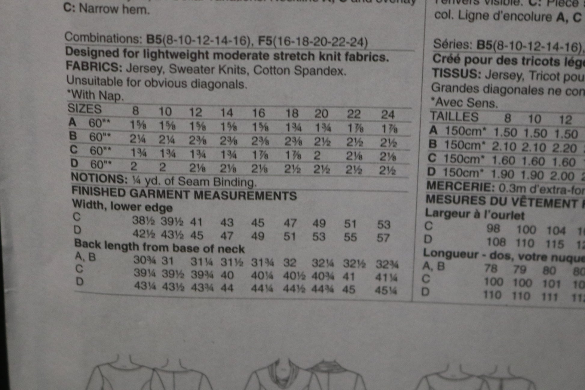 Pullover tunic (close-fitting through bust) has side-front seams, and stitched hems. A and B: Side-front pockets, back godet, and shaped back hemline, wrong side shows. C: Back overlay. B and D: Collar variations. Neckline A, C and overlay C: Narrow hem. Designed for lightweight moderate stretch knits.