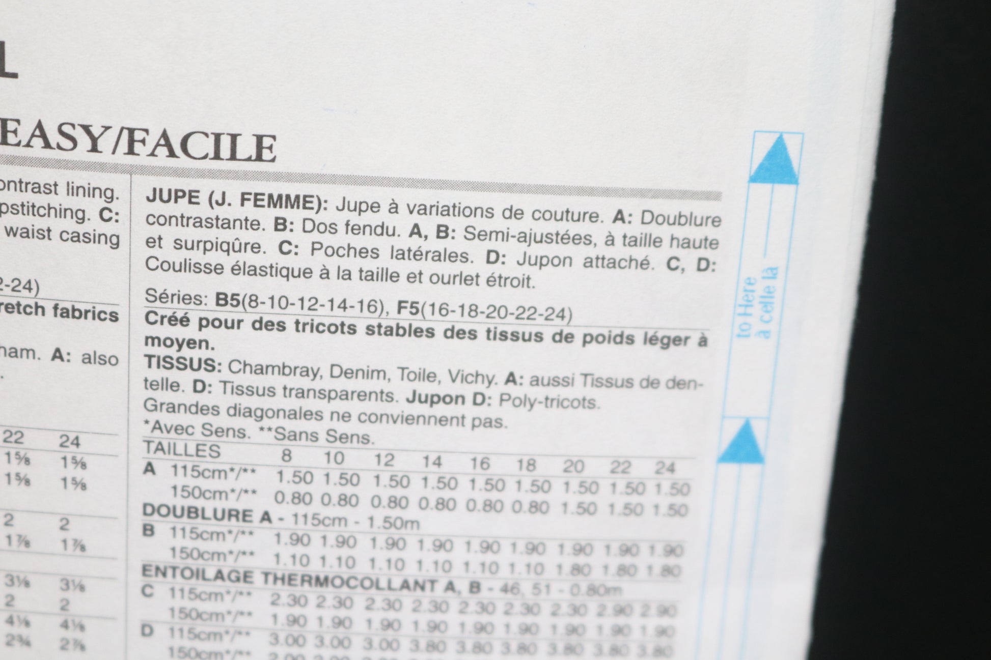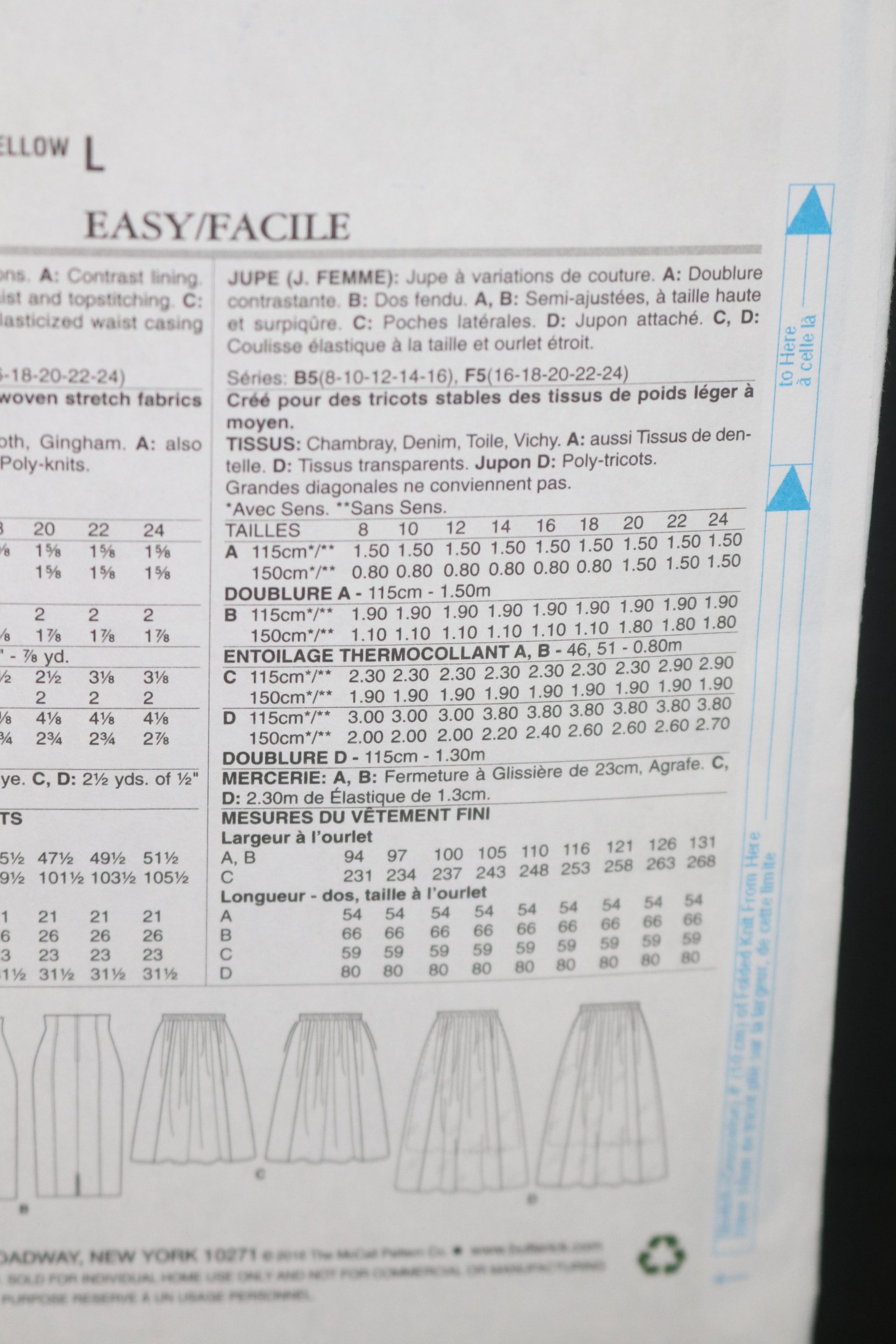 Raised-Waist, Elastic-Waist, Skirt has seam variations. A: Contrast lining. B: Back slit. A, B: Semi-fitted, raised waist, and topstitching. C: Side pockets. D: Attached slip. C, D: Elastic waist casing, and narrow hem. A, B: For moderate stretch knits only.