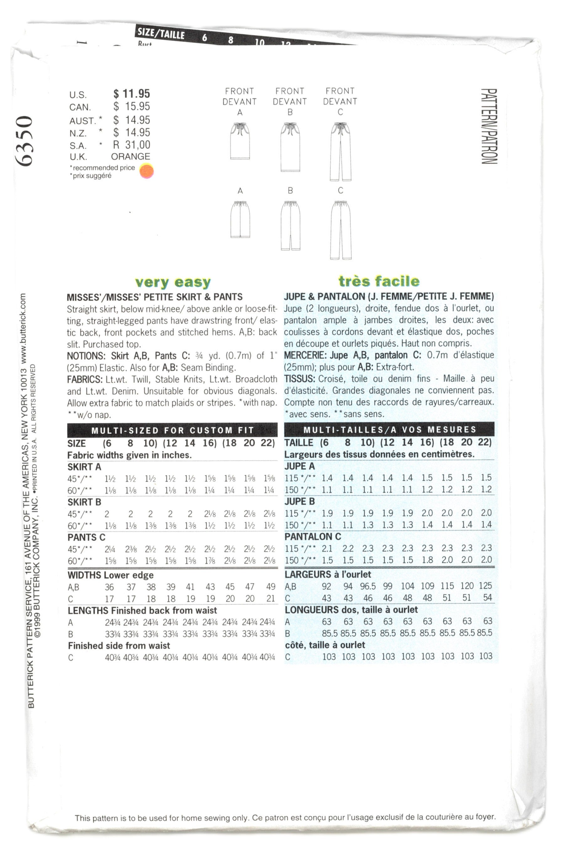 Butterick 6350 Misses Skirt and Pants Sewing Pattern - UNCUT - Size 12 14 16