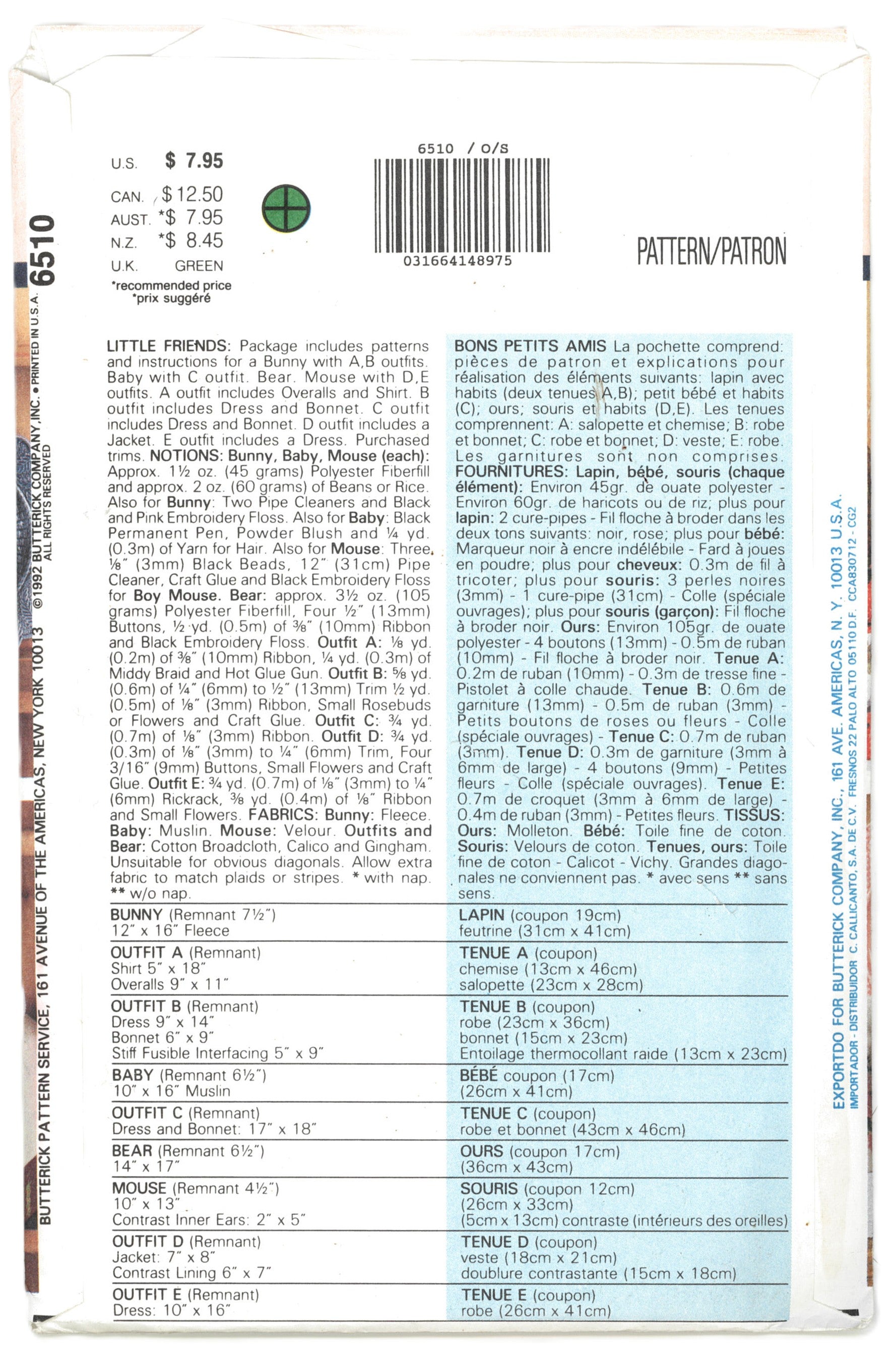Package includes patterns and instructions for a Bunny with A,B outfits. Baby with C outfit. Bear, Mouse with D,E outfits. A outfit includes Overalls and Shirt. B outfit includes Dress and Bonnet. C outfit includes Dress and Bonnet. D outfit includes a jacket. E outfit includes a Dress. Purchased trims.