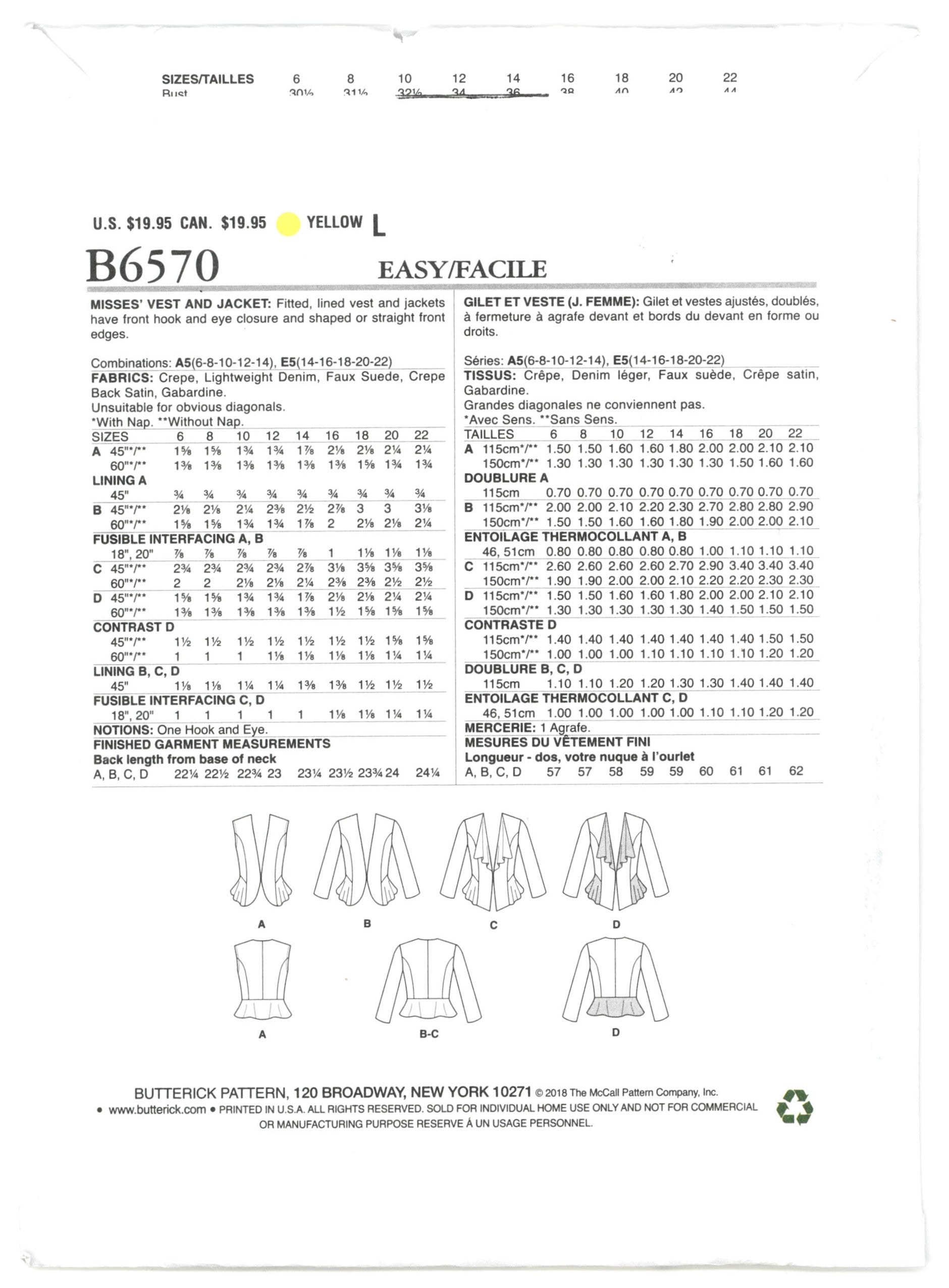 Butterick 6570 Misses Vest and Jacket Sewing Pattern