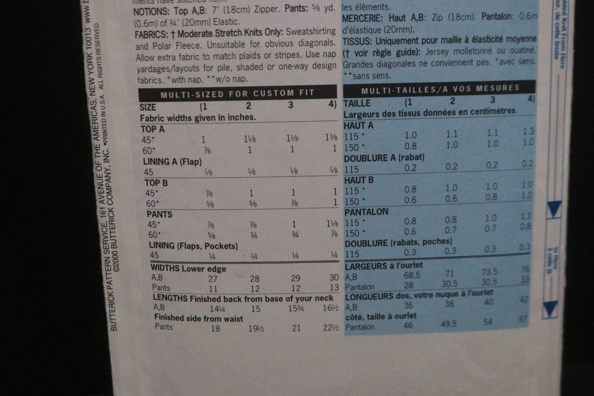 Loose fitting, pullover top has neck variations and long sleeves. A; hood (wrong side will show) and front pocket with flap. B; raised neck, Loose fitting, tapered pants, have elastic waist and pocket / flaps, All garments has stitched hem.