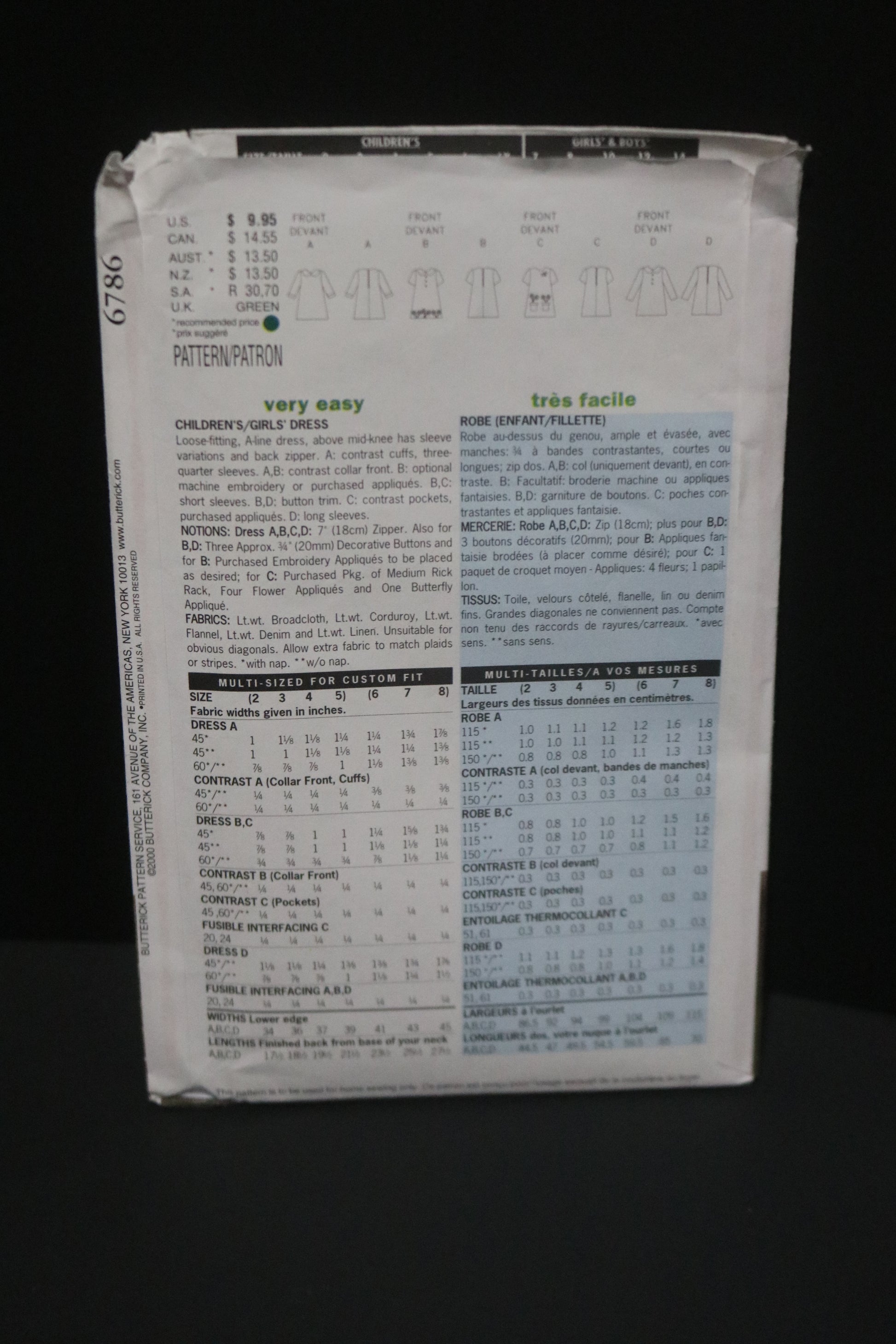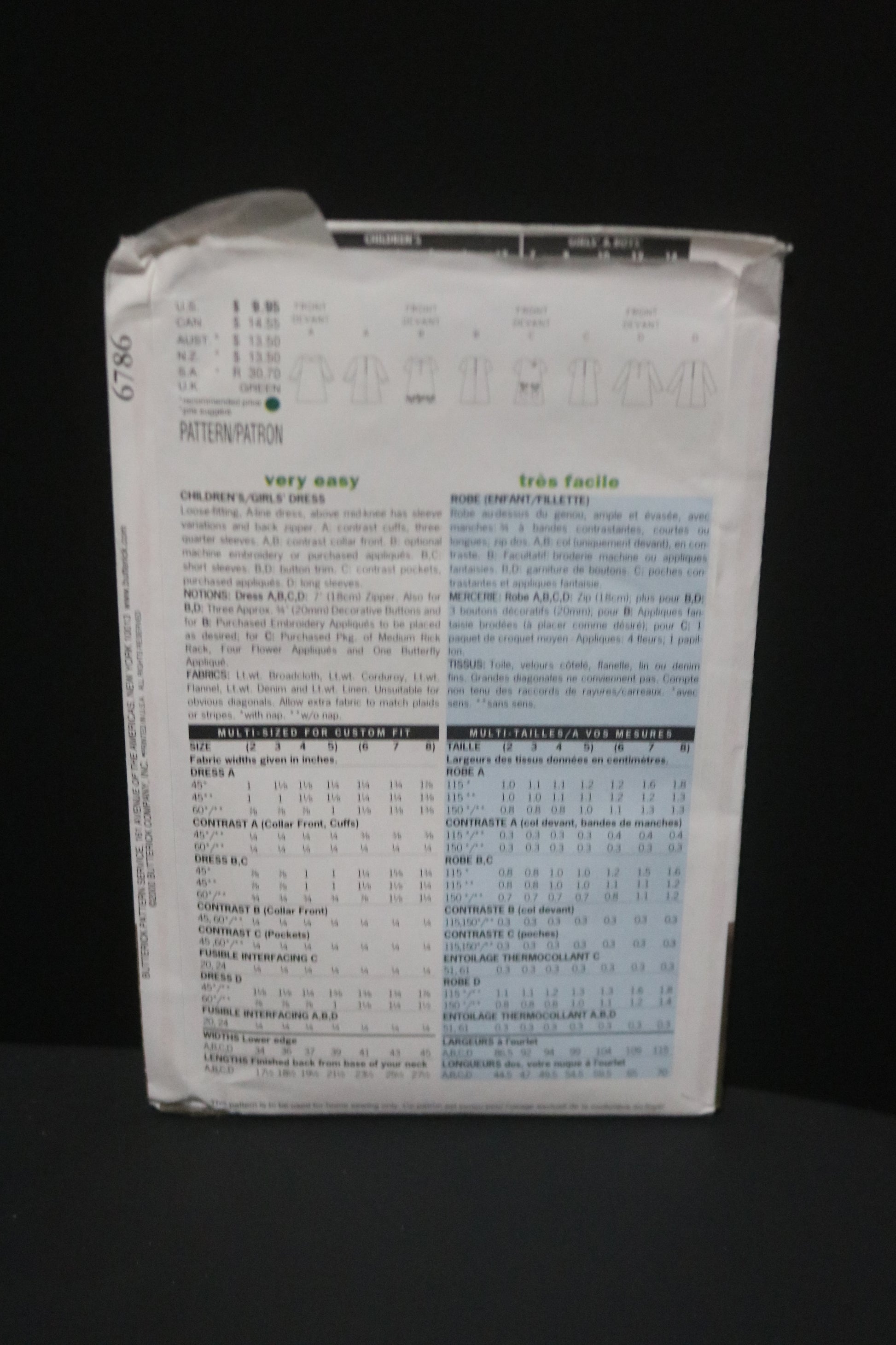 Butterick 6786 Childrens / Girls Dress Sewing Pattern