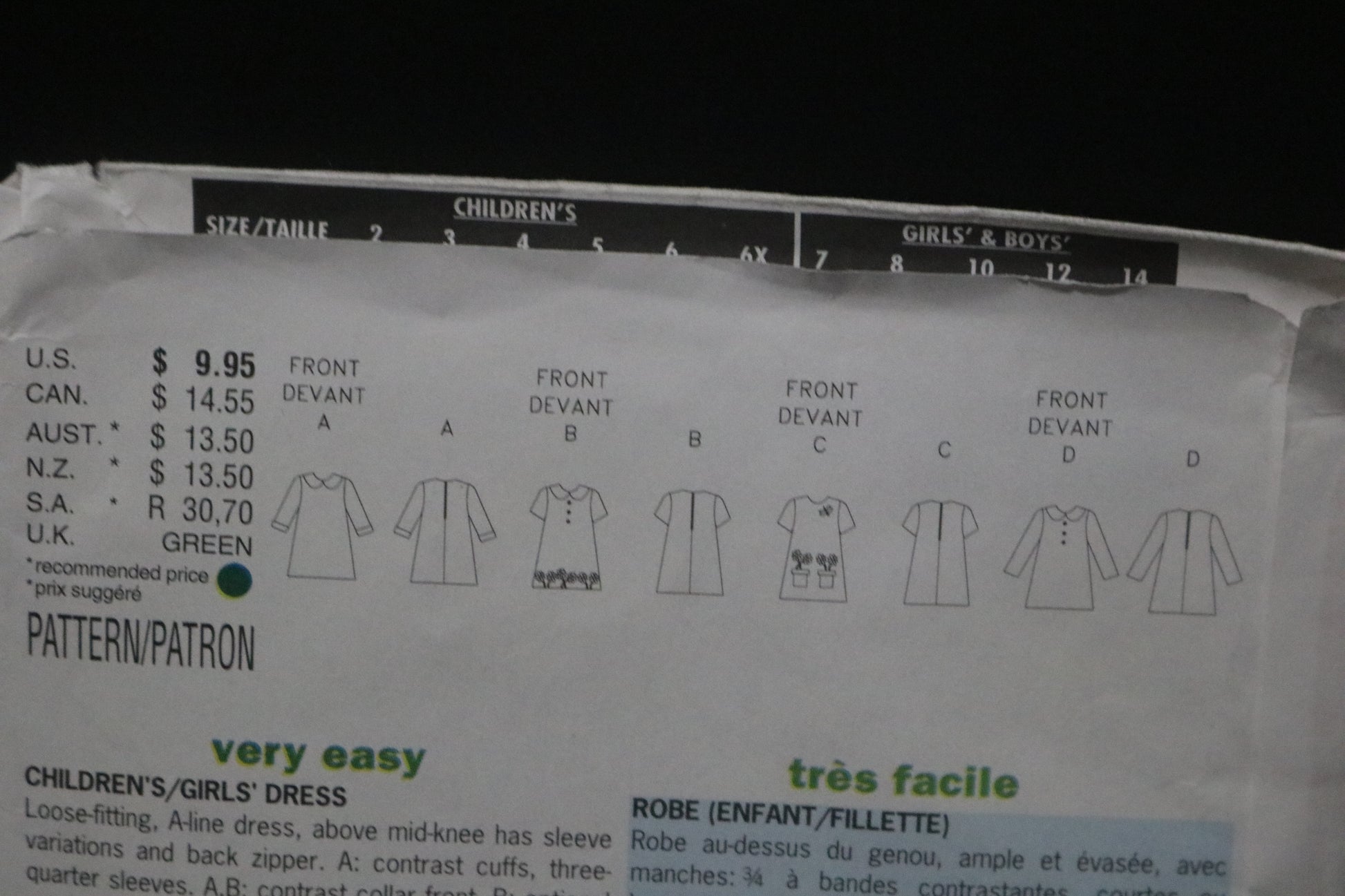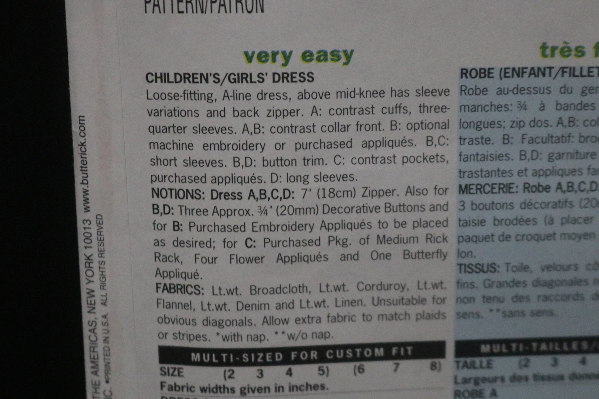 Loose Fitting A line dress, above mid knee has sleeve variations and back zipper. A: contrast cuffs, three quarter sleeves. A B contrast collar front B: optional machine embroidery or purchased machine appliques. B C short sleeves B D button trim C: contrast pockets, purchased appliques, D; long sleeves