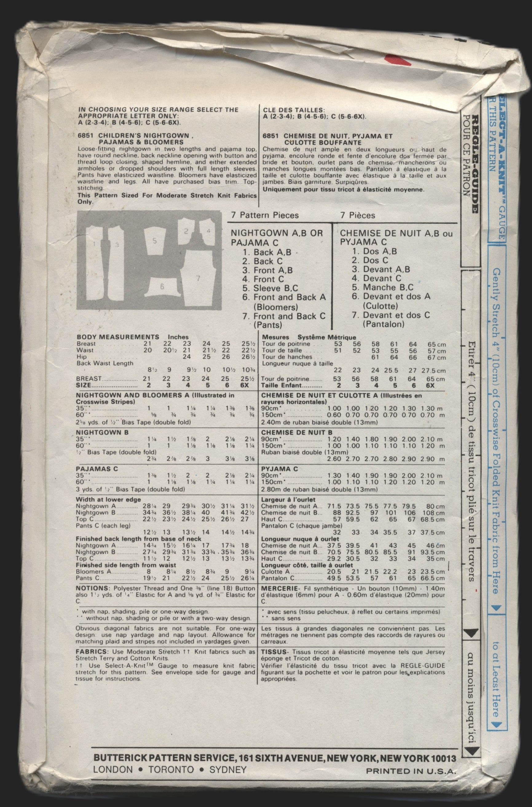 Butterick 6851 Childrens Girls Nightgown Pajamas and Bloomers Sewing Pattern