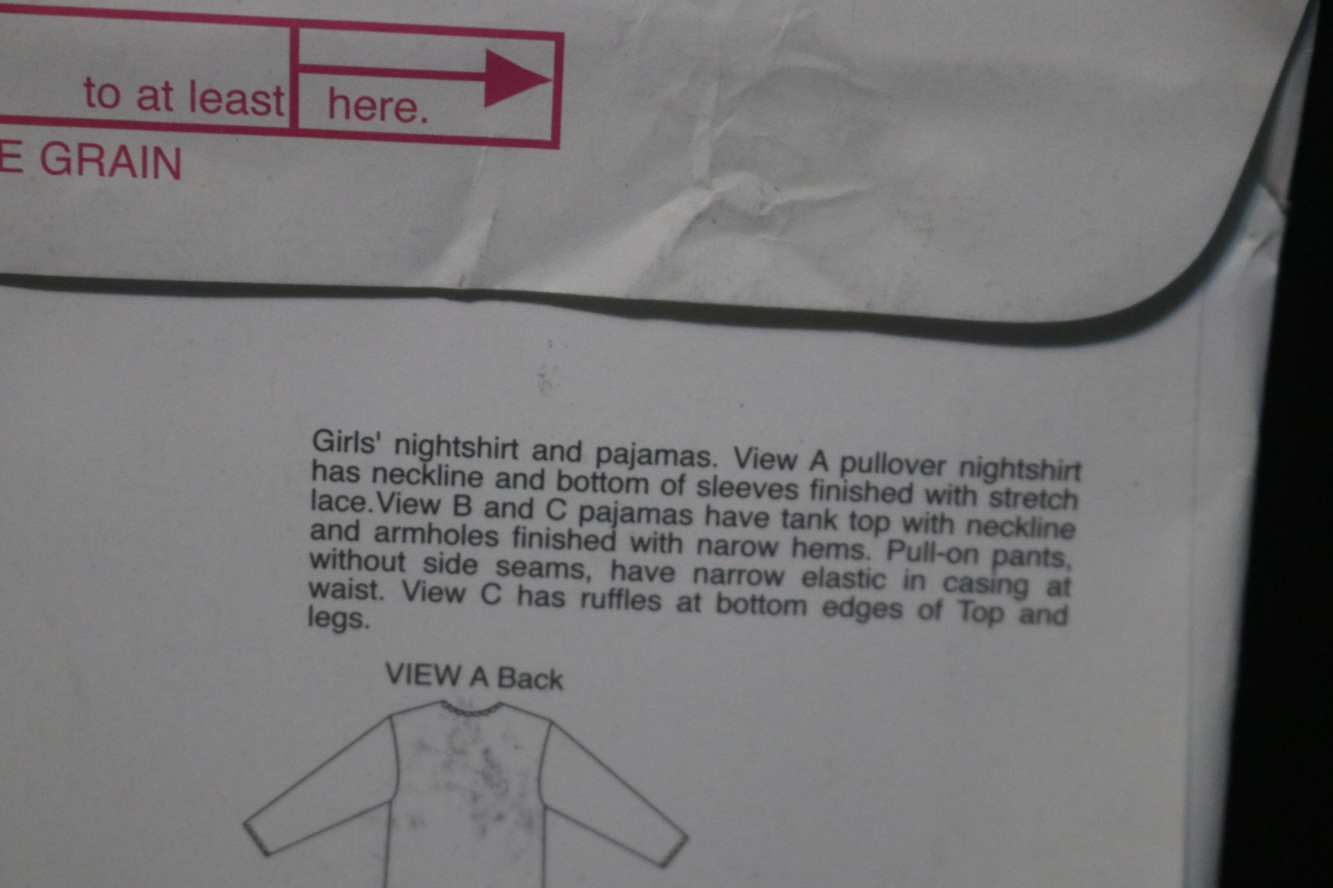 Girls' nightshirt and pajamas. The View A pullover nightshirt has a neckline and the bottom of the sleeves finished with stretch lace. The View B and C pajamas have a tank top with the neckline and armholes finished with narrow hems. The pull-on pants, without side seams, have narrow elastic in casing at the waist. View C has ruffles at the bottom edges of the Top and legs.