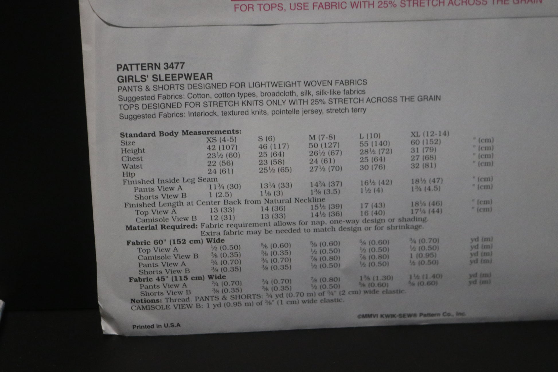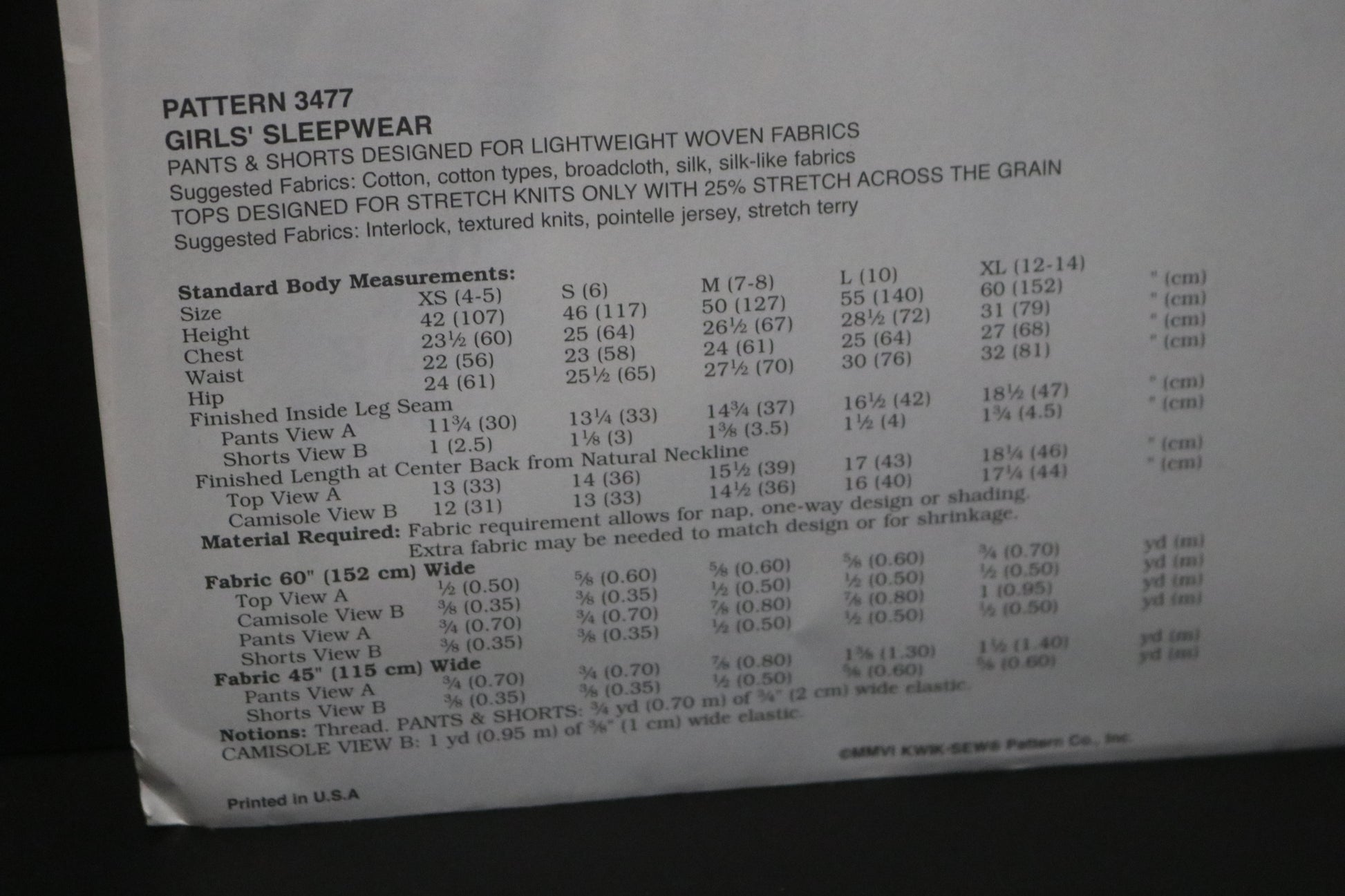 Kwik Sew 3477 Girls Sleepwear Sewing Pattern