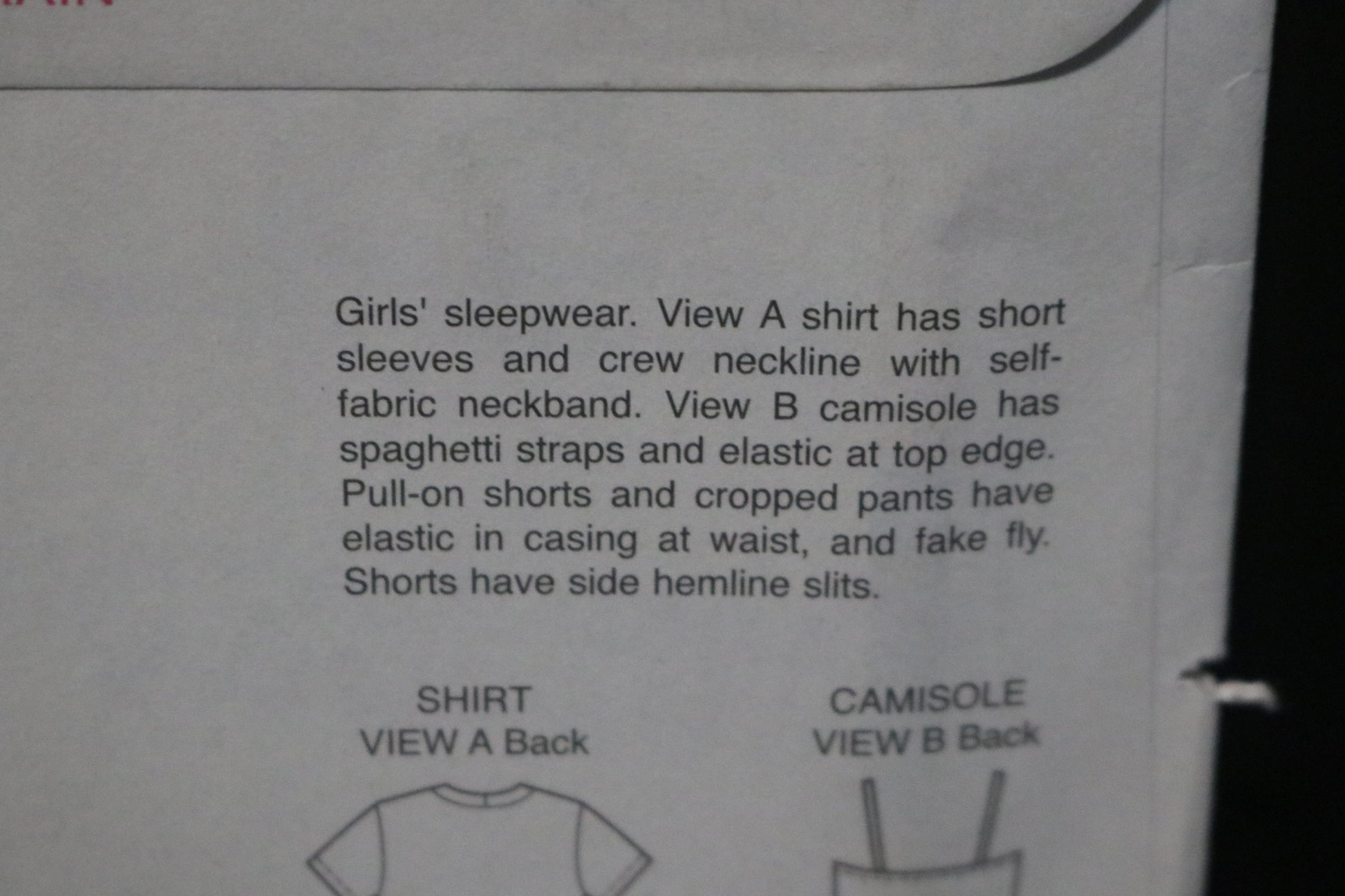 Girls’ sleepwear. View A shirt has short sleeves and crew neckline with self-fabric neckband. View B camisole has spaghetti straps and elastic at top edge. Pull-on shorts and cropped pants have elastic in casing at waist, and fake fly. Shorts have side hemline slits.