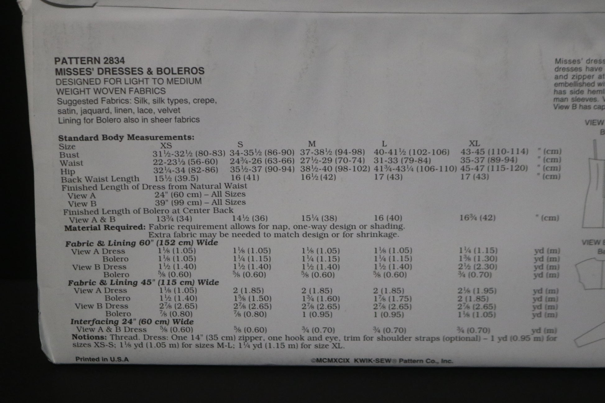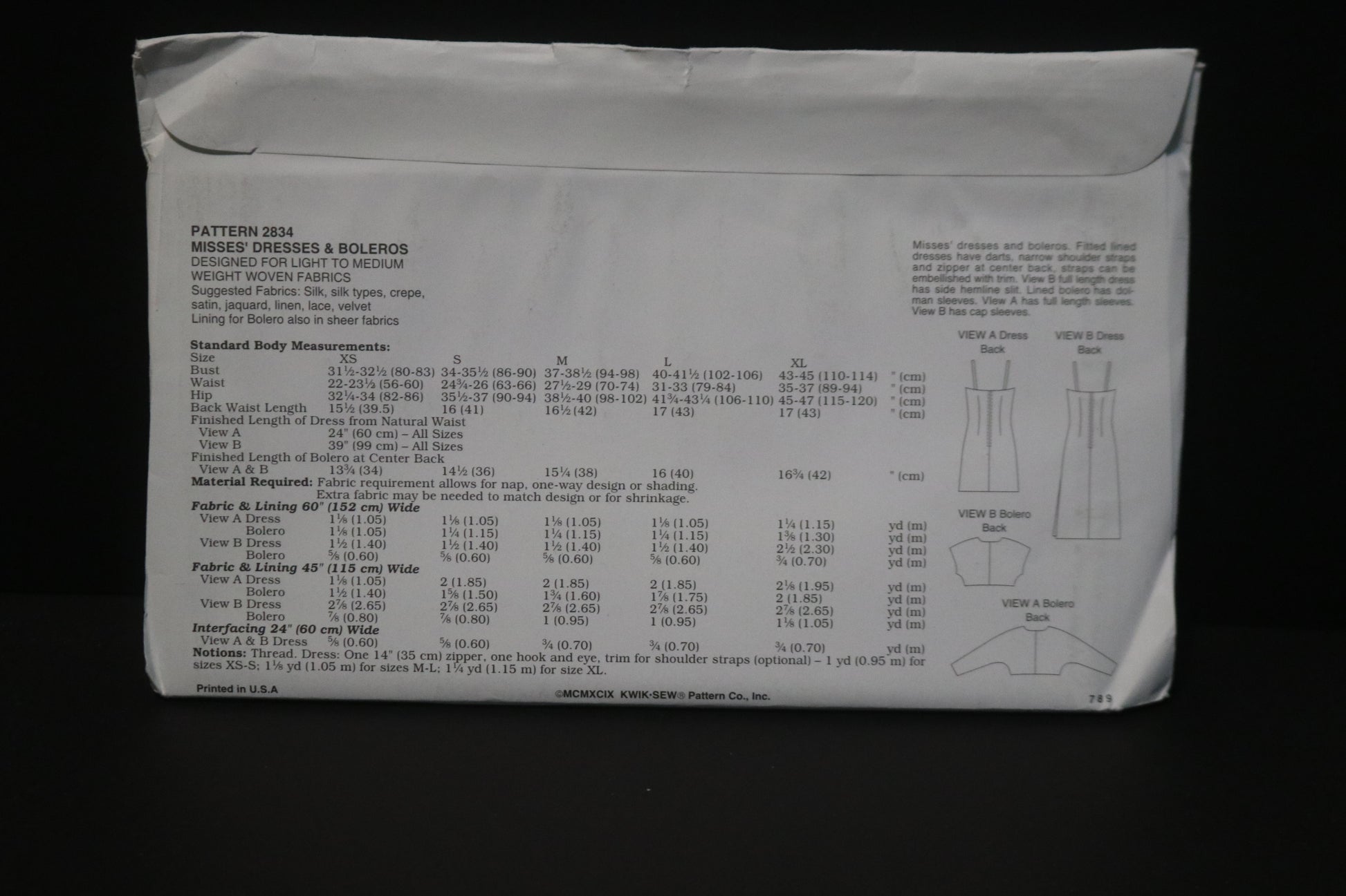 Kwik Sew 2834 Misses Dresses and Boleros Sewing Pattern - UNCUT - Size Xs S M L XL