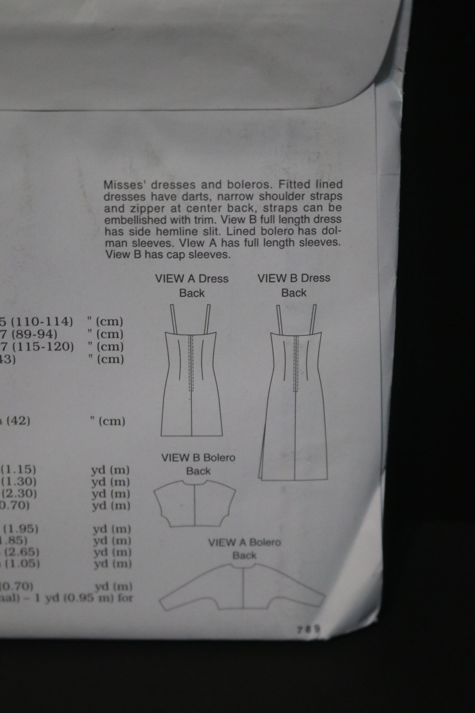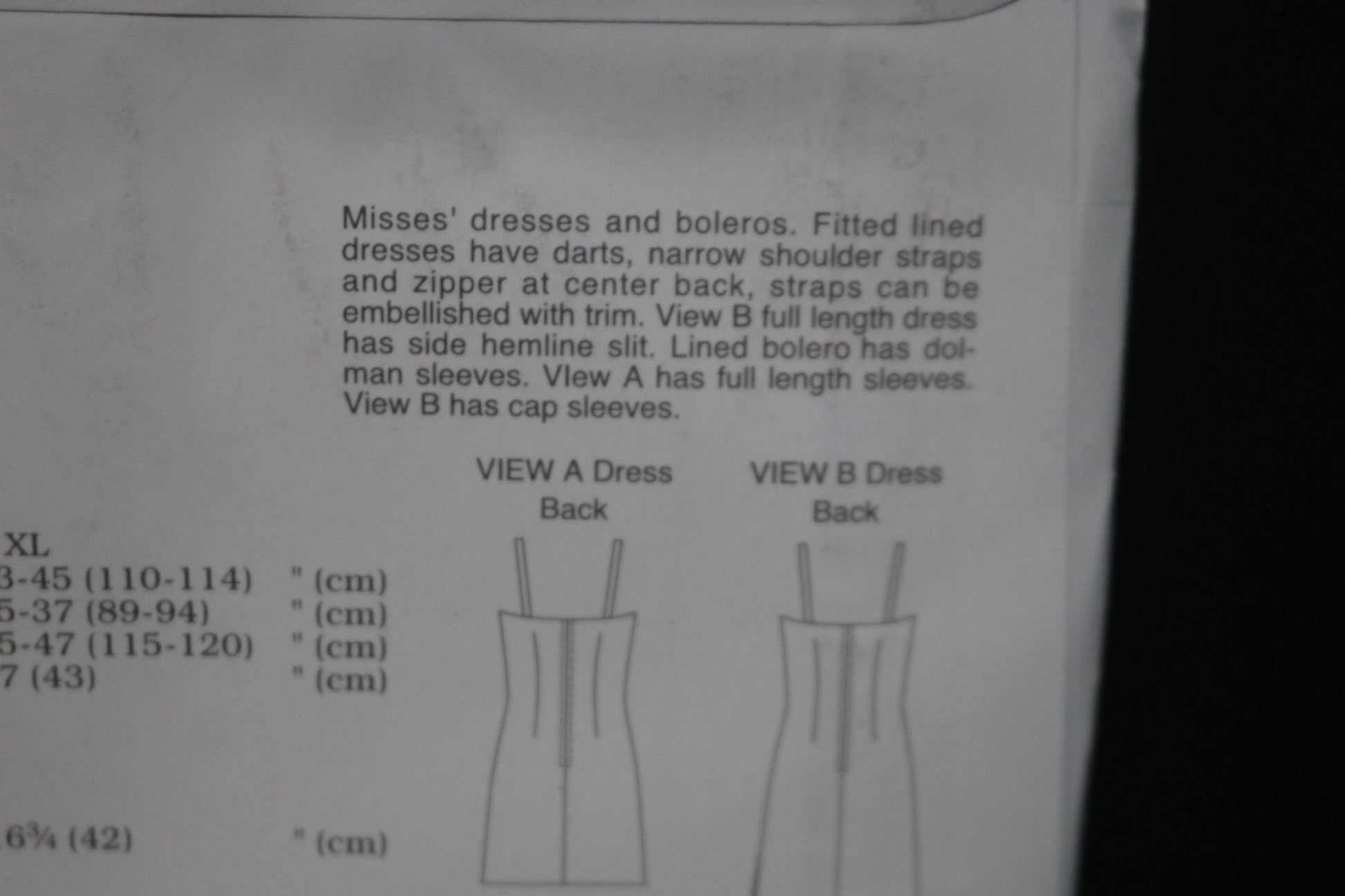 These are Misses’ fitted dresses and dolman-sleeved bolero patterns. The fitted, lined dresses have darts, narrow shoulder straps, and zipper at the center back. Straps can be embellished with trim. The View B full length dress has a side hemline slit. The lined bolero has dolman sleeves. View A has full length sleeves and View B has cap sleeves.