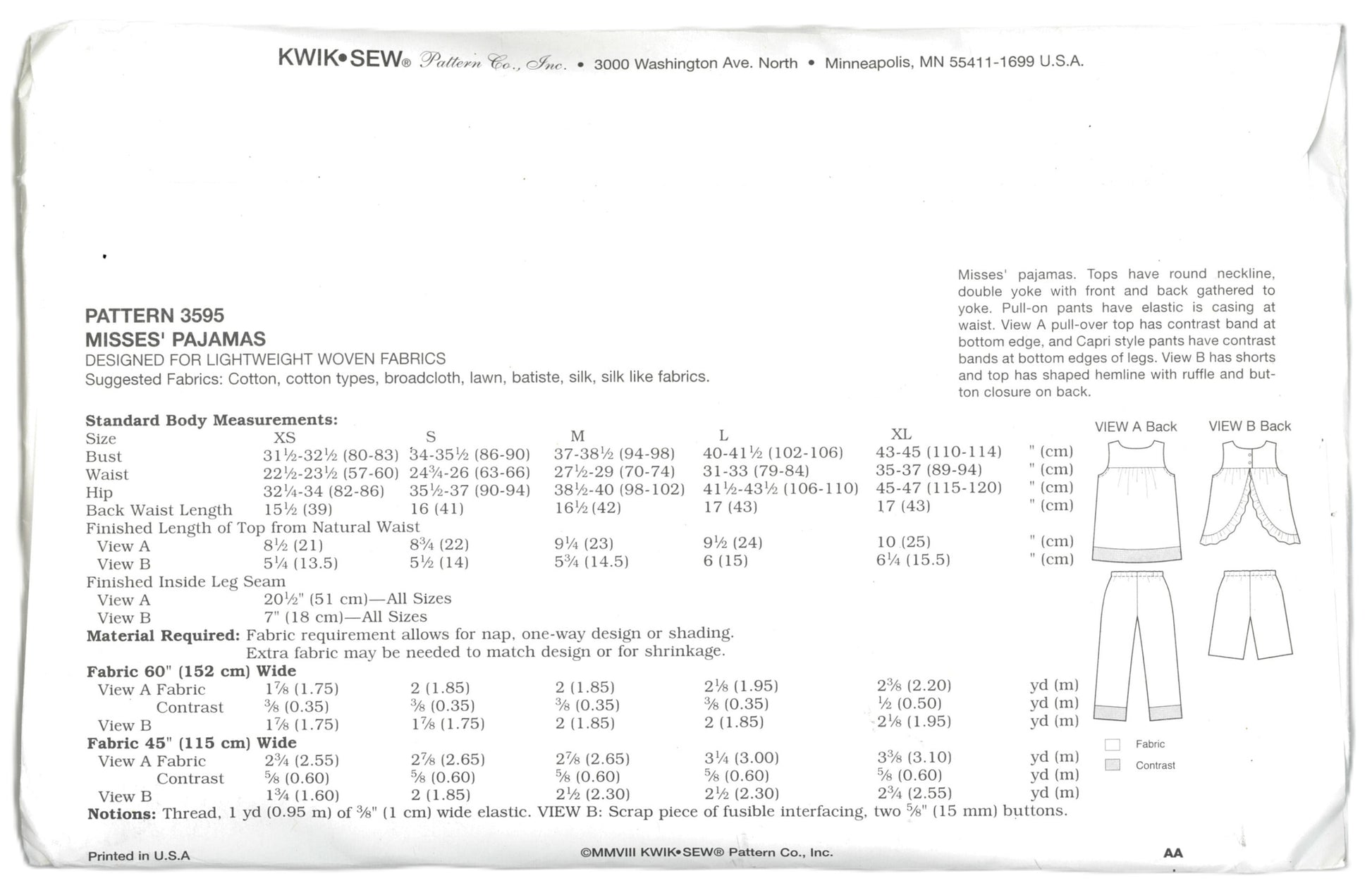 Kwik Sew 3595 Misses Pajamas Sewing Pattern