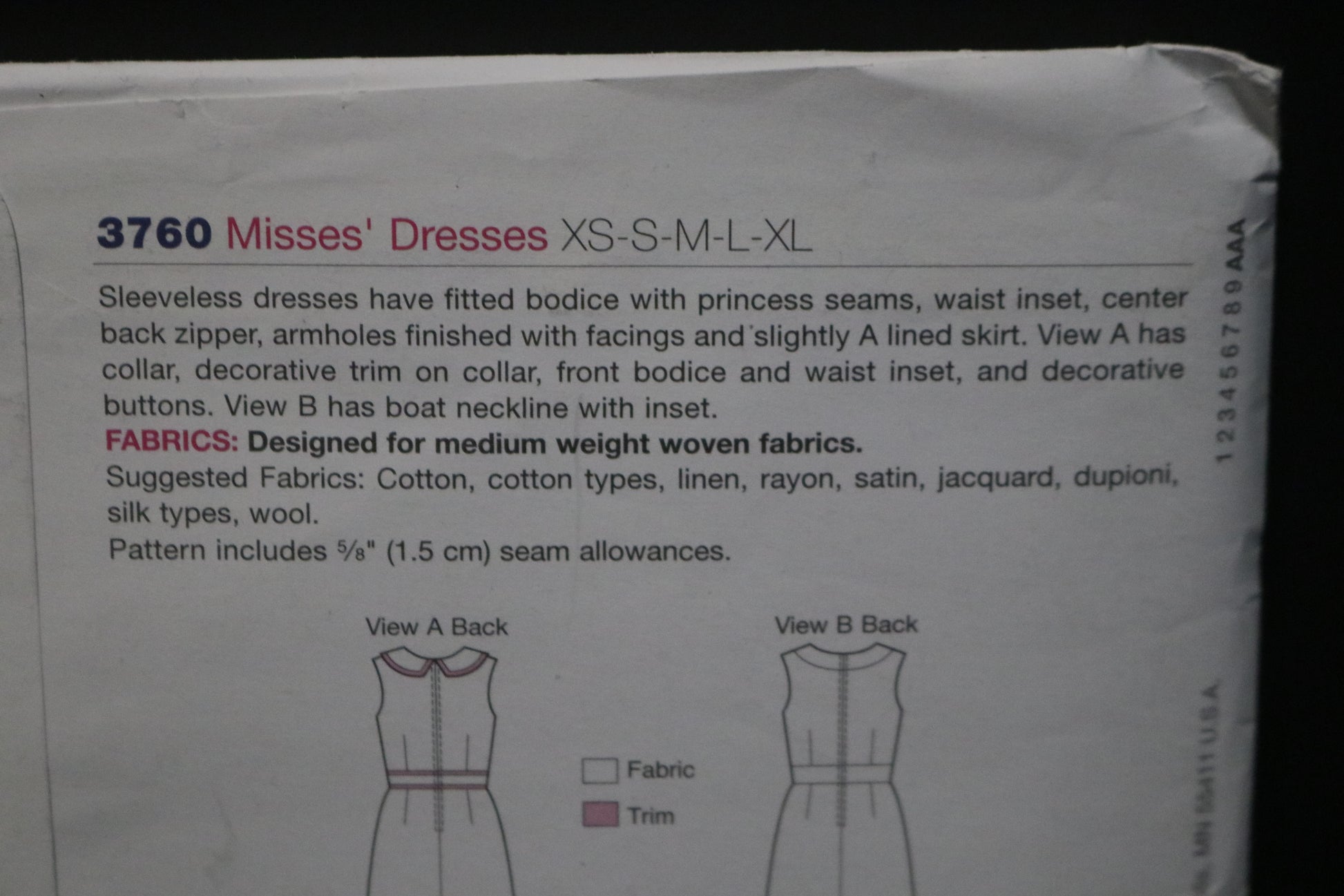 Sleeveless dresses have fitted bodice with princess seams, waist inset, center back zipper, armholes finished with facings and slightly A-lined skirt. View A has collar, decorative trim on collar, front bodice and waist inset, and decorative buttons. View B has boat neckline with inset.