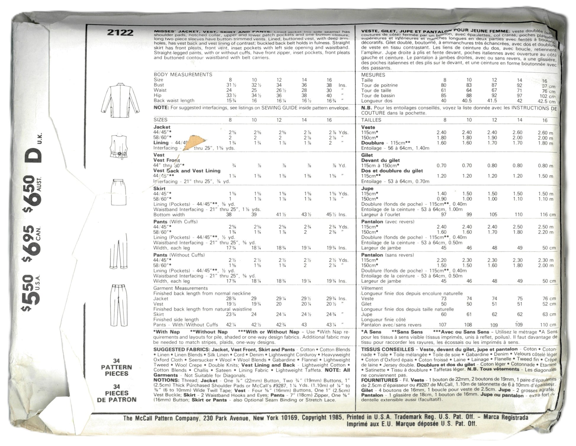 McCalls 2122 BROOKE Misses Jacket Vest Skirt and Pants Sewing Pattern