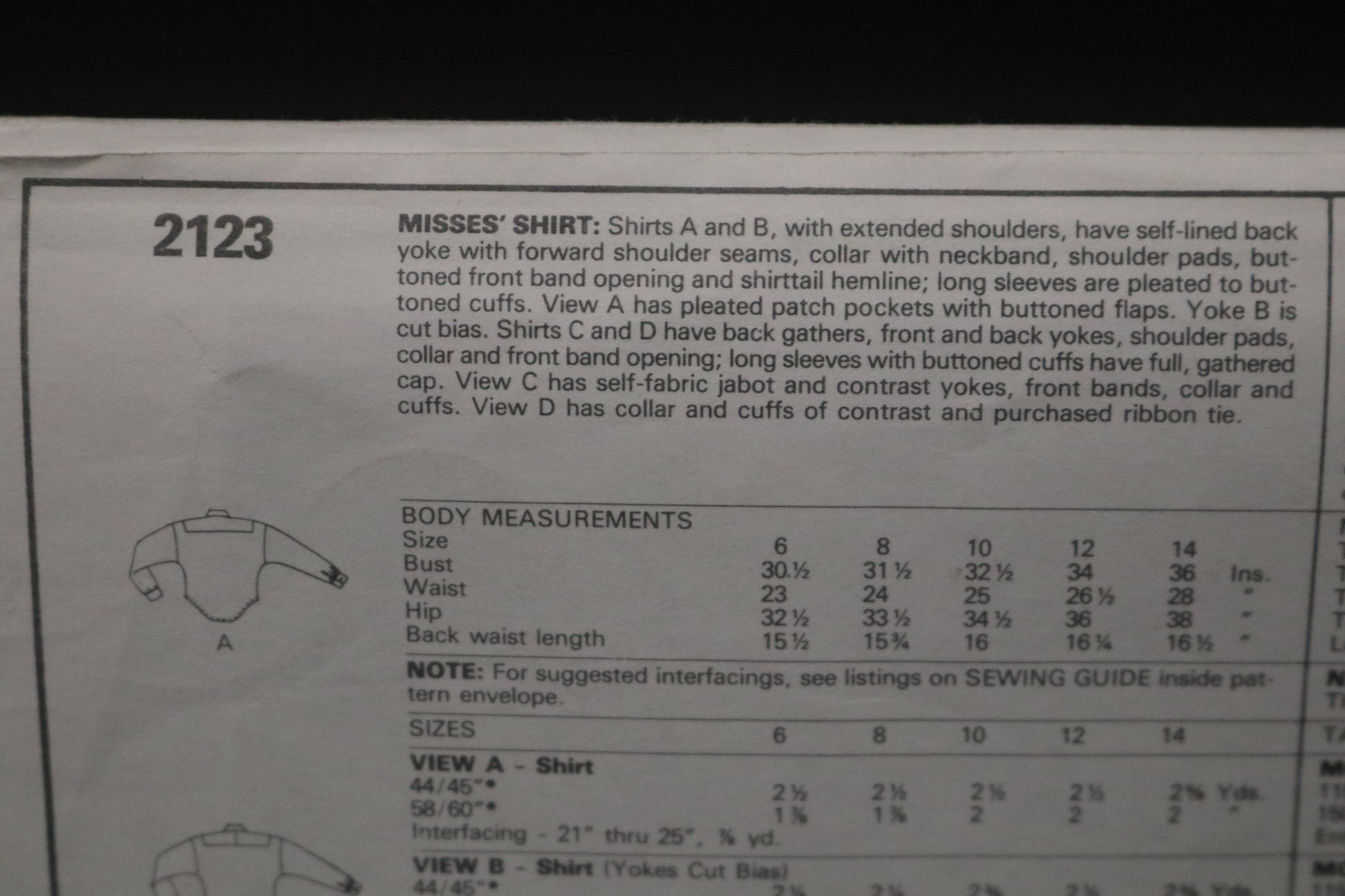 McCalls 2123 Misses Shirt Sewing Pattern UNCUT - Size 10