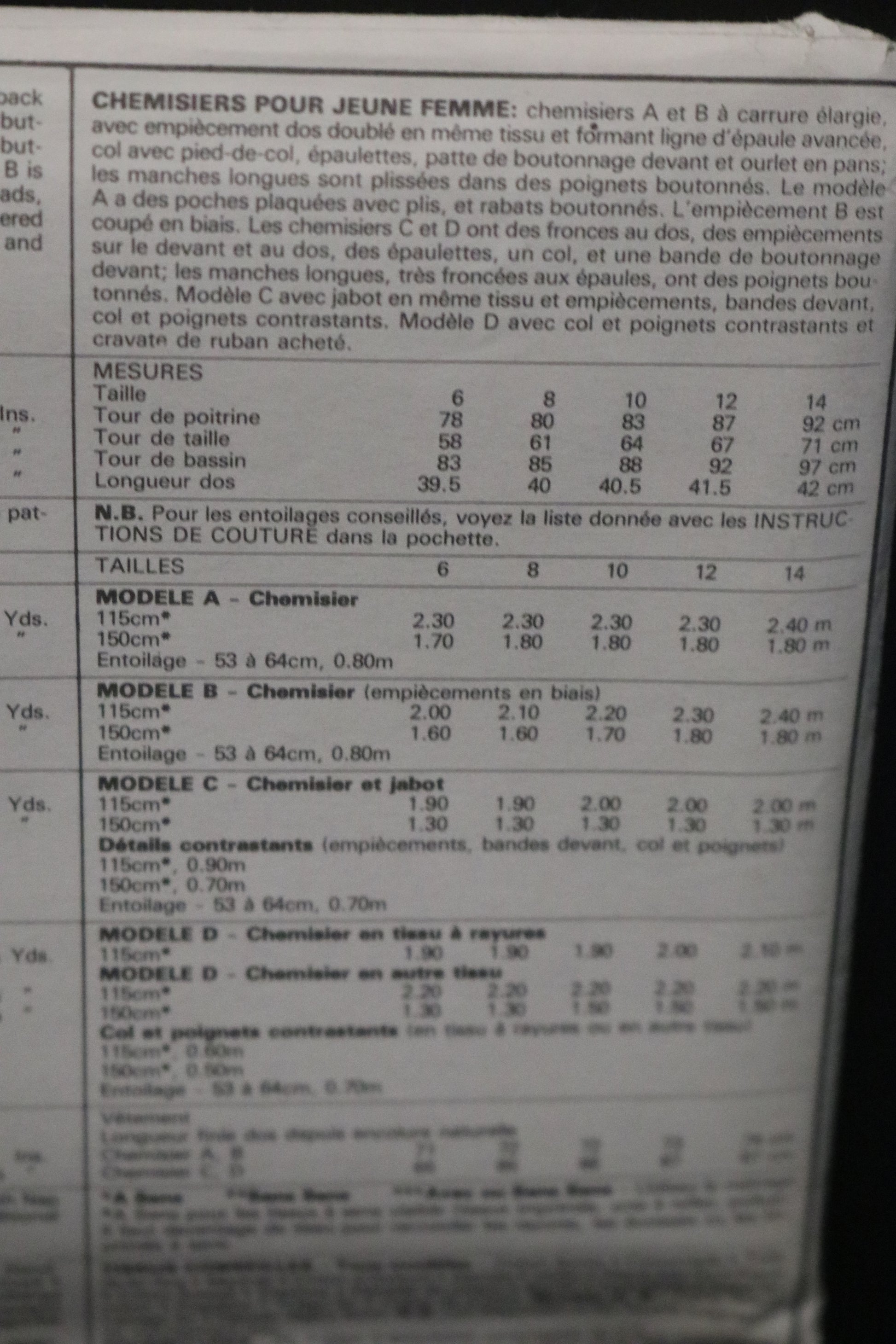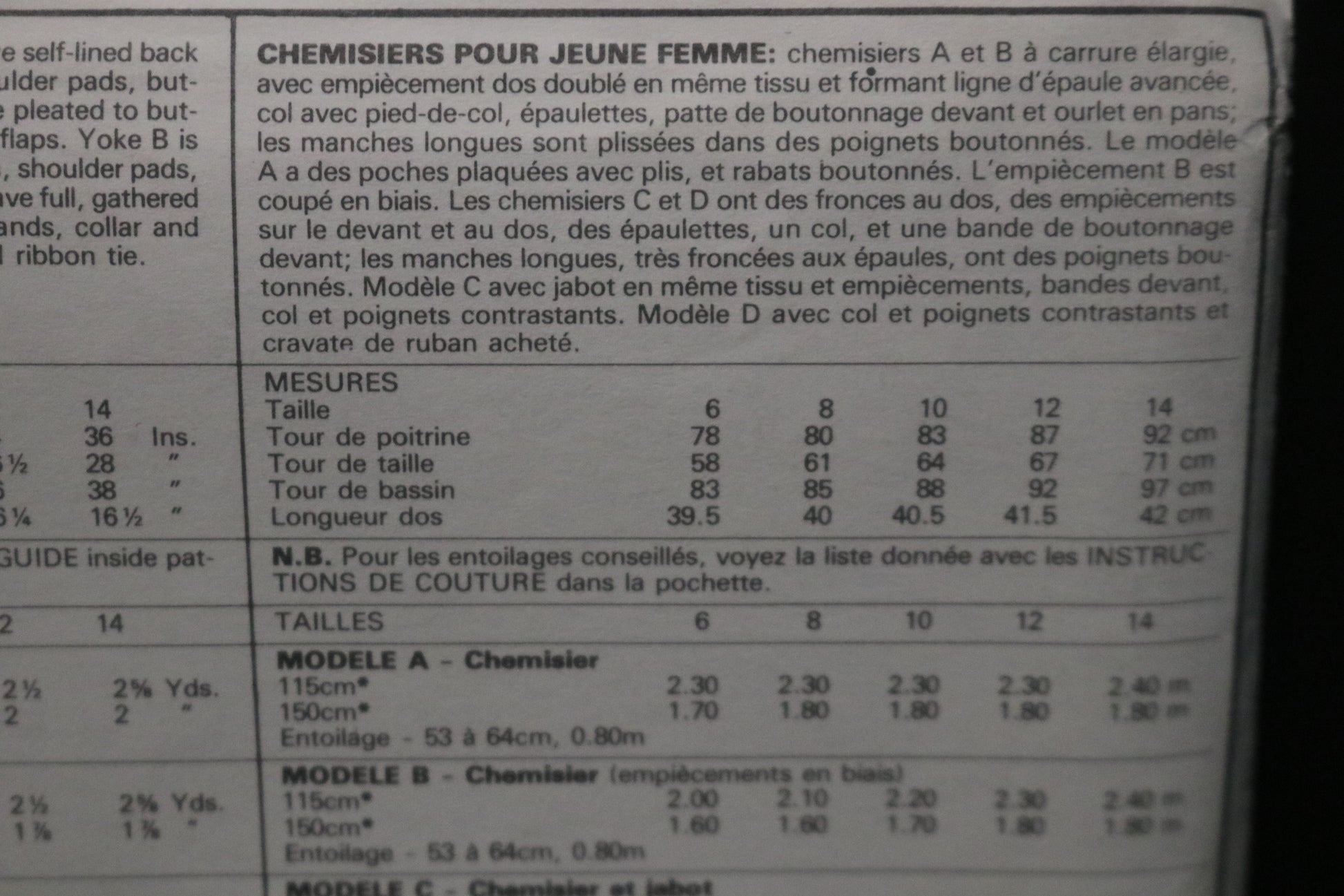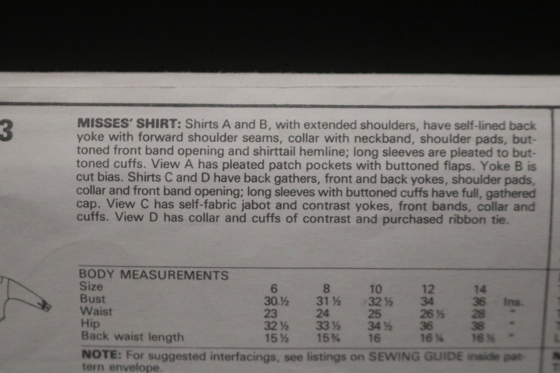 Shirts A & B with extended shoulders self lined back yoke with forward shoulder seams. Collar with neckband, shoulder pads, buttoned front band opening, Shirt tail hemline. Long sleeves are pleated to buttoned cuffs. Yoke B is cut bias. Shirt C and D have back gathers. Front and back yokes. Shoulder pads, collar and front band opening. Long sleeves have buttoned cuffs with full gathered cap. View C has self fabric jabot and contrast yokes, front bands, collar and cuffs. View D has collar and cuffs of contrast and purchased ribbon tie.